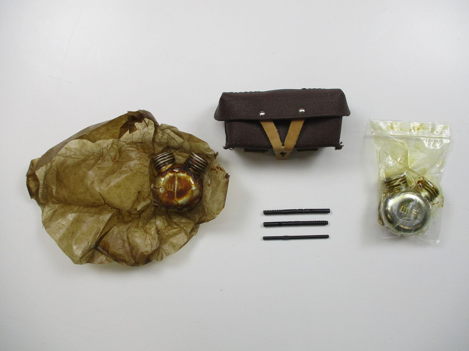 WWII / POST-WAR RUSSIAN SKS / MOSIN-NAGANT ACCESSORIES LOT, LOT INCLUDES; (1) SKS DOUBLE AMMO POUCH, VARIOUS MARKINGS, MOSIN NAGANT TOOLS; (2) JAGS, ETC. SEE PHOTOS.