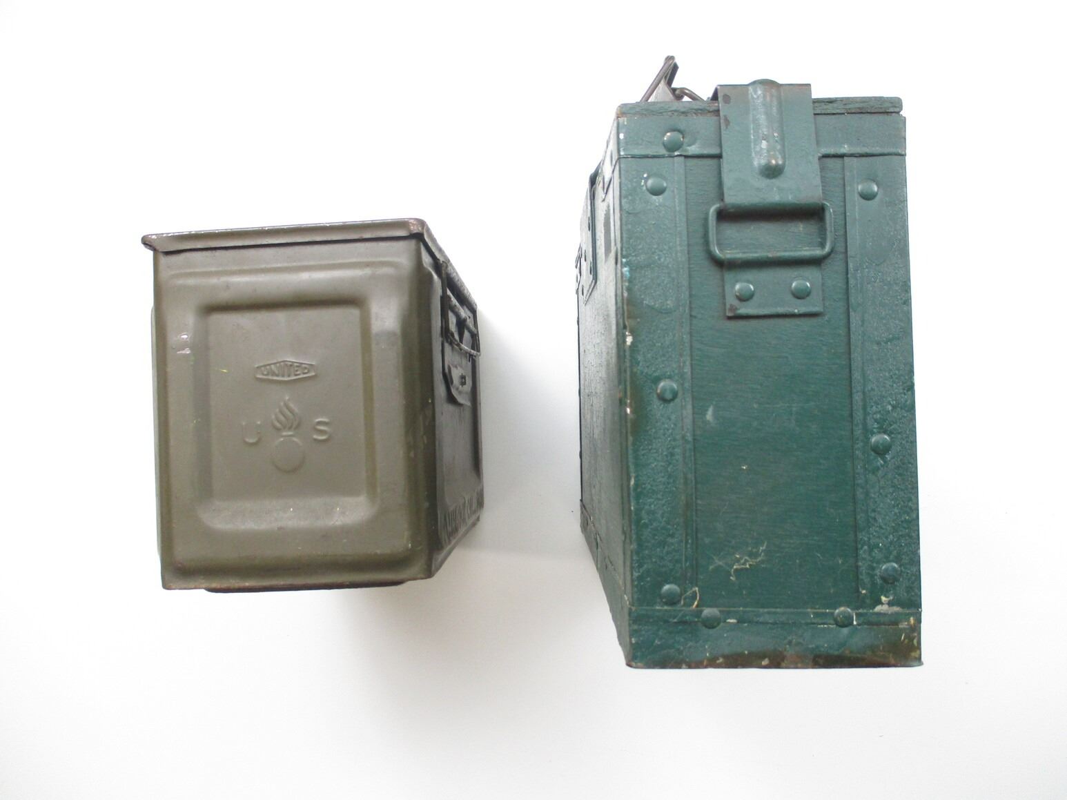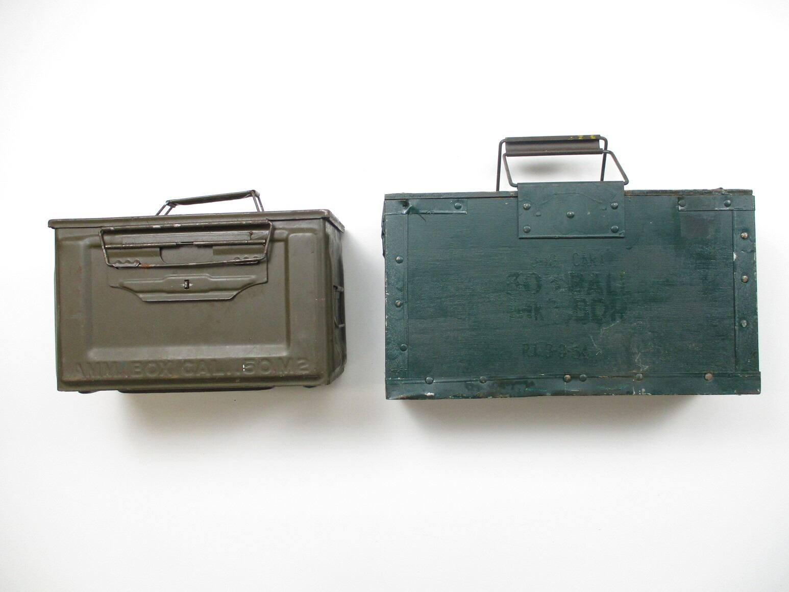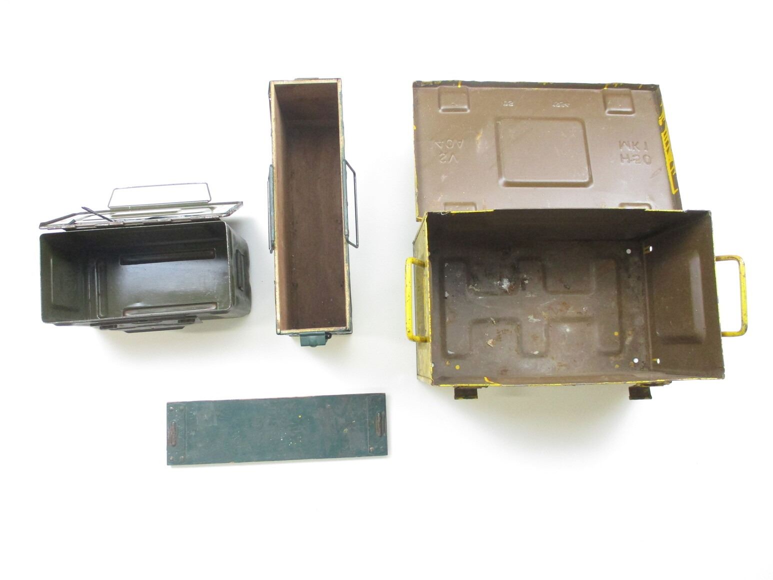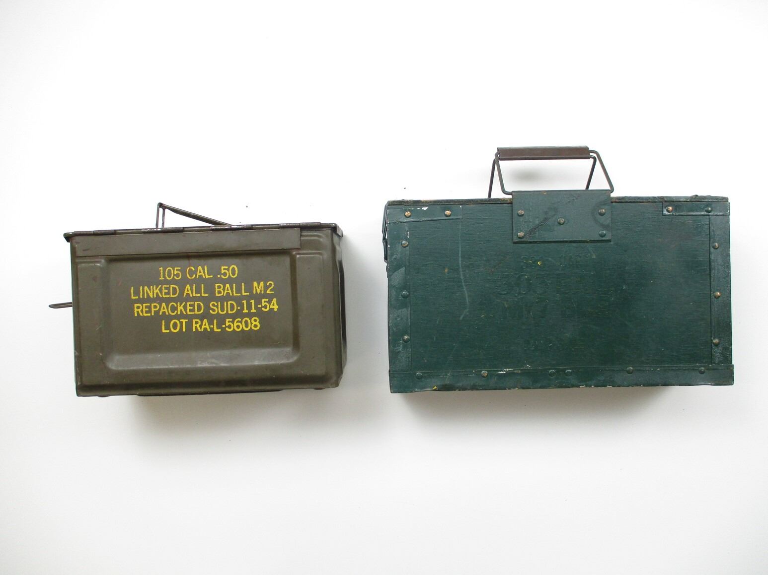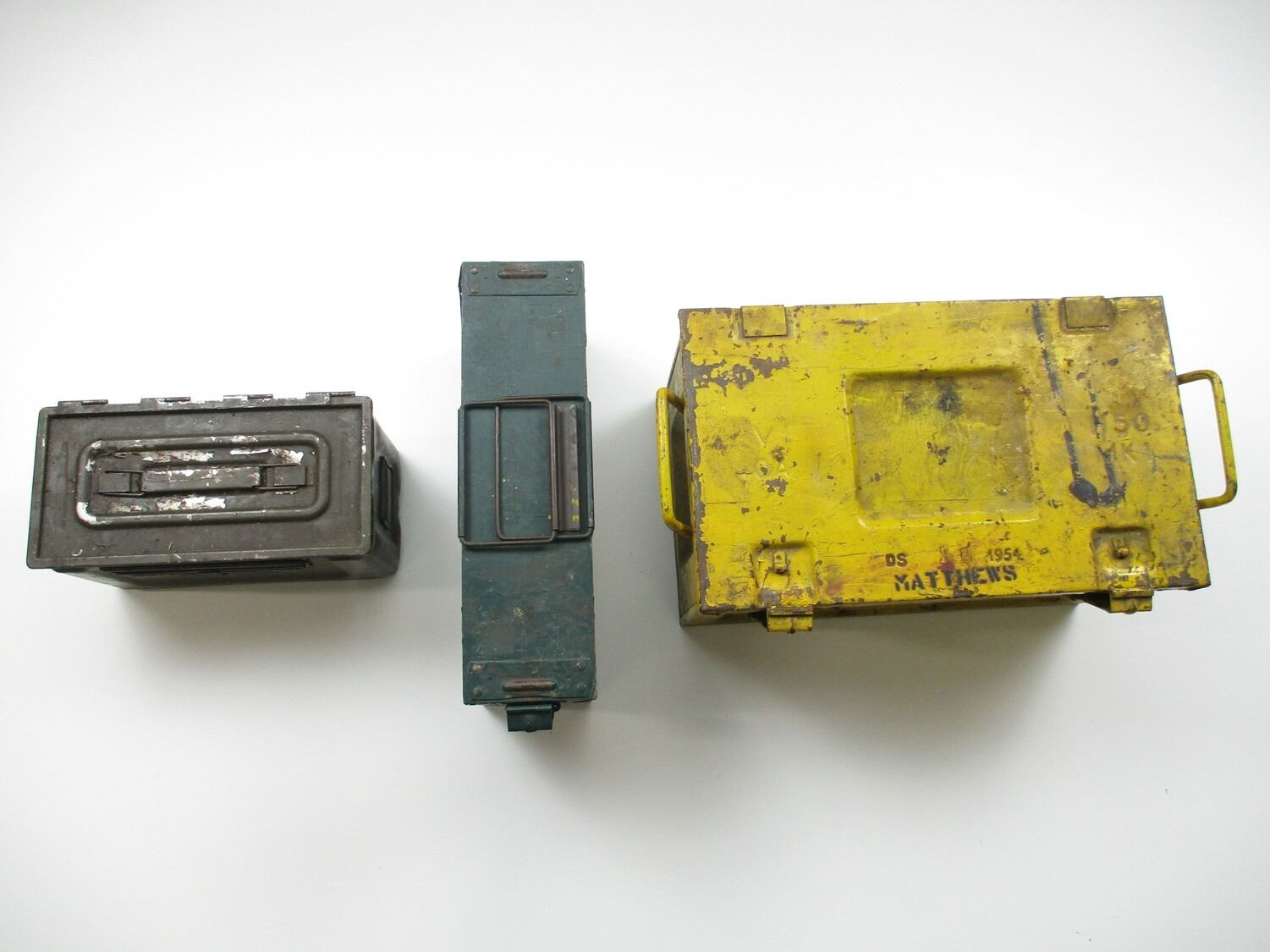 ASSORTED AMMO CRATE LOT, LOT INCLUDES; (1) WOOD & METAL CRATE WITH METAL HANDLES & LATCHES, GREEN PAINTED, MARKED: "300 CART, 303 BALL, MK7 BDR, R.L.3-3-54", APPROX. 16" X 4 3/4" X 9 1/2", (1) METAL CRATE, YELLOW PAINT, MARKED: "50 MK I", "DS 1954" & OTHER MARKINGS, APPROX. 18" X 11" X 10 1/2" & (1) BROWN METAL AMMO TIN, VARIOUS MARKINGS, APPROX. 12 1/4" X 6 1/8" X 7 5/8". SEE PHOTOS.