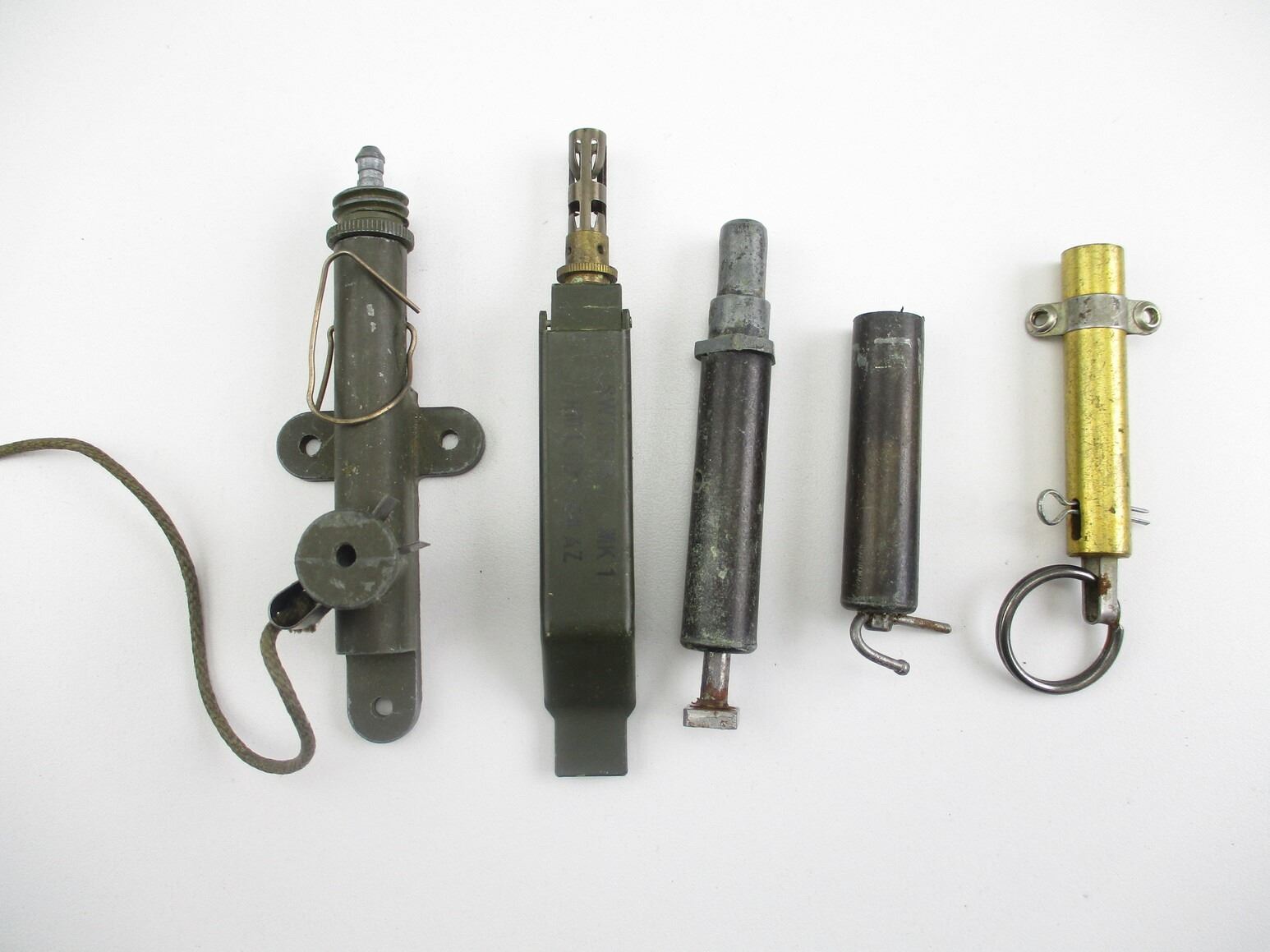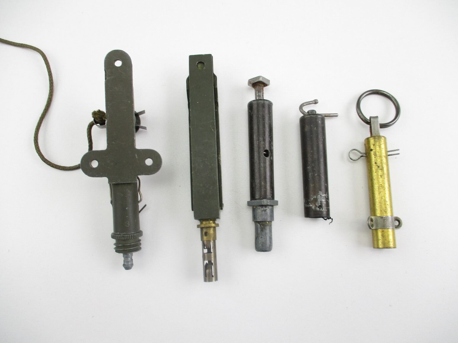 MILITARY FUZE IGNITOR INERT LOT, (5) VARIOUS TYPES, BRASS / ALLOY / STEEL / GREEN PAINTED, FOUR UN-MARKED, ONE MARKED: "SWT N06, MKI, RM LTD 4 64 AZ". SEE PHOTOS., THESE CAN ONLY BE SHIPPED BY CORPORATE UPS COVERED AREAS. PLEASE GO TO LOT 0 IN THE AMMUNITION SESSION, TO SEE IF YOUR POSTAL CODE IS A VALID AREA. THESE CAN NOT BE SHIPPED TO THE USA, OR INTERNATIONALLY. NO REFUNDS WILL BE ISSUED, OR BIDS RETRACTED.
