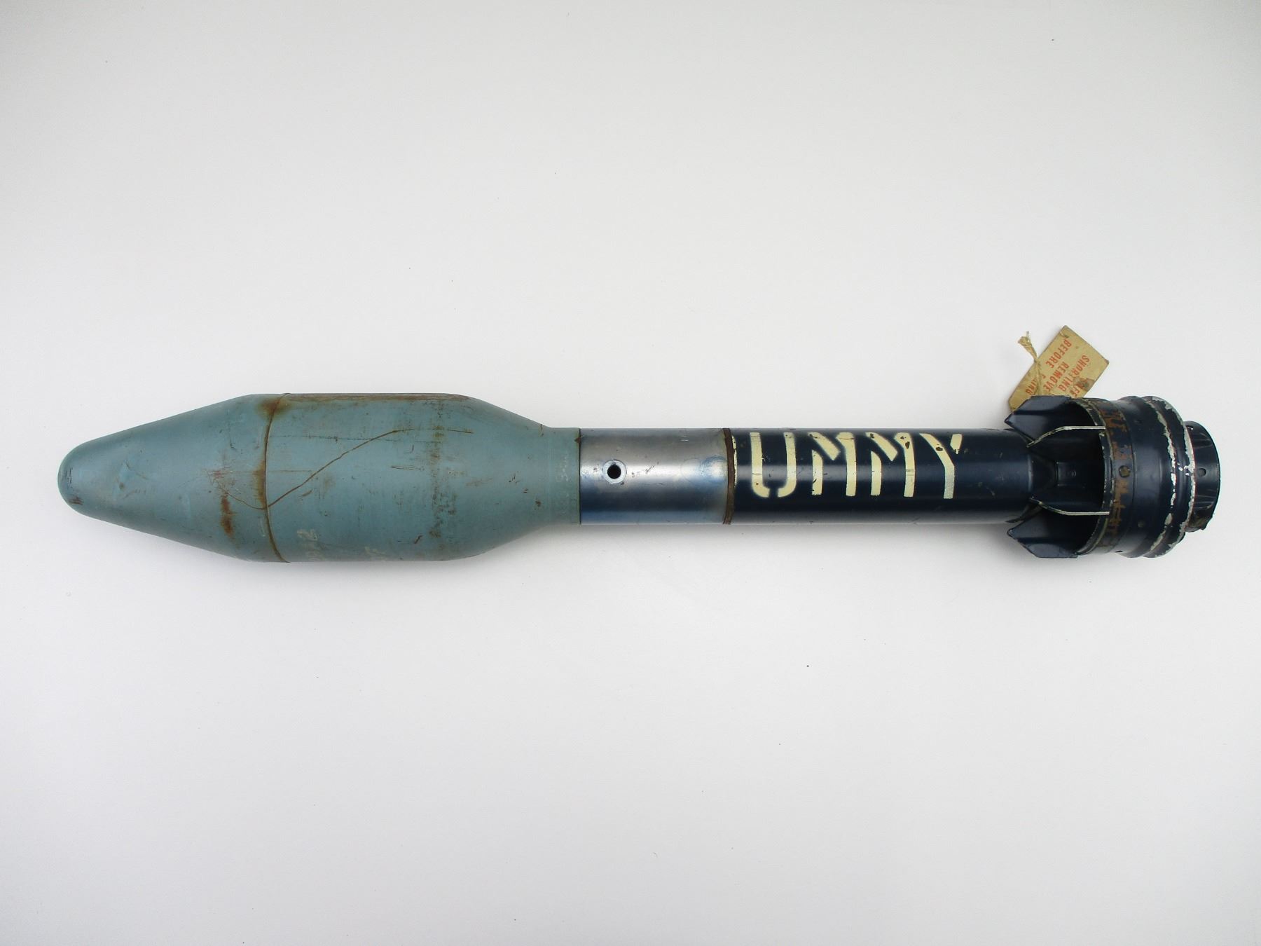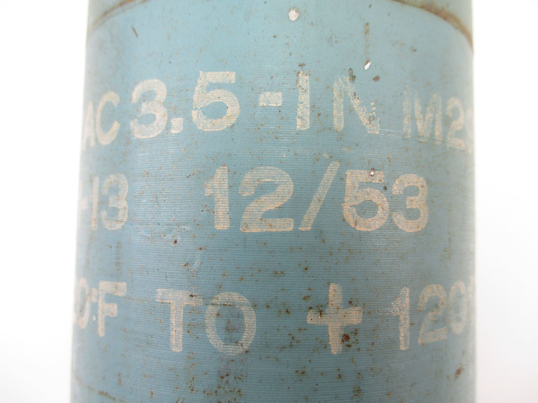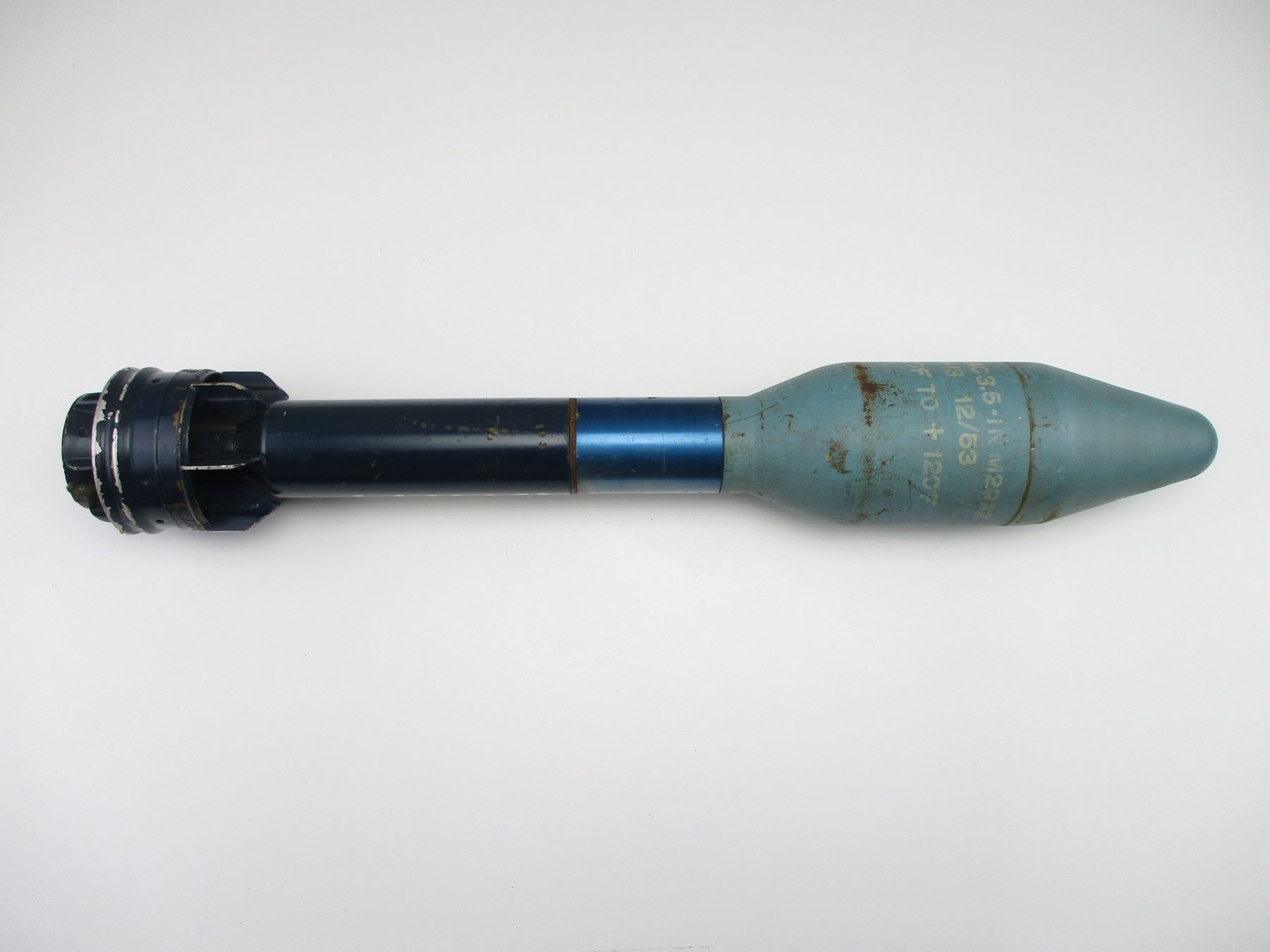 CANADIAN 3.5" PRACTICE ROCKET INERT, (1) FITS 3.5" SUPER BAZOOKA, BLUE PAINTED, MARKED: "ROCKET PRAC 3.5-IN M29A2, "A" INSIDE A "C" (CANADIAN ARSENAL), 1-13, 12/53" & OTHER MARKINGS, OAL APPROX. 23.5". SEE PHOTOS., THESE CAN ONLY BE SHIPPED BY CORPORATE UPS COVERED AREAS. PLEASE GO TO LOT 0 IN THE AMMUNITION SESSION, TO SEE IF YOUR POSTAL CODE IS A VALID AREA. THESE CAN NOT BE SHIPPED TO THE USA, OR INTERNATIONALLY. NO REFUNDS WILL BE ISSUED, OR BIDS RETRACTED.