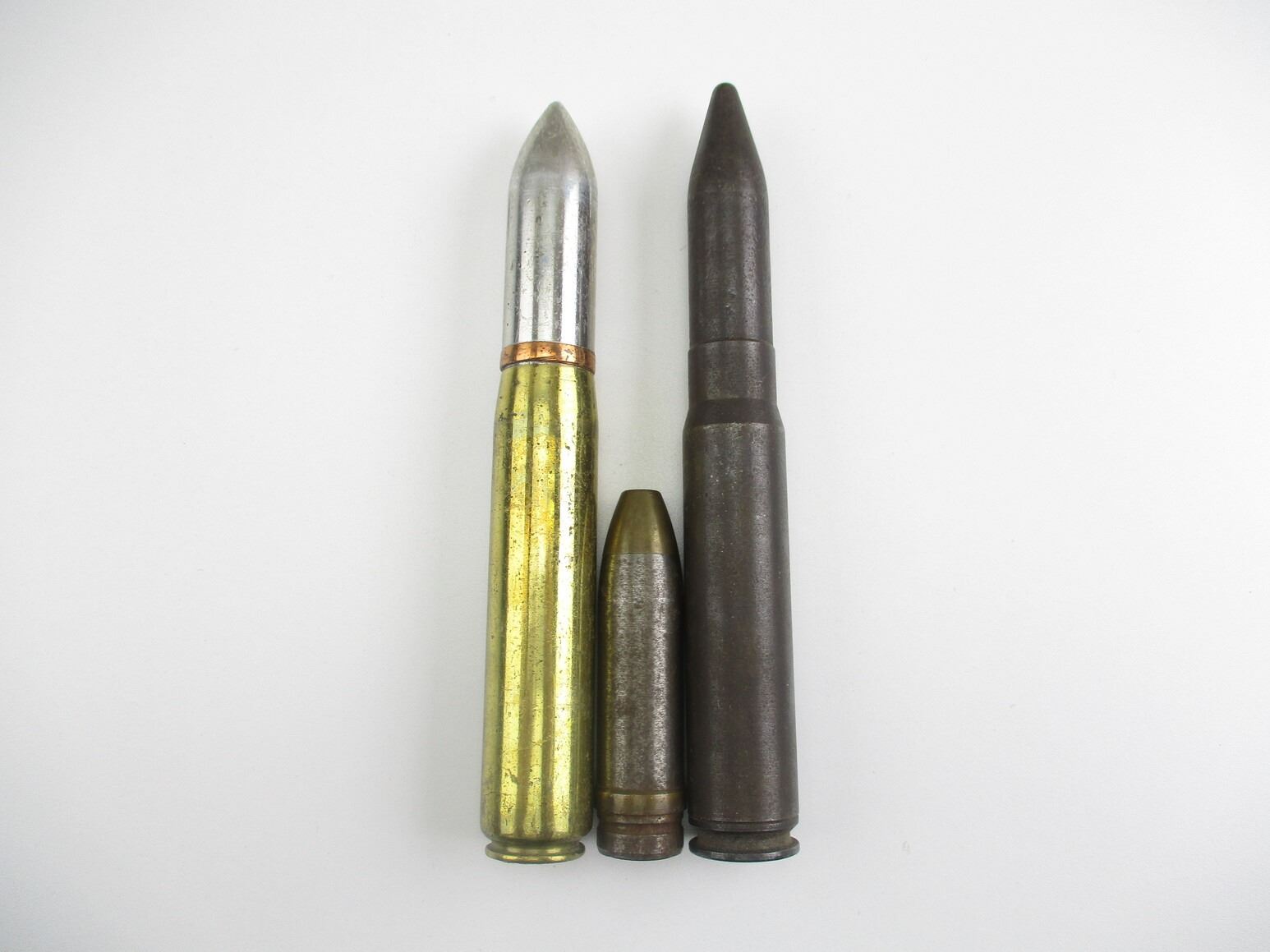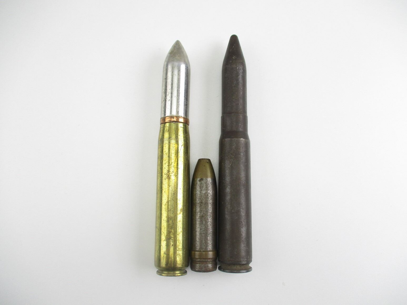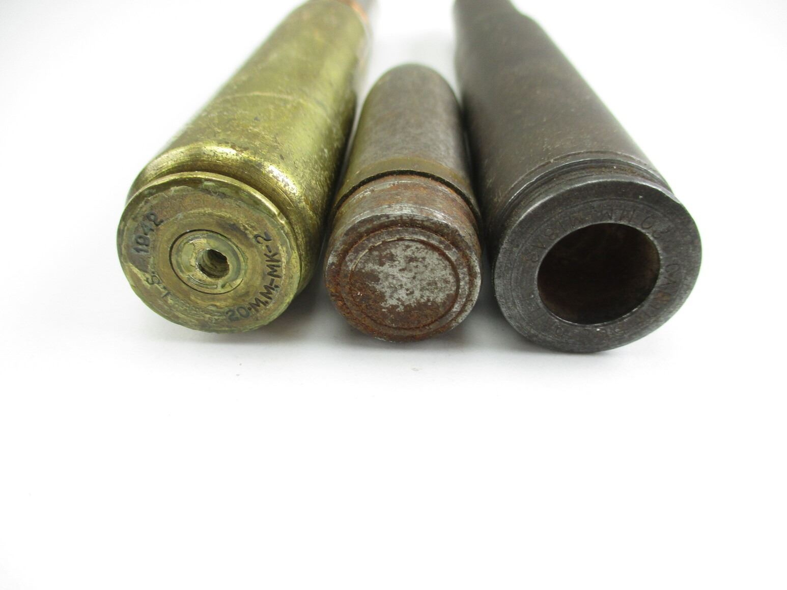ASSORTED 20MM ROUND INERT LOT, LOT INCLUDES; (1) 20MM PROJECTILE, APPROX. 0.75" DIA. & OAL APPROX. 3.25", (1) 20MM MK-2 WITH PROJECTILE, DATED "1942", APPROX. 7/8" DIA. & OAL APPROX. 7 1/8" & (1) 20MM STEEL DRILL ROUND, APPROX. 7/8" DIA. & OAL APPROX. 7.25". SEE PHOTOS., THESE CAN ONLY BE SHIPPED BY CORPORATE UPS COVERED AREAS. PLEASE GO TO LOT 0 IN THE AMMUNITION SESSION, TO SEE IF YOUR POSTAL CODE IS A VALID AREA. THESE CAN NOT BE SHIPPED TO THE USA, OR INTERNATIONALLY. NO REFUNDS WILL BE ISSUED, OR BIDS RETRACTED.