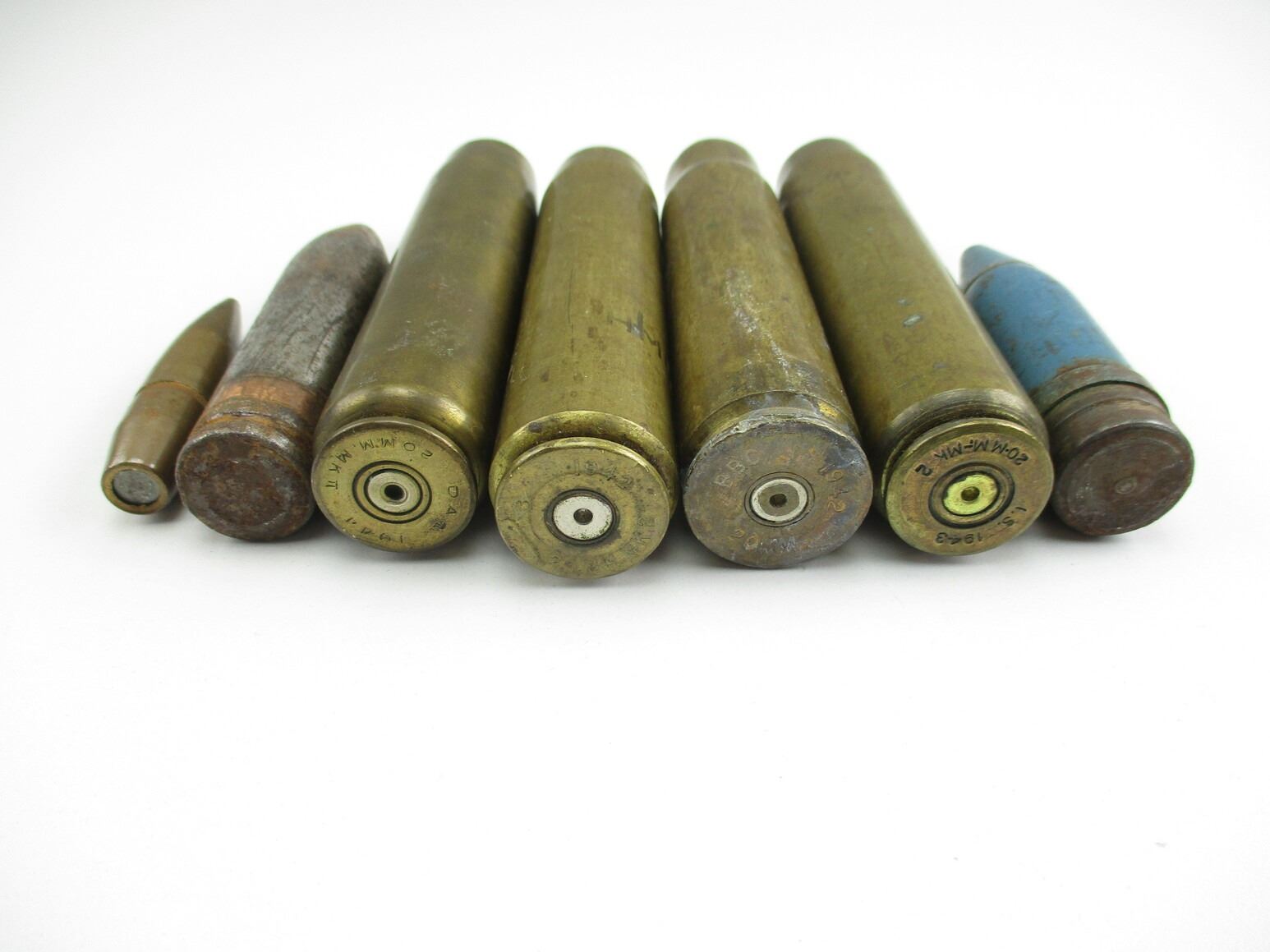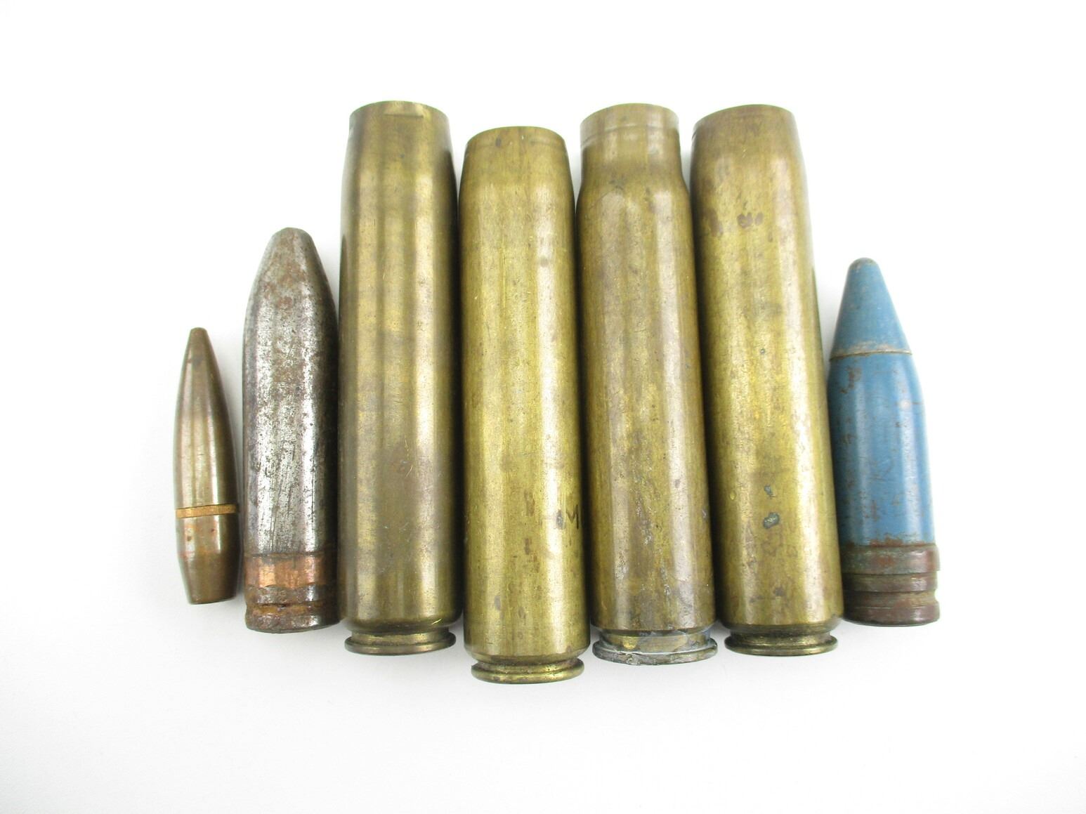 ASSORTED 20MM CASINGS, ETC. INERT LOT, LOT INCLUDES; (4) 20MM X 110 BRASS CASINGS, VARIOUS MARKINGS, (2) 20MM INERT PROJECTILES & (1) 50 M2 PROJECTILE. SEE PHOTOS/, THESE CAN ONLY BE SHIPPED BY CORPORATE UPS COVERED AREAS. PLEASE GO TO LOT 0 IN THE AMMUNITION SESSION, TO SEE IF YOUR POSTAL CODE IS A VALID AREA. THESE CAN NOT BE SHIPPED TO THE USA, OR INTERNATIONALLY. NO REFUNDS WILL BE ISSUED, OR BIDS RETRACTED.