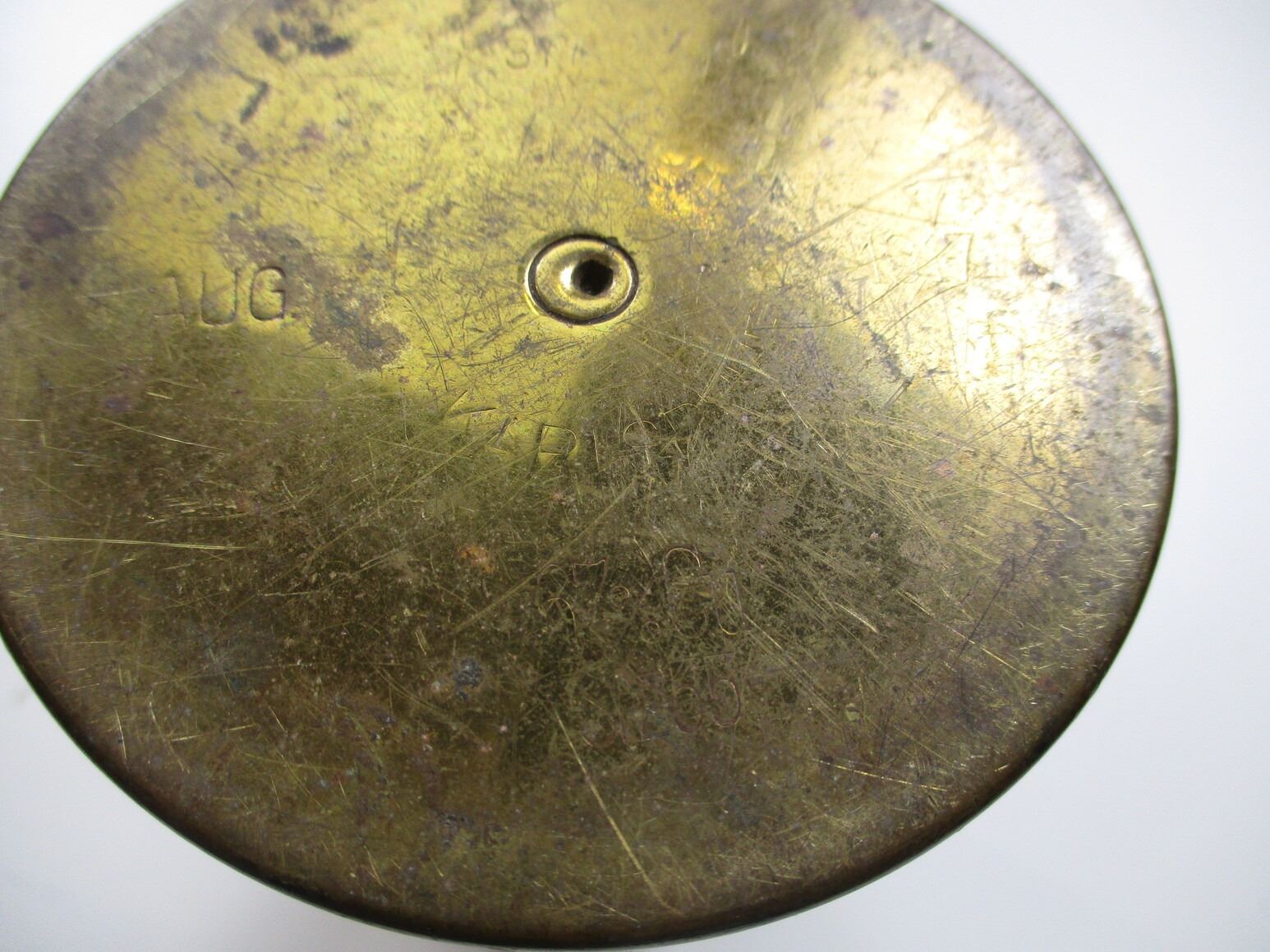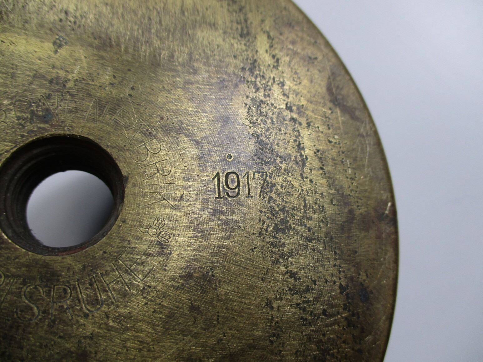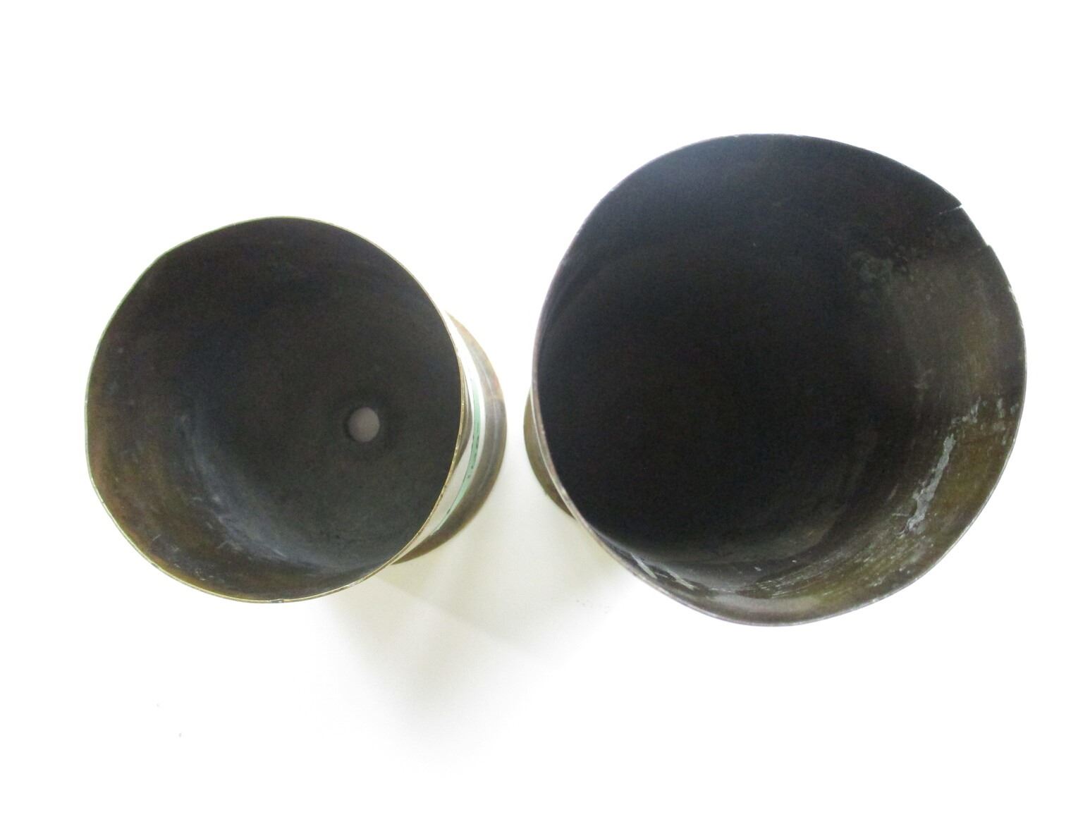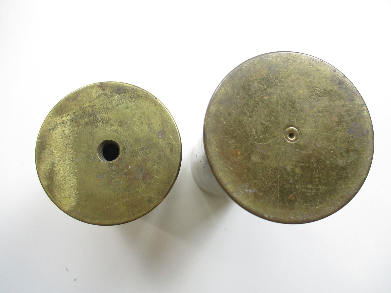 ASSORTED WWI GERMAN SHELL CASING LOT, LOT INCLUDES; (1) 76MM BRASS CASE, WITH FIRED PRIMER, BASE MARKED: "377", "AUG. 1917" & OTHER FAINT / UN-CLEAR MARKINGS, POSSIBLY CUT-DOWN?, APPROX. 3 1/8" DIA. & OAL APPROX. 9" & (1) 10CM M14 HOWITZER BRASS CASE, NO PRIMER, BASE MARKED: "FEB 1917", "274", "1-CMM14" & OTHER FAINT / UN-CLEAR MARKINGS, POSSIBLY CUT-DOWN?, APPROX. 4.5" DIA. & OAL APPROX. 5.25", THESE CAN ONLY BE SHIPPED BY CORPORATE UPS COVERED AREAS. PLEASE GO TO LOT 0 IN THE AMMUNITION SESSION, TO SEE IF YOUR POSTAL CODE IS A VALID AREA. THESE CAN NOT BE SHIPPED TO THE USA, OR INTERNATIONALLY. NO REFUNDS WILL BE ISSUED, OR BIDS RETRACTED.