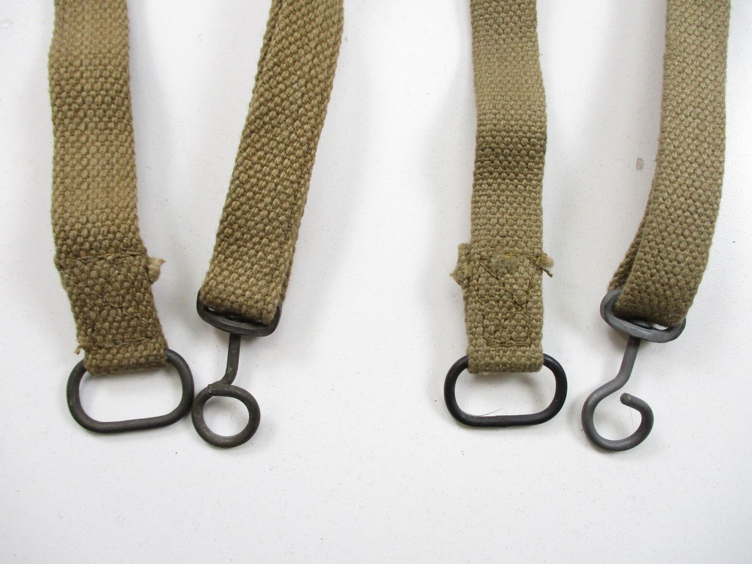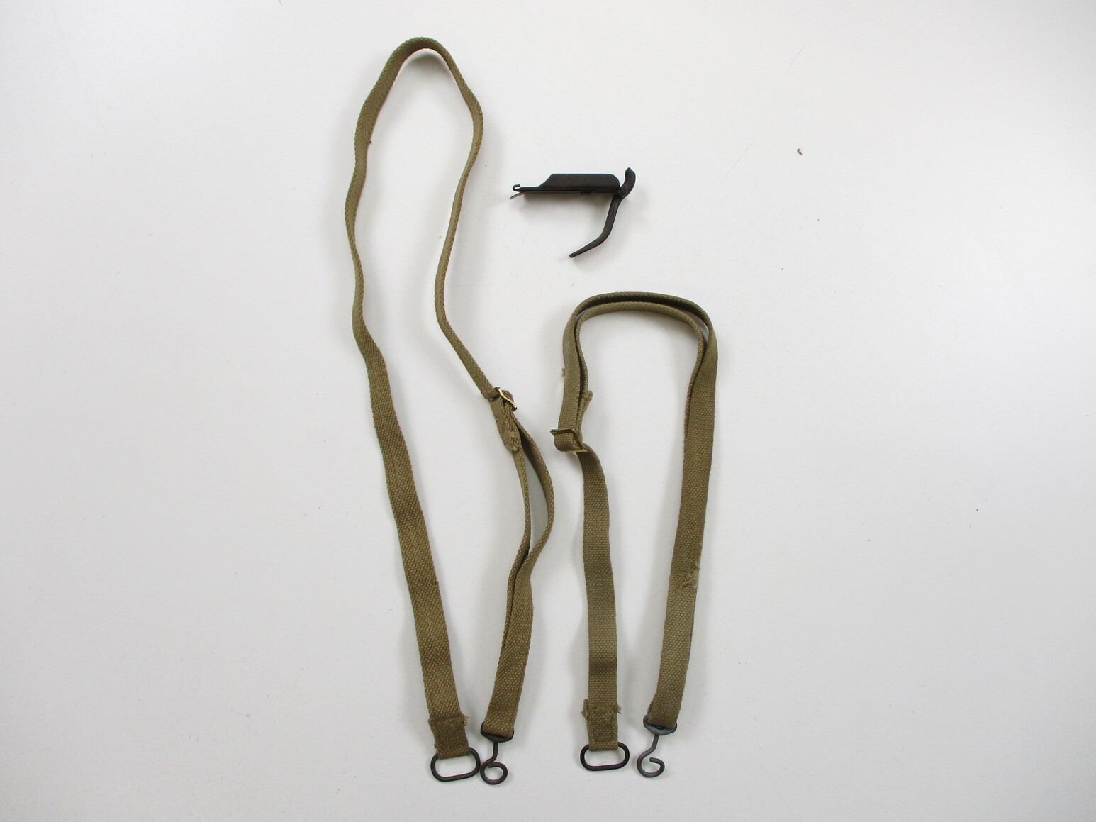 BRITISH STEN SUB-MG ACCESSORIES LOT, FITS 9MM SUB-MG'S, LOT INCLUDES; (1) P37 WEB SLING WITH METAL HOOK & LOOP, MARKED: "ROVER 145", OAL APPROX. 49", ADJUSTABLE, (1) P37 WEB SLING WITH METAL HOOK & LOOP, FAINT / UN-CLEAR MARKINGS, OAL APPROX. 44", ADJUSTABLE & (1) MK II MAG LOADER. SEE PHOTOS.