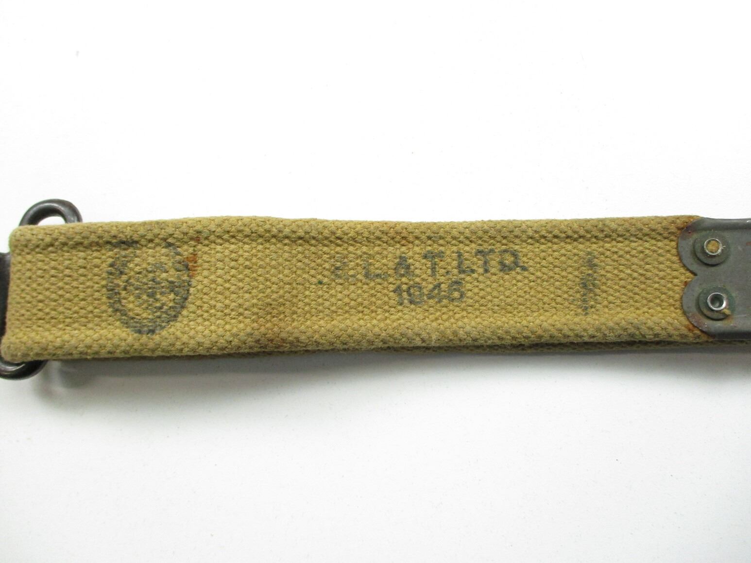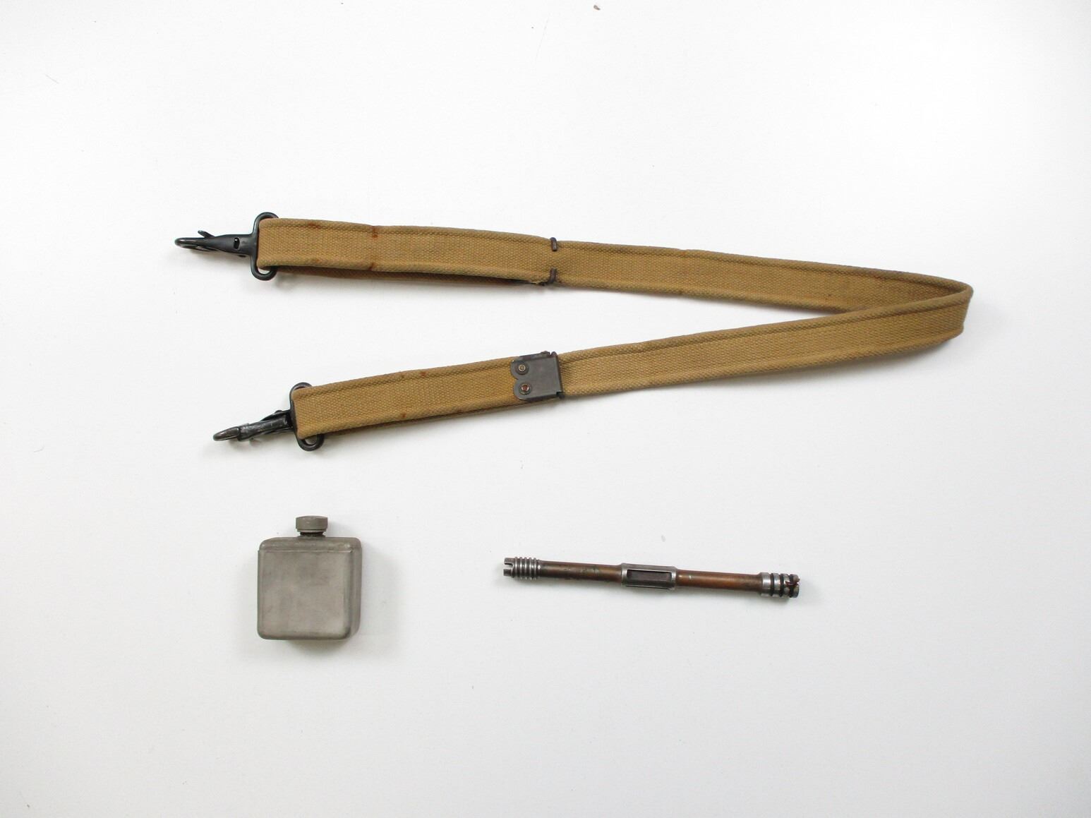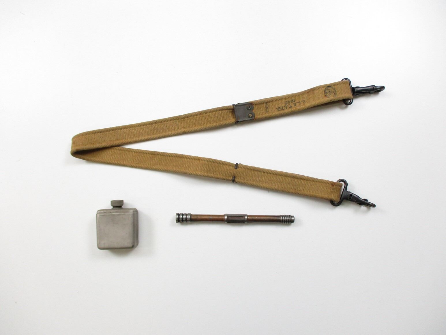 WWII CANADIAN BREN LMG PART AND ACCESSORIES LOT, LOT INCLUDES; (1) P37 WEB SLING WITH "LATE" METAL HOOKS, MARKED: "Z.L.&T.LTD., 1945" & BROAD ARROW, OAL APPROX. 50", ADJUSTABLE, (1) STEEL OILER, MARKED: "F&S LTD" & C-BROAD ARROW & (1) USED GAS PISTON. SEE PHOTOS.