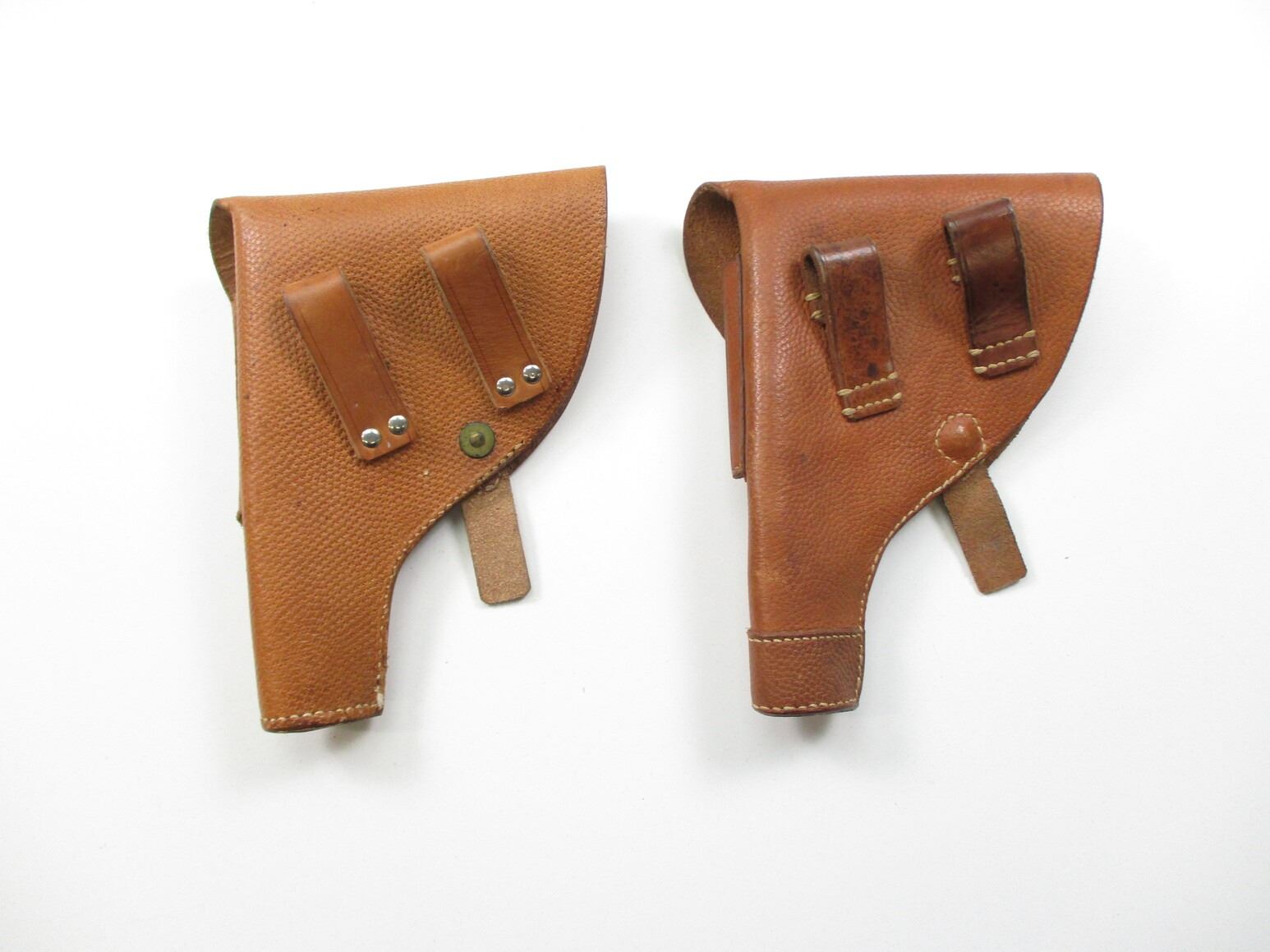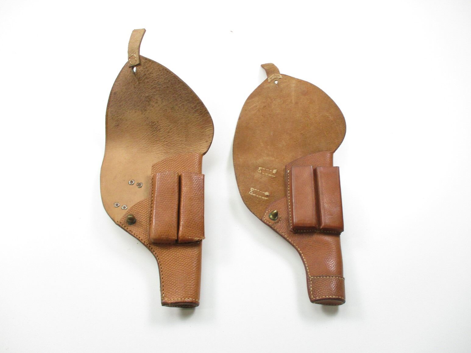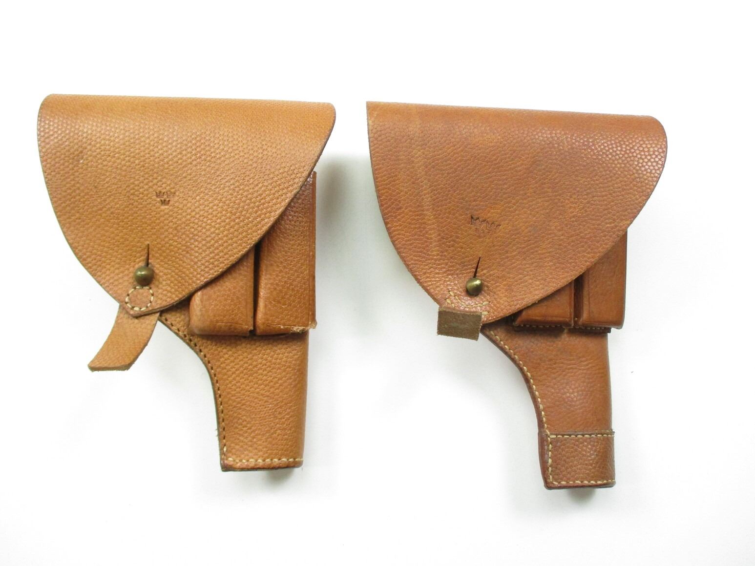 SWEDISH M1903/07 HOLSTER LOT, (2) FITS 9MM BROWNING SEMI-AUTO, BROWN LEATHER WITH TWO MAGAZINE SLEEVES, MARKED WITH THREE CROWNS. SEE PHOTOS.