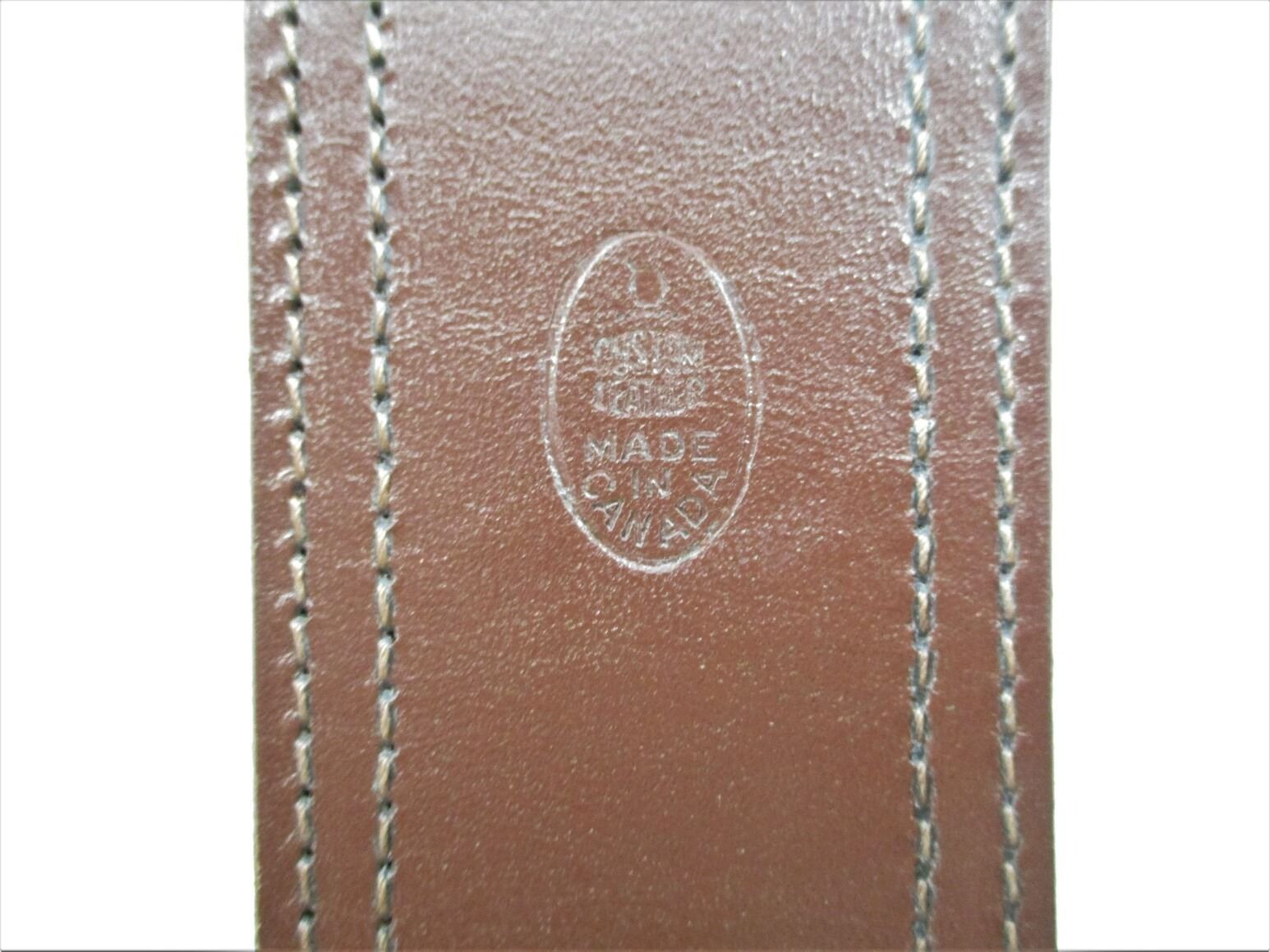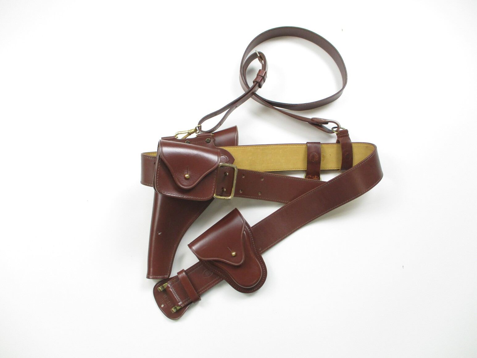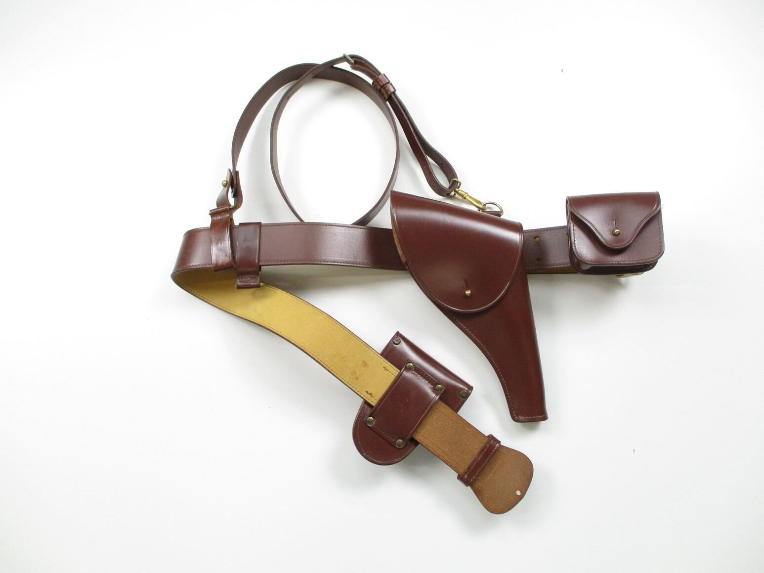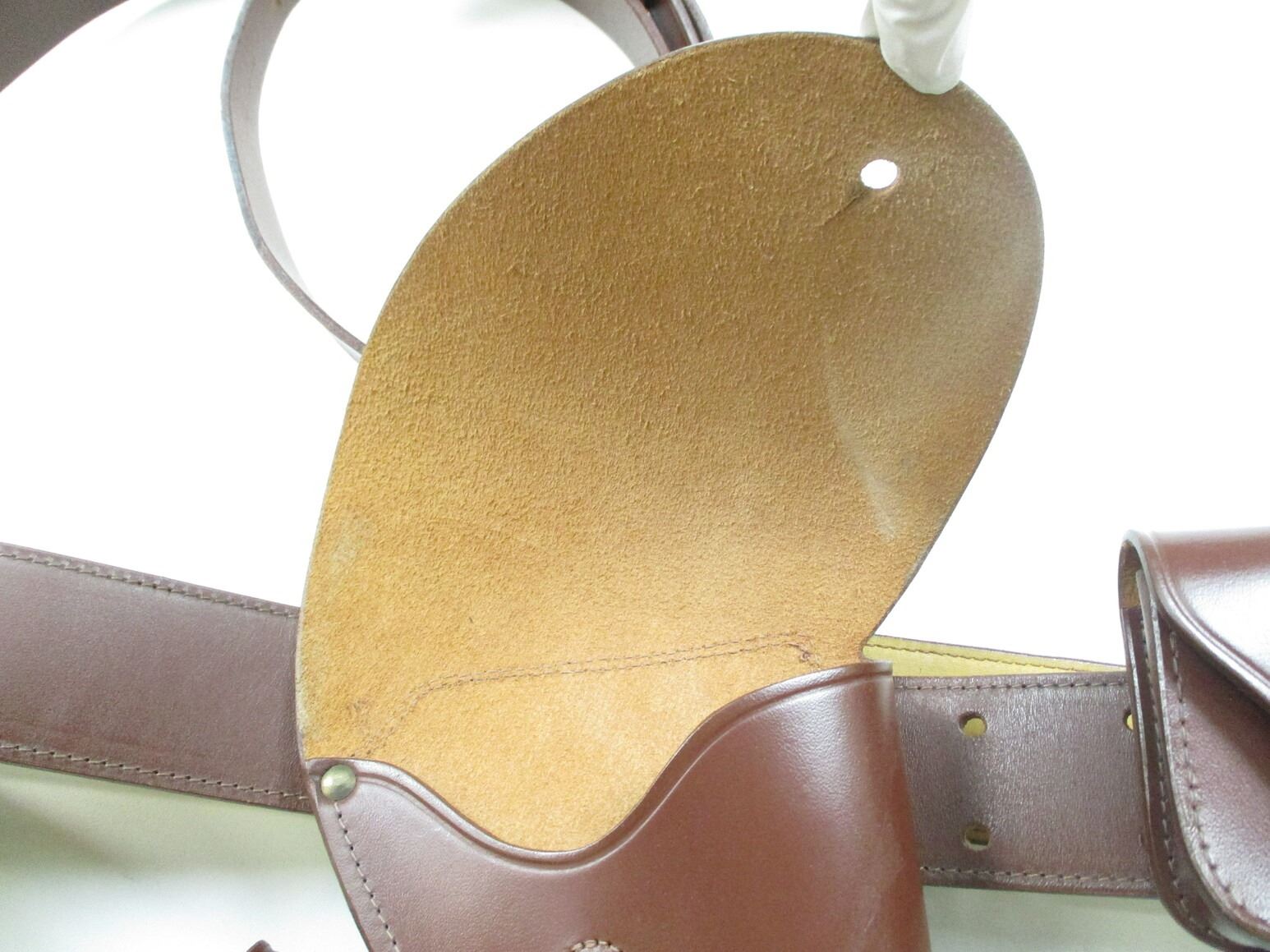 RCMP SAM BROWNE BELT LOT, LOT INCLUDES; (1) BROWN LEATHER BELT WITH METAL FITTINGS & SHOULDER STRAP, MARKED: "CUSTOM LEATHER, MADE IN CANADA" & "42 IN, 107 CM", (1) BROWN LEATHER HOLSTER, (1) BROWN LEATHER AMMO POUCH & (1) BROWN LEATHER HANDCUFF POUCH. SEE PHOTOS.
