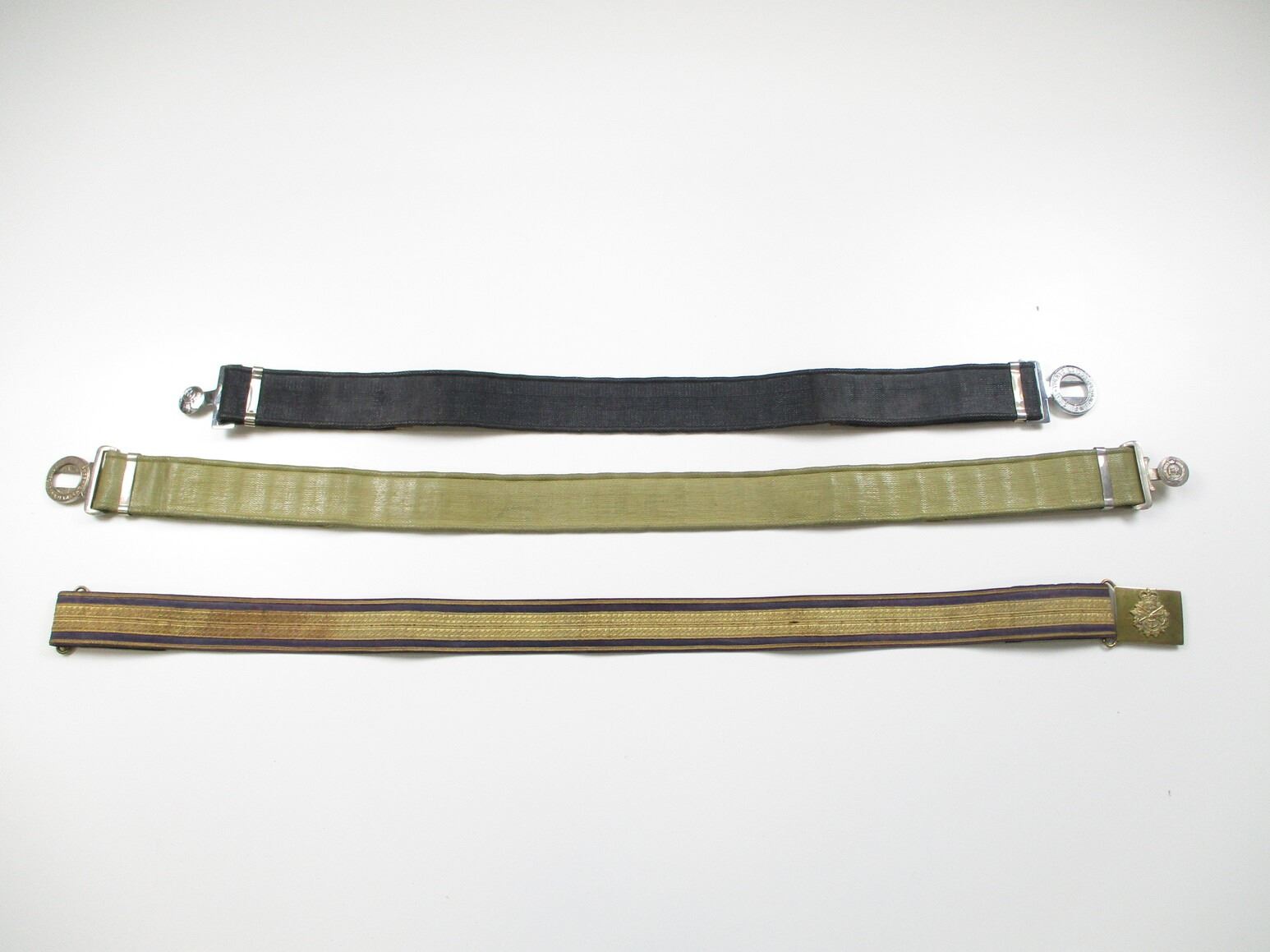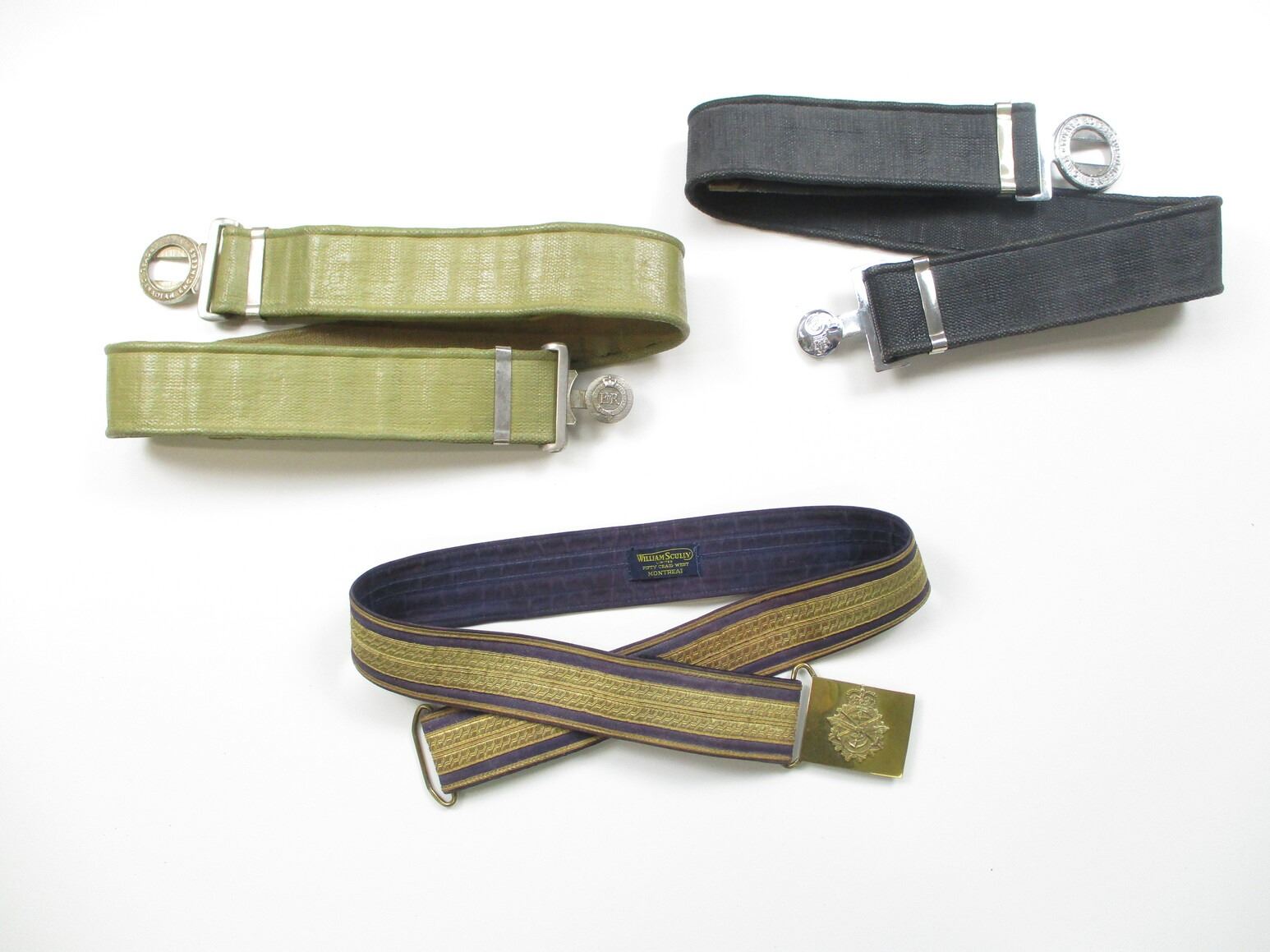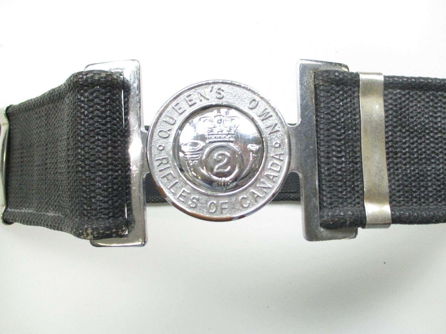 ASSORTED CANADIAN MILITARY BELT LOT, LOT INCLUDES; (1) GREEN BELT WITH "ROYAL CANADIAN ENGINEERS" BELT BUCKLE, OAL APPROX. 52", ADJUSTABLE, (1) BLACK BELT WITH "QUEEN'S OWN RIFLES OF CANADA 2" BELT BUCKLE, APPROX. 44", ADJUSTABLE & (1) GOLD & PURPLE CLOTH BELT WITH "TRI-SERVICES" BELT BUCKLE, MADE BY: "WILLIAM SCULLY LIMITED, MONTREAL", OAL APPROX 42". SEE PHOTOS.