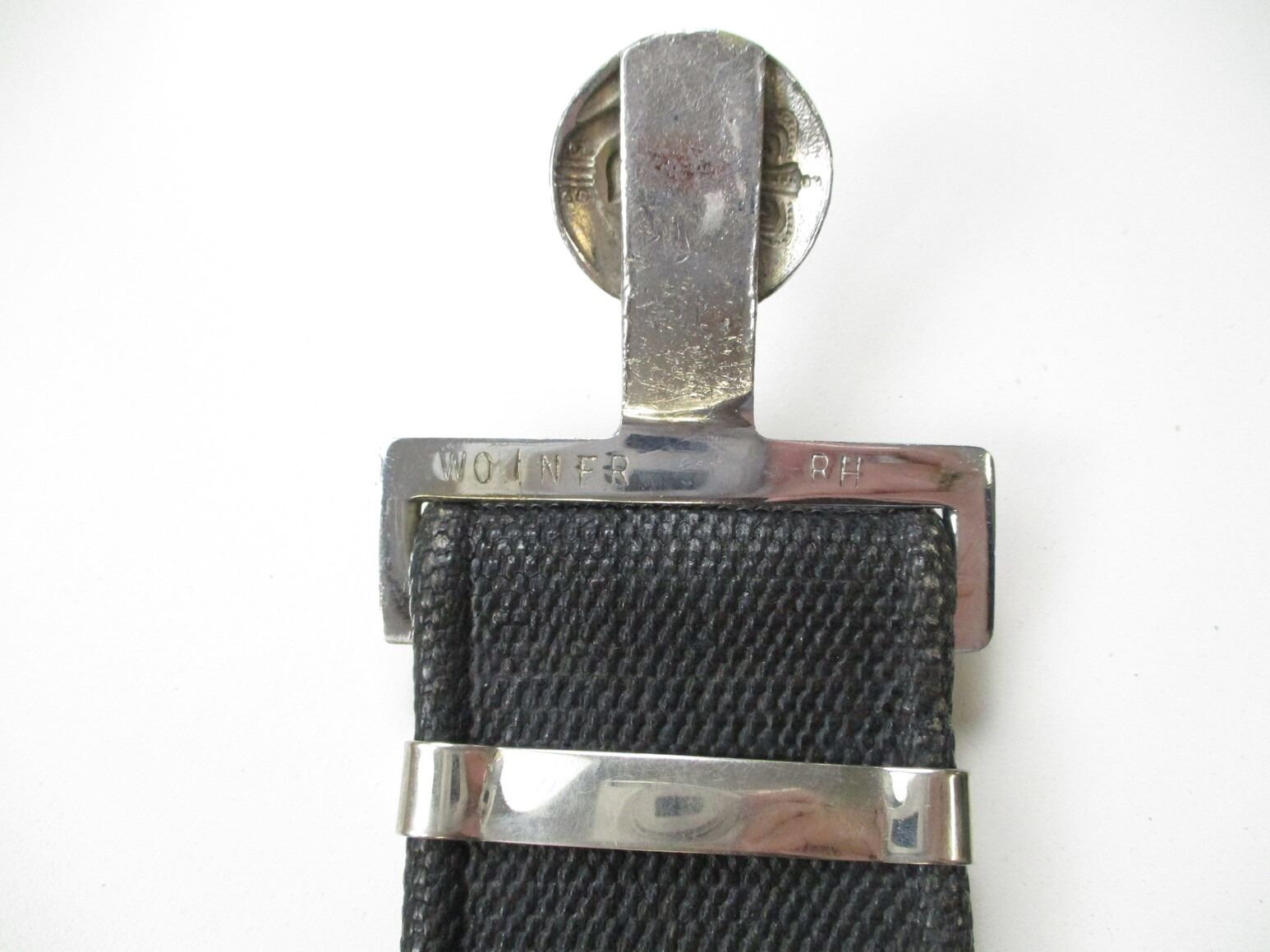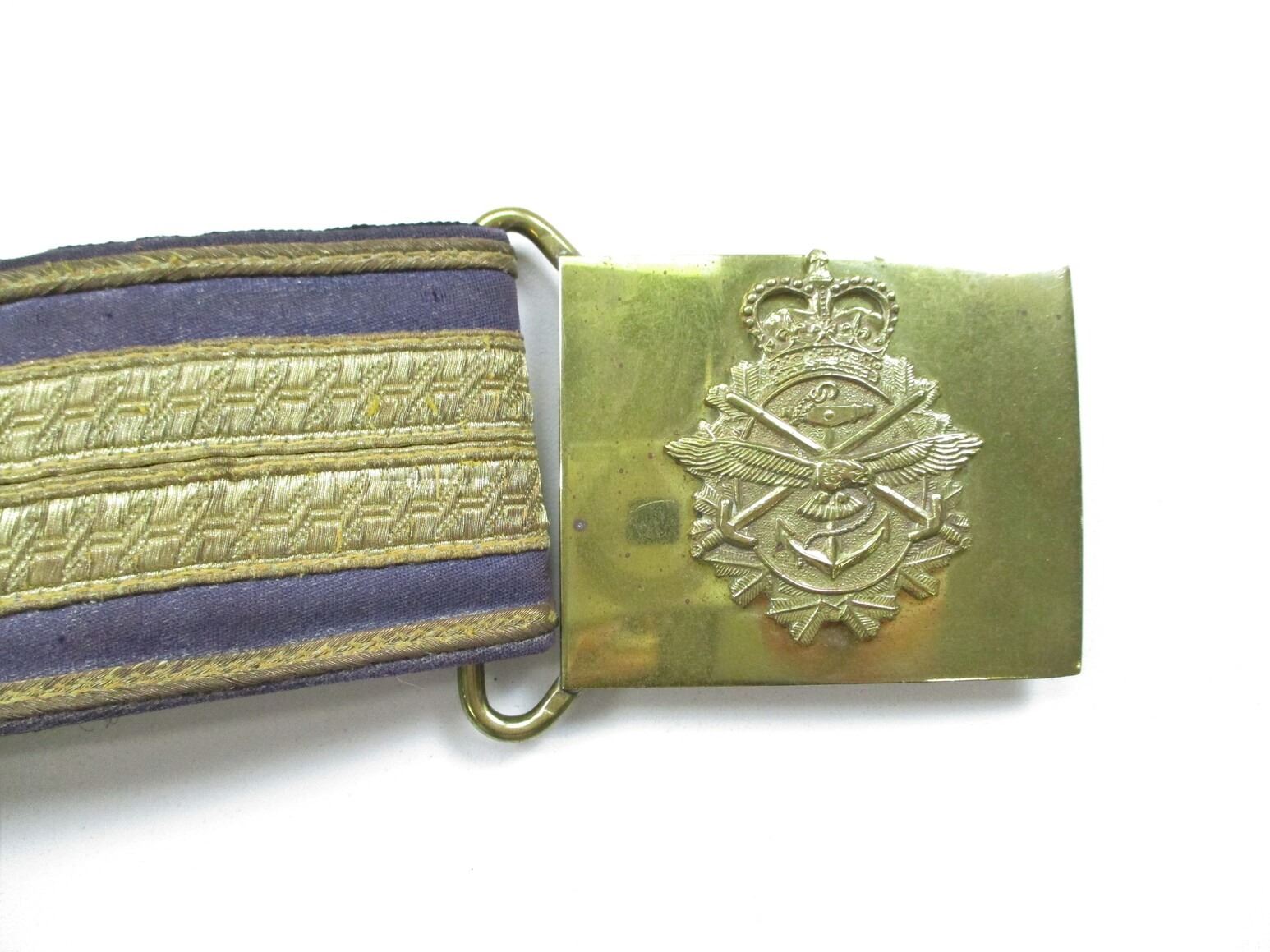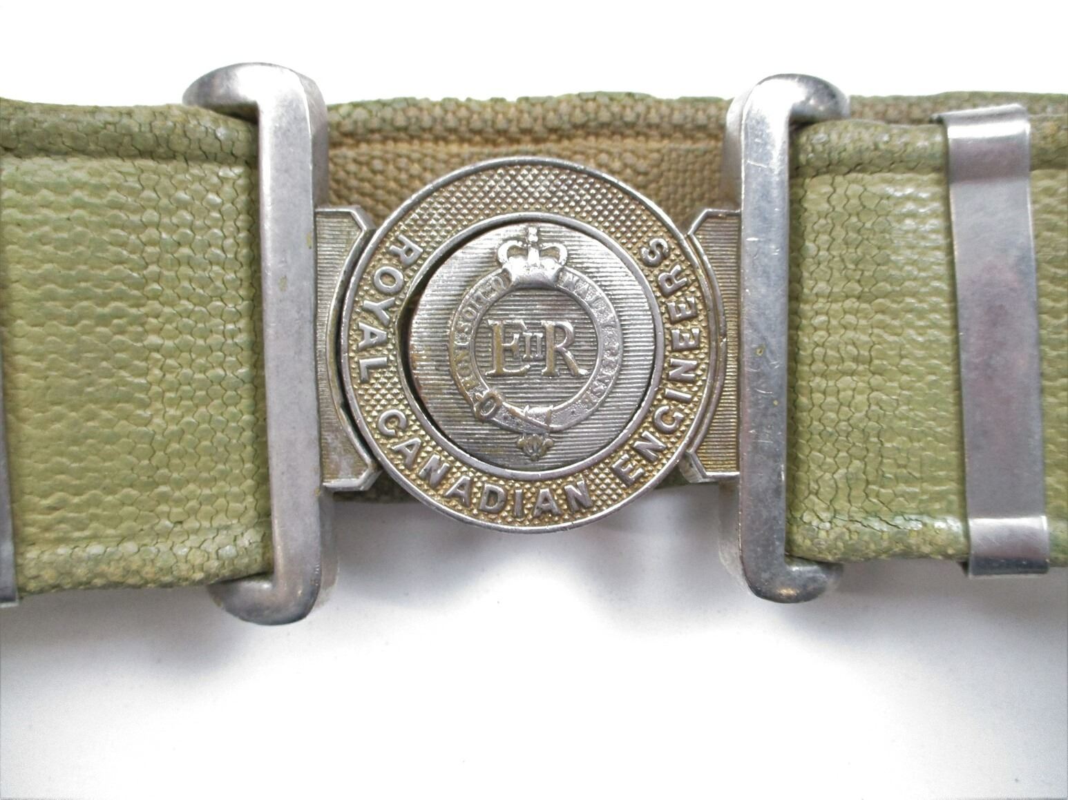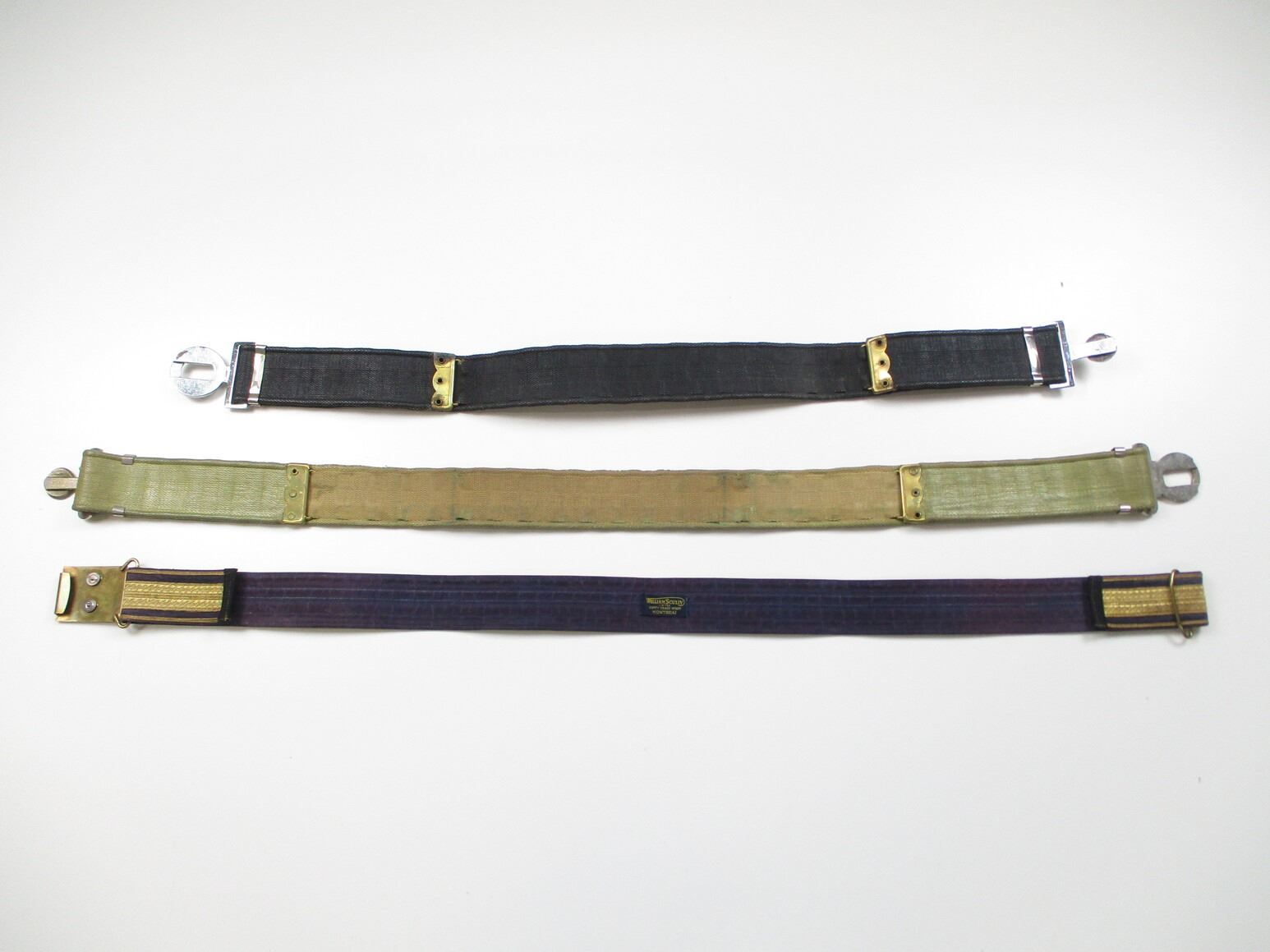 ASSORTED CANADIAN MILITARY BELT LOT, LOT INCLUDES; (1) GREEN BELT WITH "ROYAL CANADIAN ENGINEERS" BELT BUCKLE, OAL APPROX. 52", ADJUSTABLE, (1) BLACK BELT WITH "QUEEN'S OWN RIFLES OF CANADA 2" BELT BUCKLE, APPROX. 44", ADJUSTABLE & (1) GOLD & PURPLE CLOTH BELT WITH "TRI-SERVICES" BELT BUCKLE, MADE BY: "WILLIAM SCULLY LIMITED, MONTREAL", OAL APPROX 42". SEE PHOTOS.