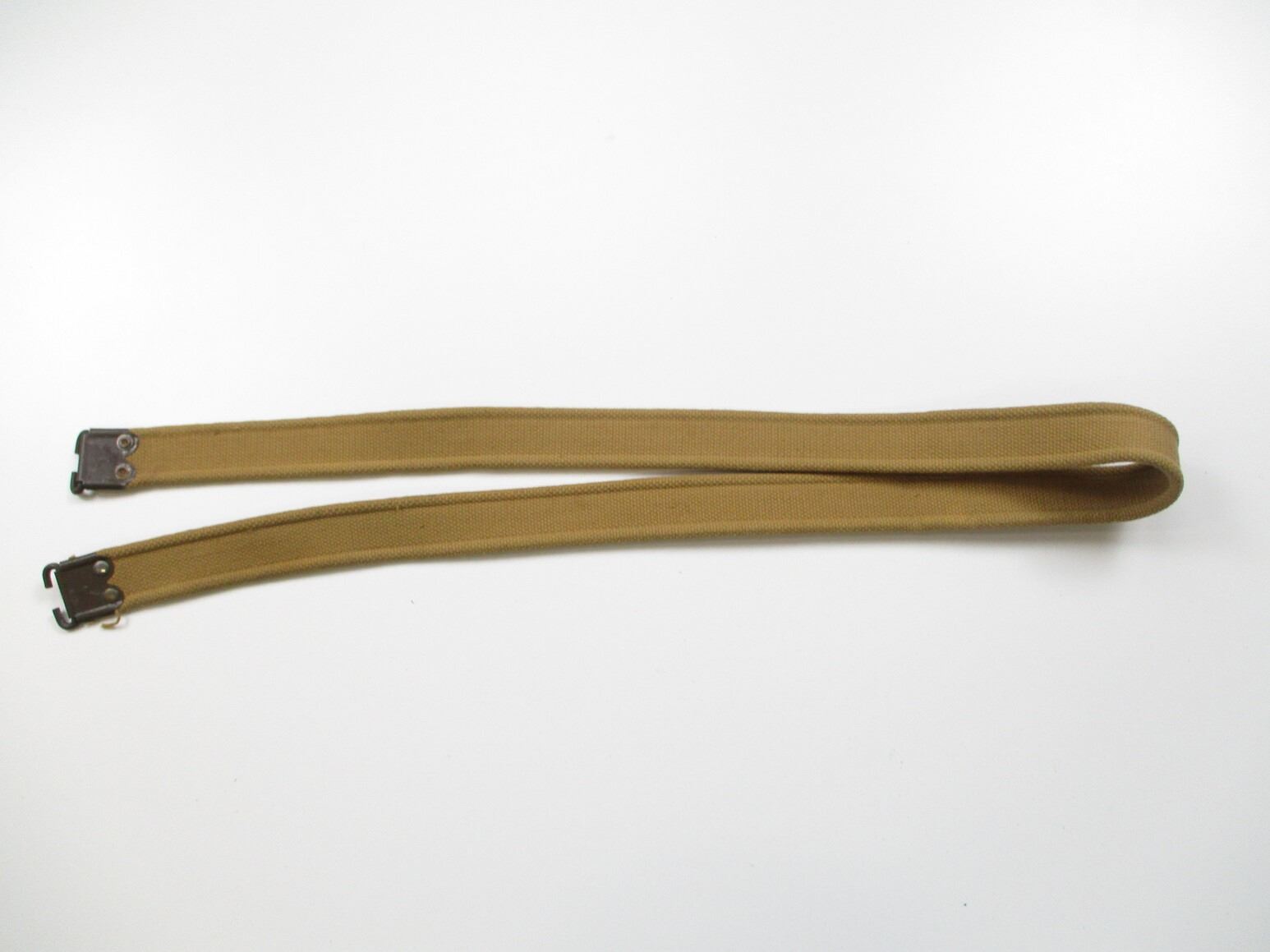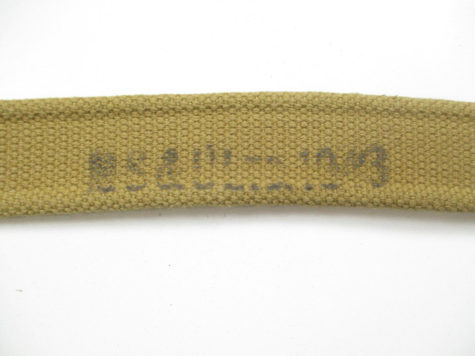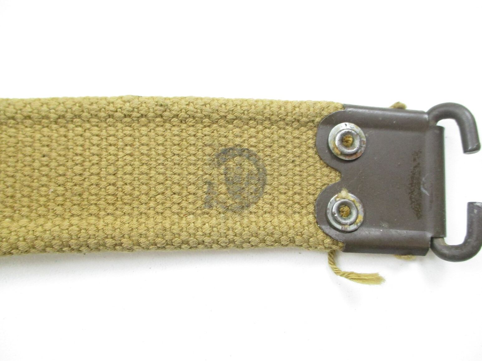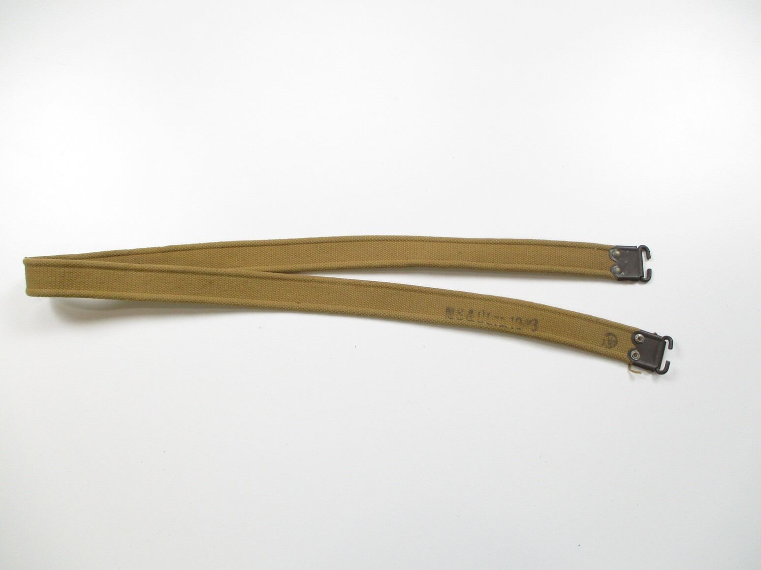 WWII CANADIAN LEE ENFIELD RIFLE SLING, (1) P37 CANVAS SLING WITH METAL FITTINGS, MARKED: "M.S.&U.LTD. (MONTREAL SUSPENDERS & UMBRELLA LTD.), 1943" & C-BROAD ARROW, OAL APPROX. 45". SEE PHOTOS.