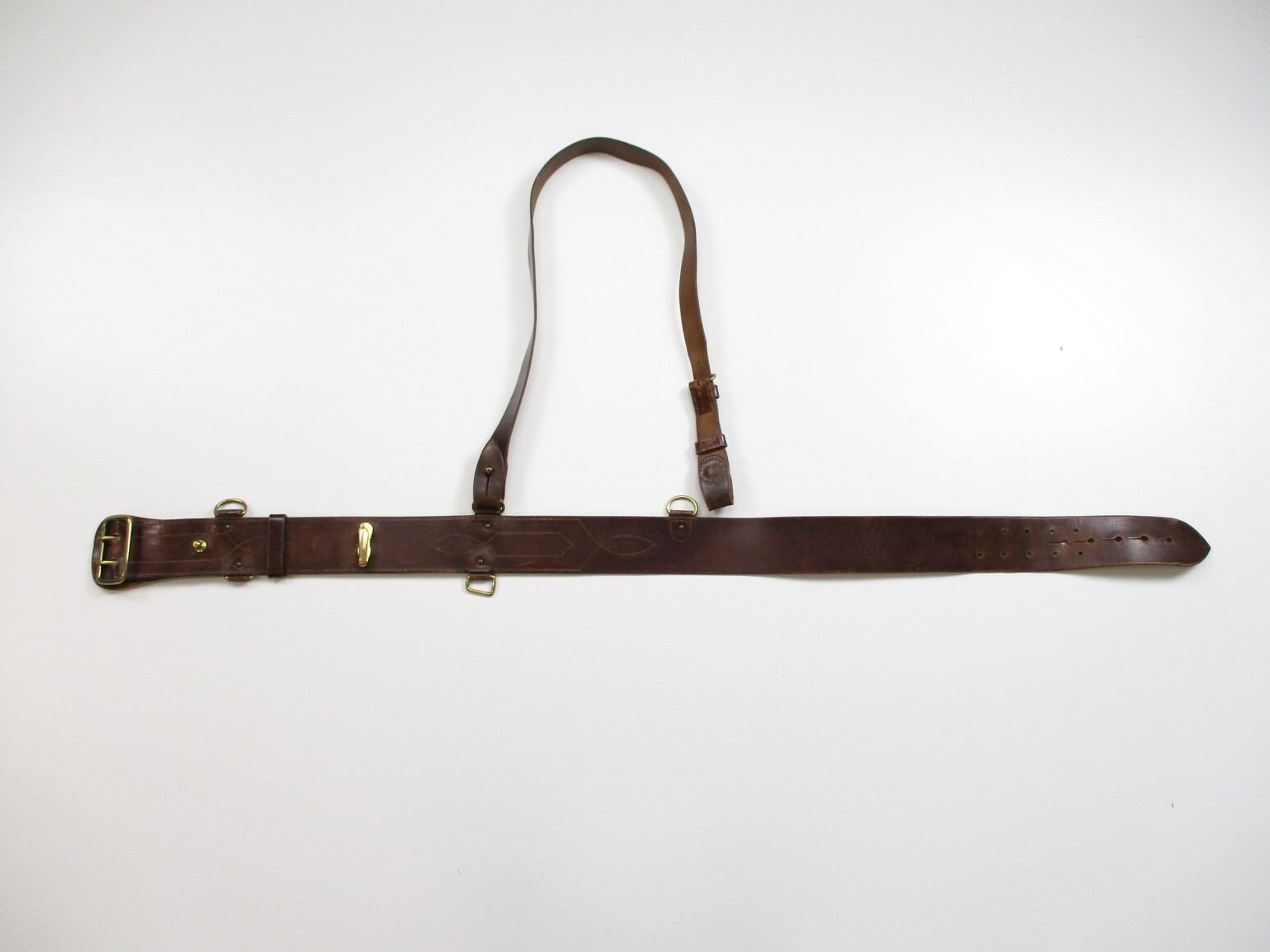MILITARY / POLICE SAM BROWN BELT, LOT INCLUDES; (1) UNMARKED BROWN LEATHER BELT WITH SHOULDER STRAP, BRASS FITTINGS. BELT MEASURES APPROX. 44" L X 2.25" W. SHOULDER STRAP APPROX. 38" L X 1" W.
