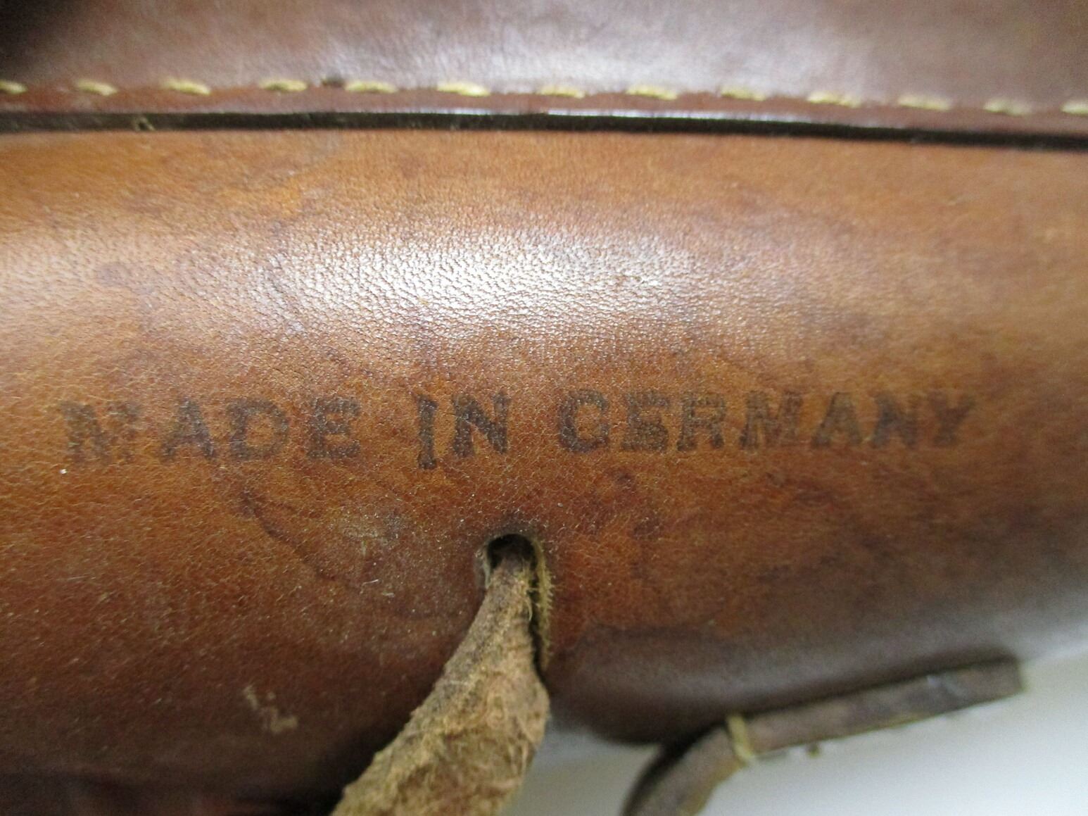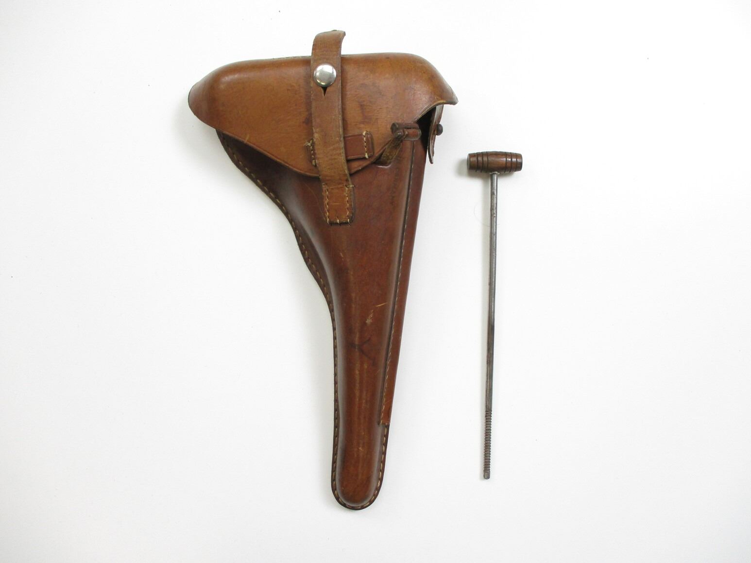 REPRODUCTION ARTILLERY LUGER HOLSTER, (1) BROWN LEATHER WITH MAGAZINE SLEEVE, LIFTING STRAP & BELT LOOP, WOOD HANDLE CLEANING ROD, HOLSTER ATTACHES TO WOOD SHOULDER STOCK (NOT INCLUDED), HOLSTER MARKED: CROWN OVER "III" & "MADE IN GERMANY". SEE PHOTOS.
