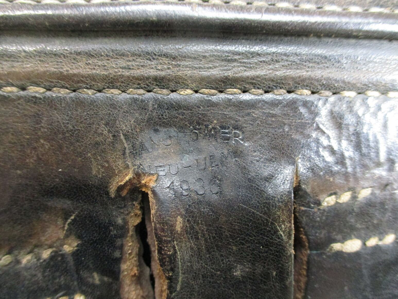 PRE-WWII GERMAN P08 LUGER HOLSTER, (1) FITS 9MM PISTOLS, BLACK LEATHER WITH MAGAZINE SLEEVE & LIFTING STRAP, MISSING BELT LOOPS & MODIFIED TO SINGLE, MARKED: "HANSROMER, NEU-ULM, 1936". SEE PHOTOS.