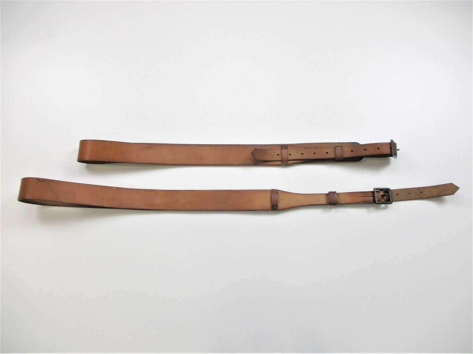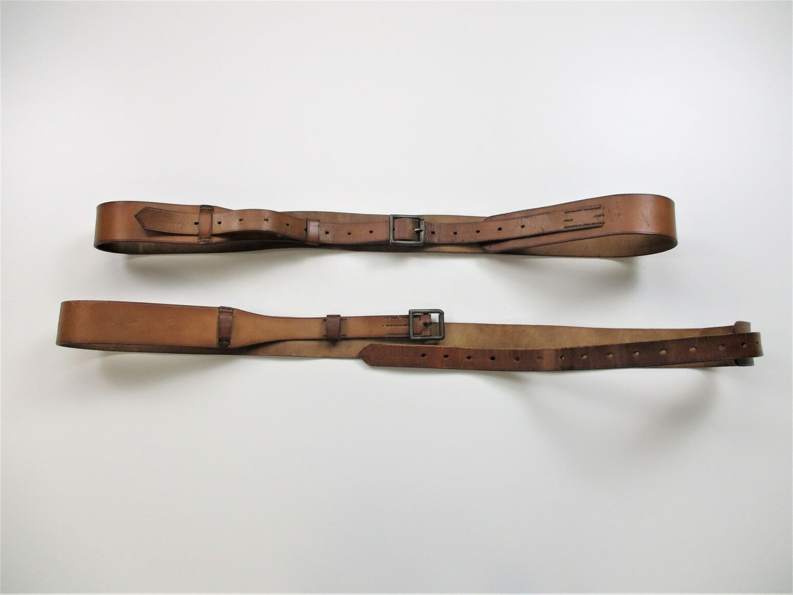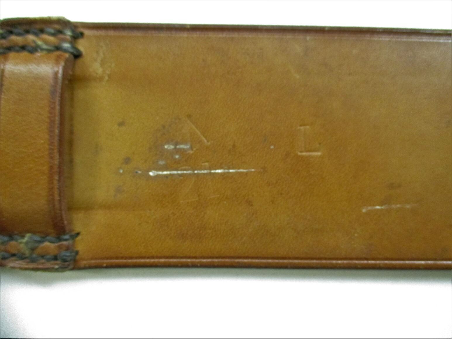 WWII BRITISH BELT LOT, LOT INCLUDES; (1) BROWN LEATHER BELT WITH METAL FITTINGS, MARKED: "E. JEFFRIES & SONS LTD., 1940", "L", "66" & BROAD ARROW, OAL APPROX. 82" & (1) BROWN LEATHER BELT WITH METAL FITTINGS, MARKED: "E. JEFFRIES & SONS LTD., 1939", "L", "21" & BROAD ARROW, OAL APPROX. 80". SEE PHOTOS.