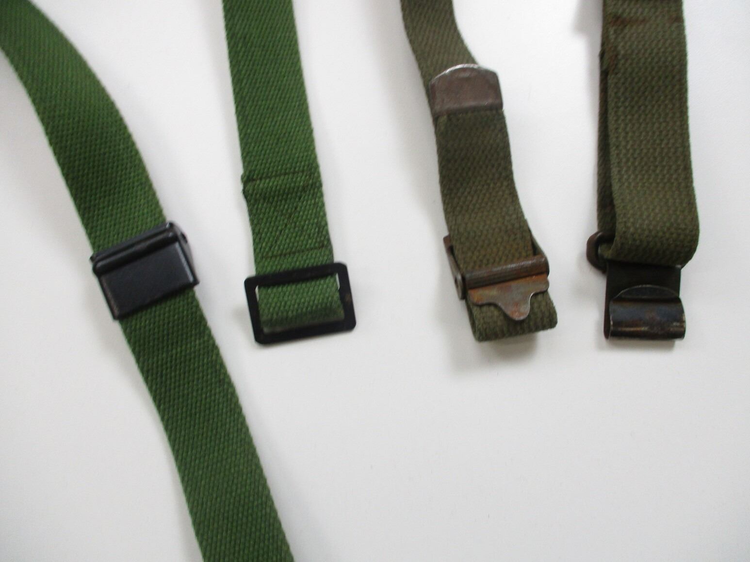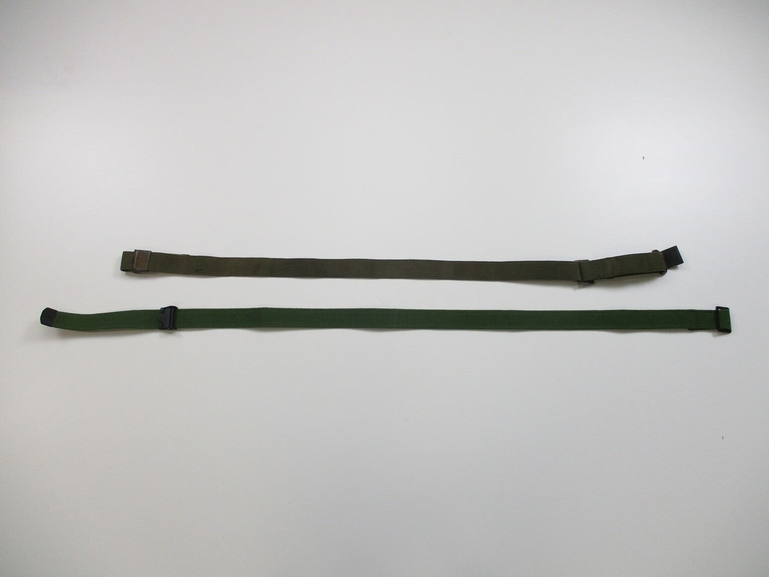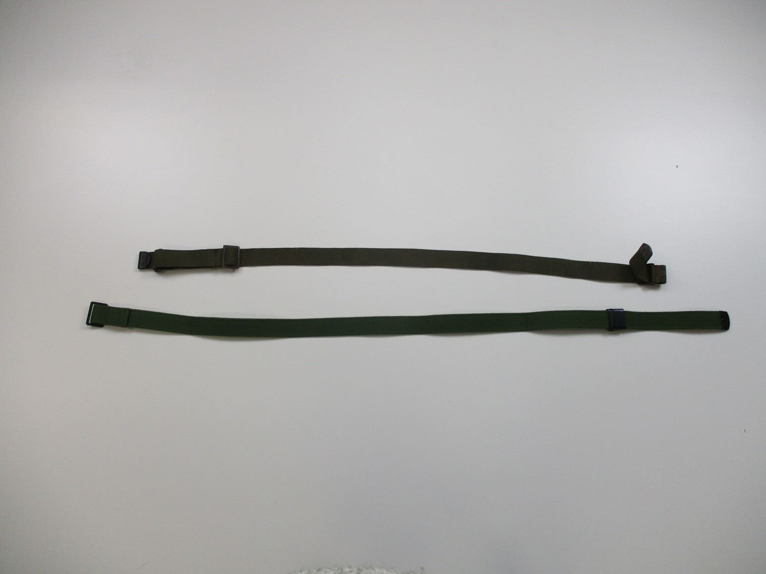 ASSORTED MILITARY M1 GARAND SLING LOT, LOT INCLUDES; (1) U.S. MILITARY POST-WWII SLING, GREEN CANVAS & METAL FITTINGS, NO VISIBLE MARKINGS, OAL APPROX. 42", ADJUSTABLE & (1) NORINCO SLING, GREEN CANVAS & METAL FITTINGS, NO VISIBLE MARKINGS, OAL APPROX. 42". SEE PHOTOS.