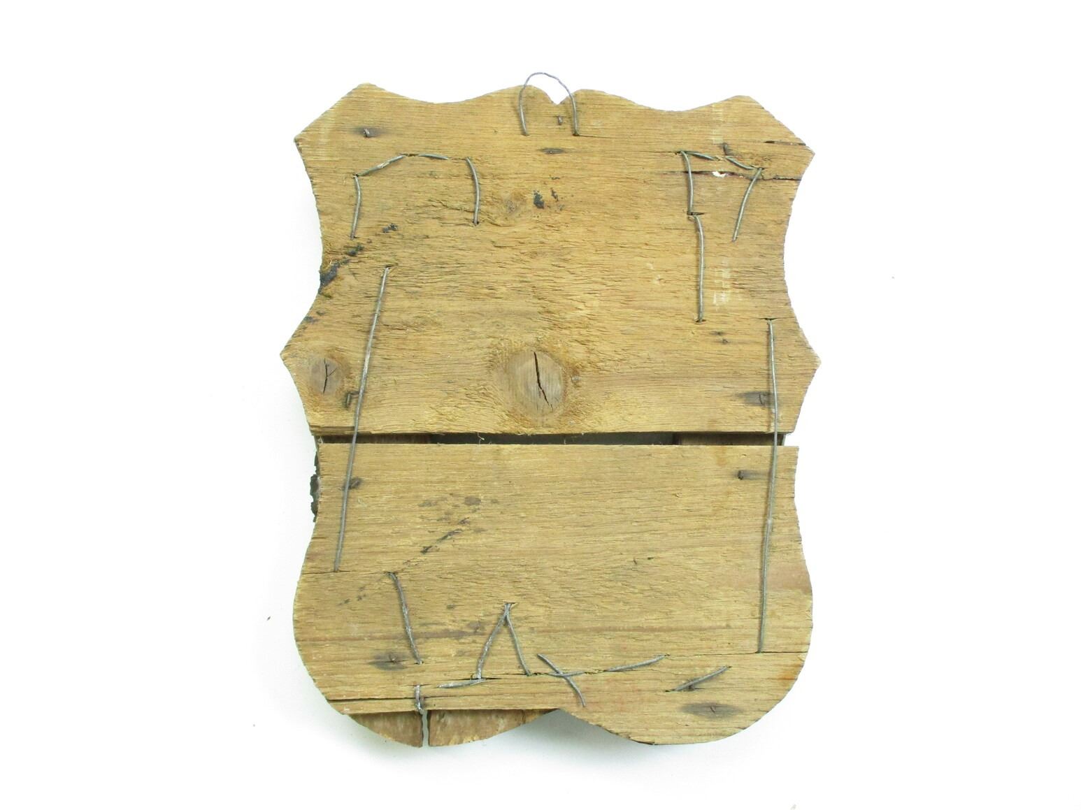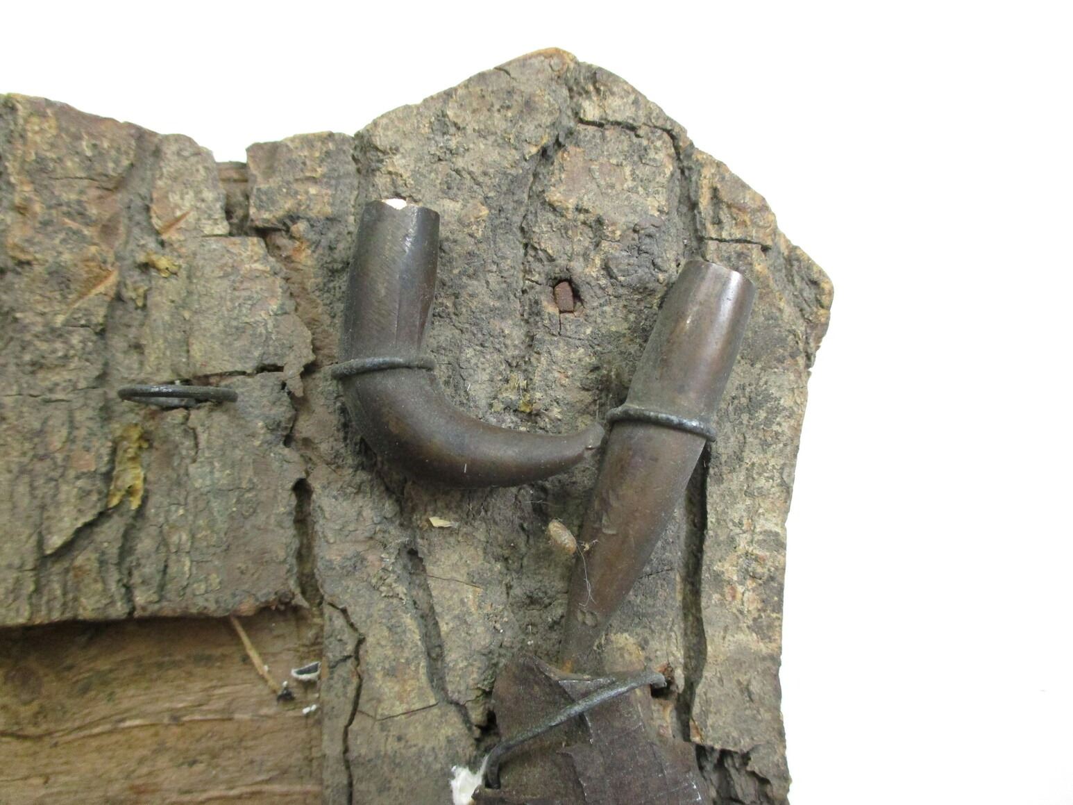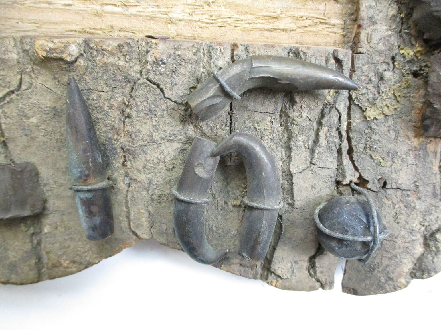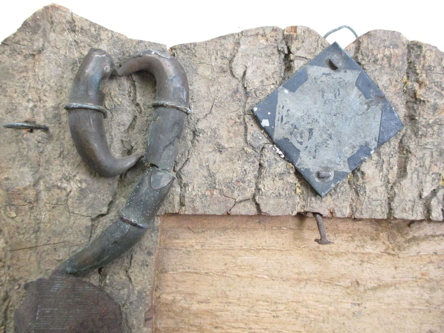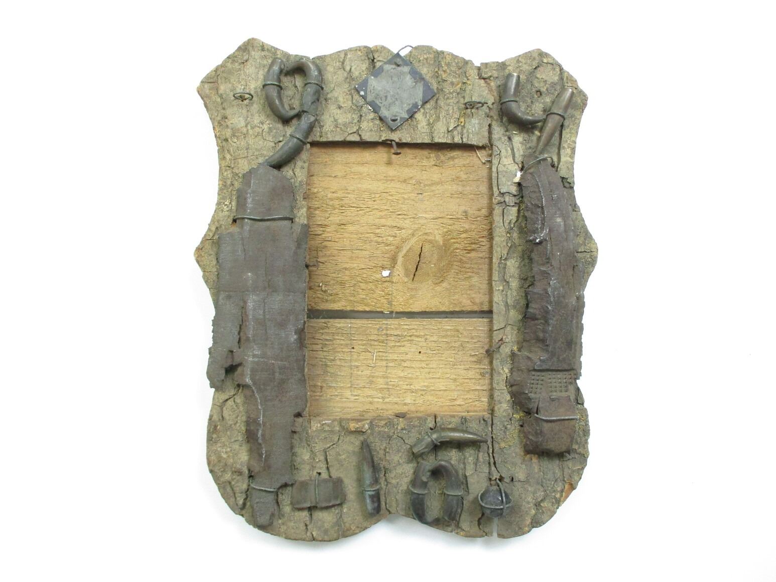 MILITARY TYPE TRENCH ART, (1) WOOD FRAME PICTURE HANGER WITH VARIOUS ARTILLERY & BULLET PIECES, APPROX. 8" W X 10.25" H. SEE PHOTOS.