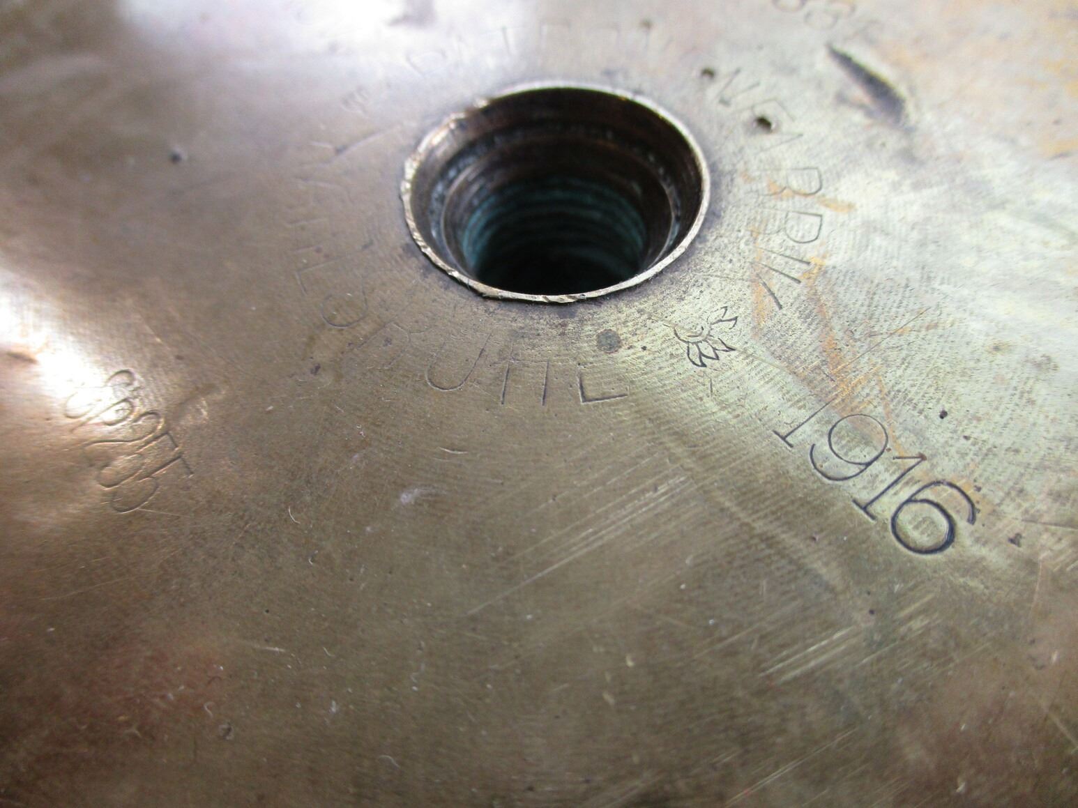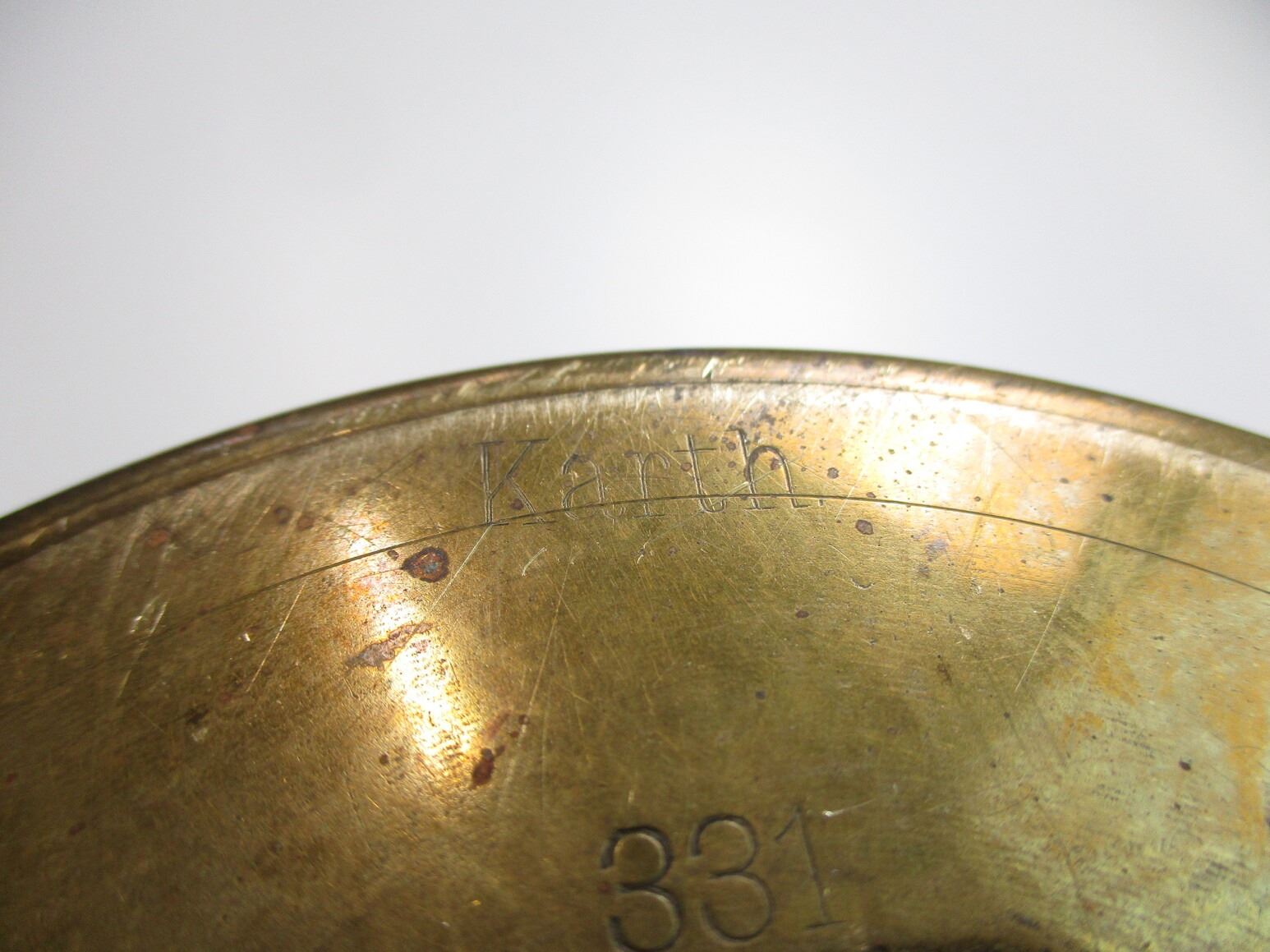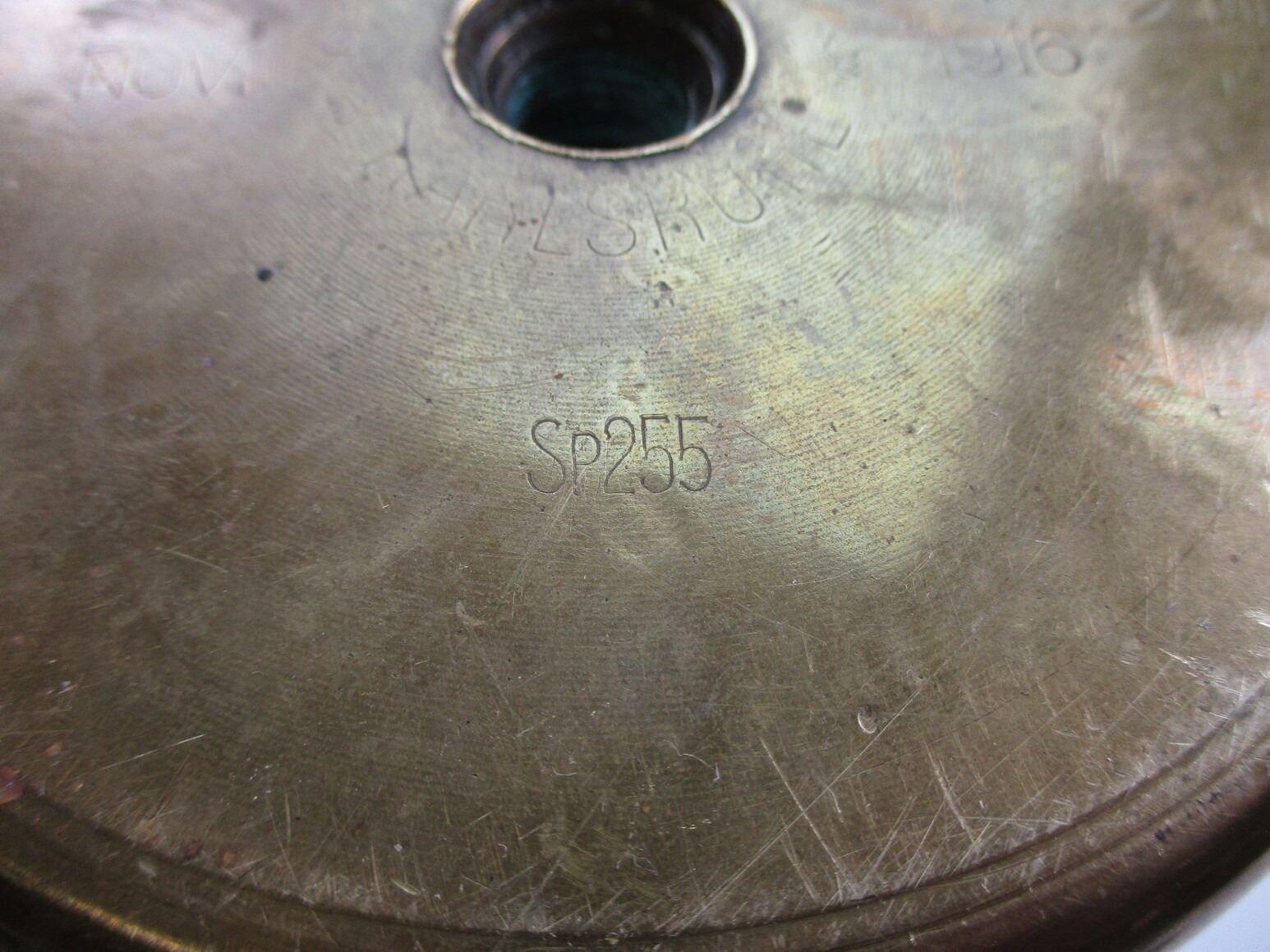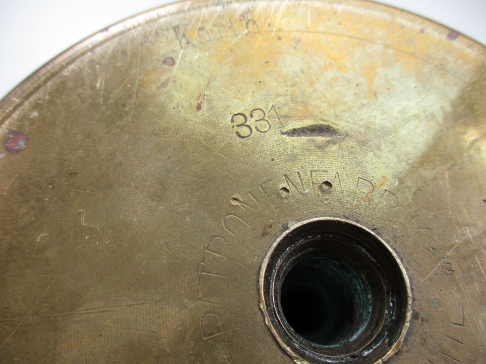WWI GERMAN SHELL CASING TRENCH ART, (1) BRASS CASE POSSIBLY USED AS A CANE STAND / UMBRELLA STAND, BASE MARKED: "KARTH", "331", "NOV 1916", "SP255", "PATRONENFABRIK KARLSRUHE", APPROX. 4.5" DIA. & OAL APPROX. 19.75". SEE PHOTOS.