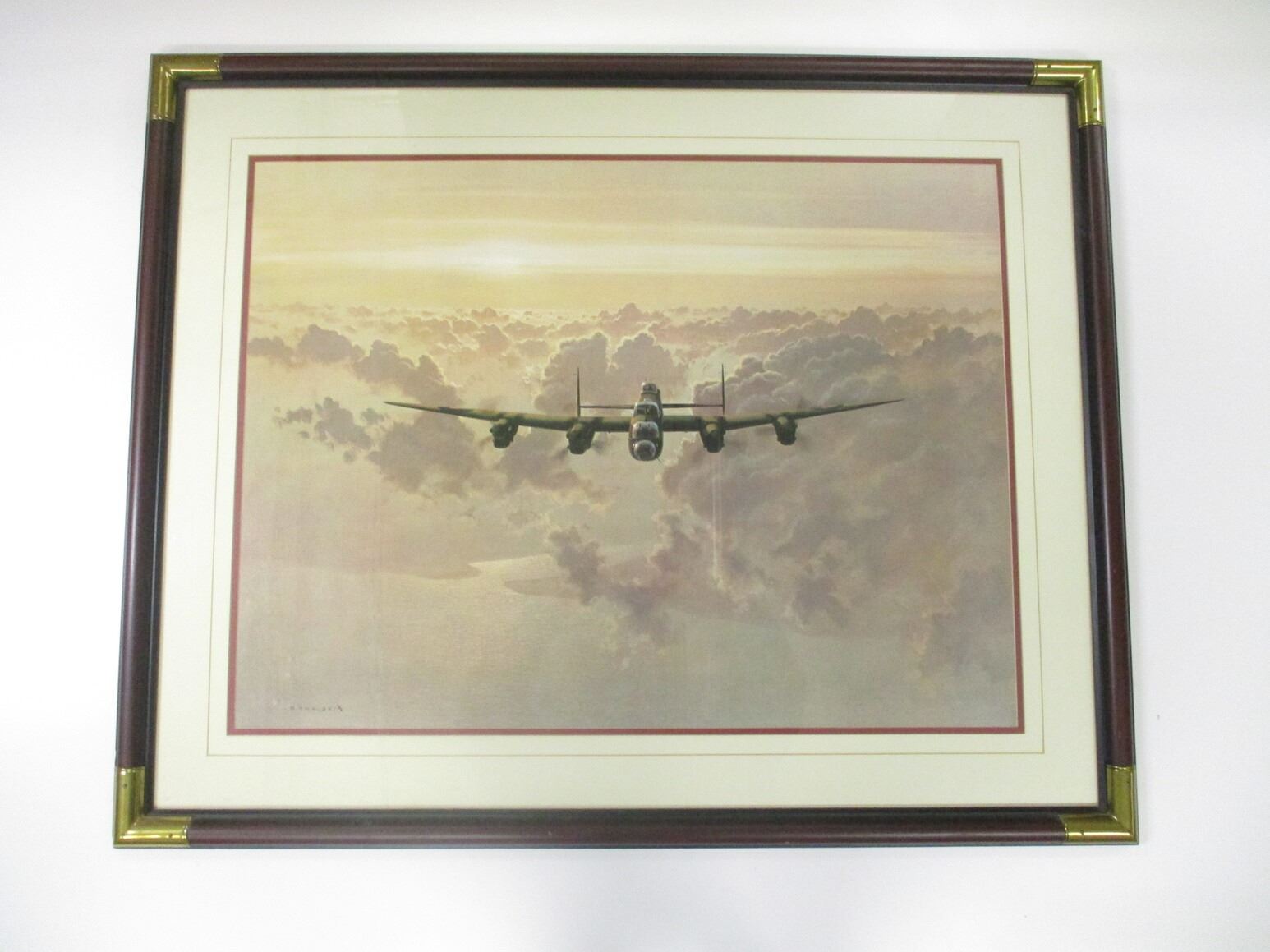 "OUTBOUND LANCASTER" FRAMED WALL PICTURE, (1) BY GERALD COULSON, WOOD FRAME WITH GLASS, APPROX. 38.5" L X 31" H. SEE PHOTOS. *NO GUARANTEE ON GLASS FOR SHIPPING*