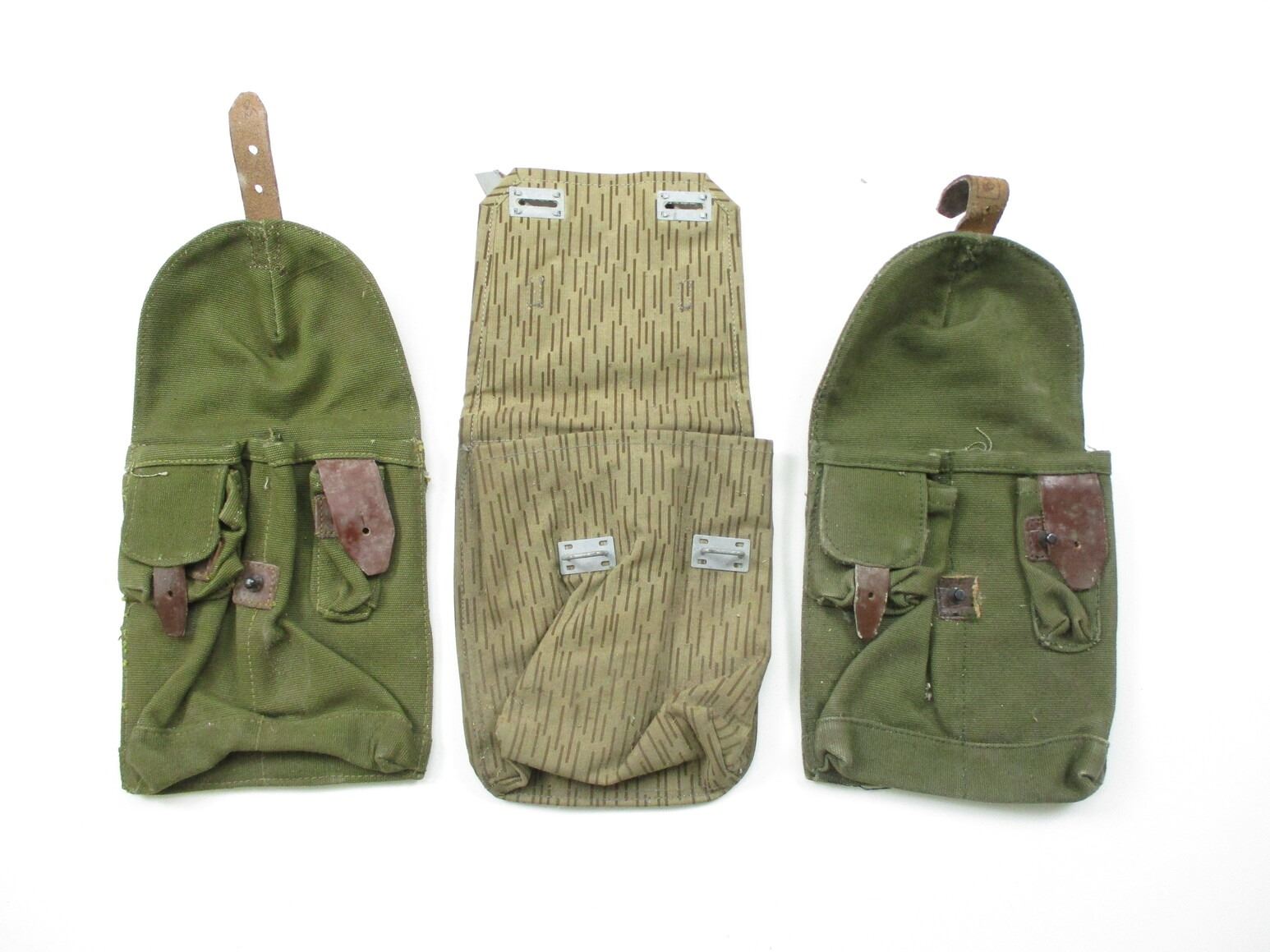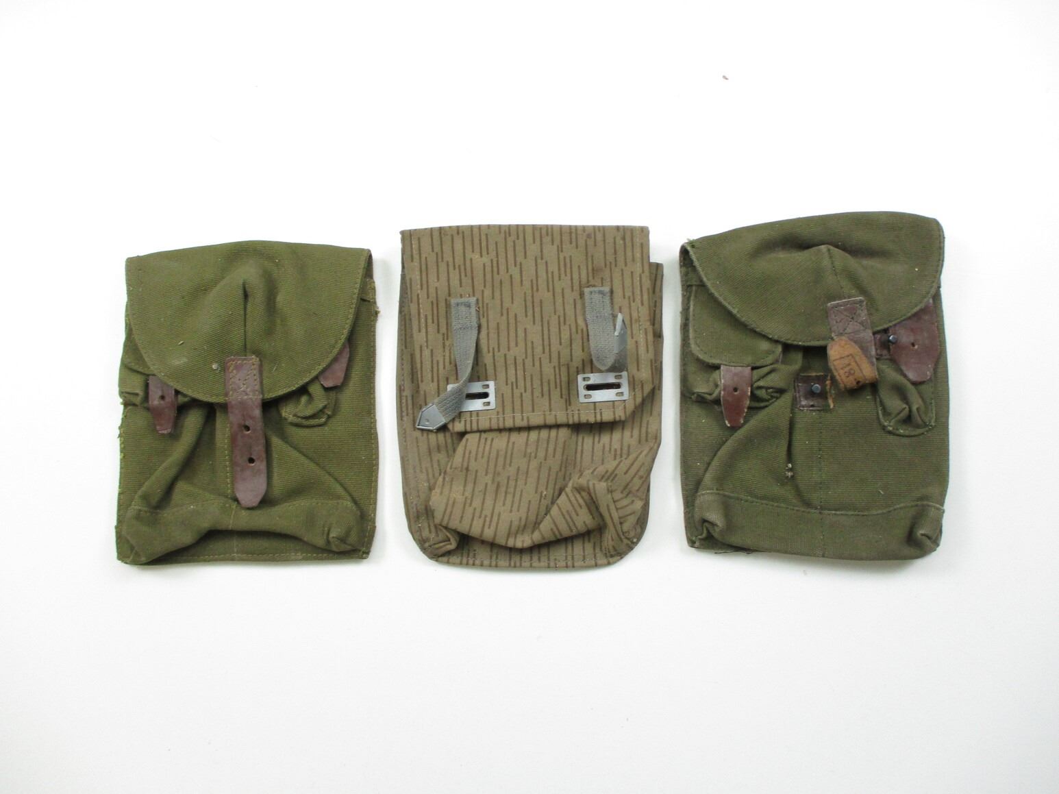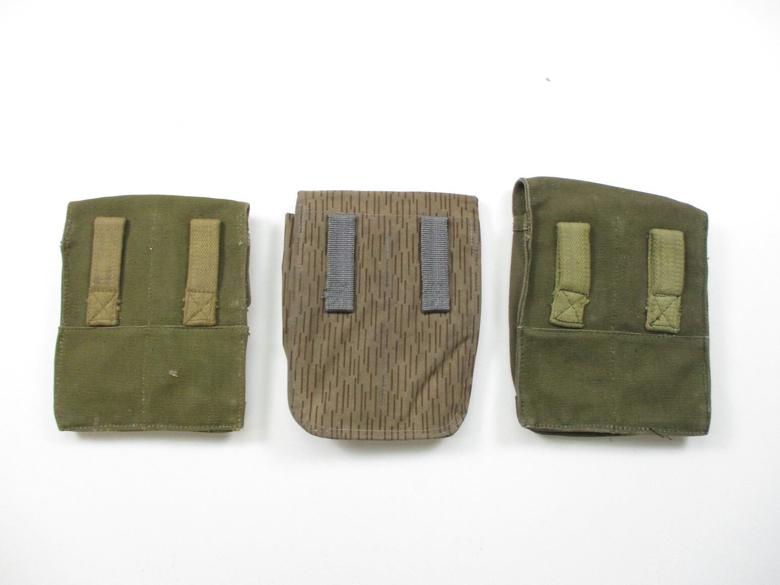 ASSORTED AK-47 TYPE MAGAZINE POUCH LOT, (3) PIECES, VARIOUS POCKETS, BELT LOOPS, INCLUDING; (1) EAST GERMAN CAMOUFLAGE & (2) UNKNOWN GREEN CANVAS. SEE PHOTOS.