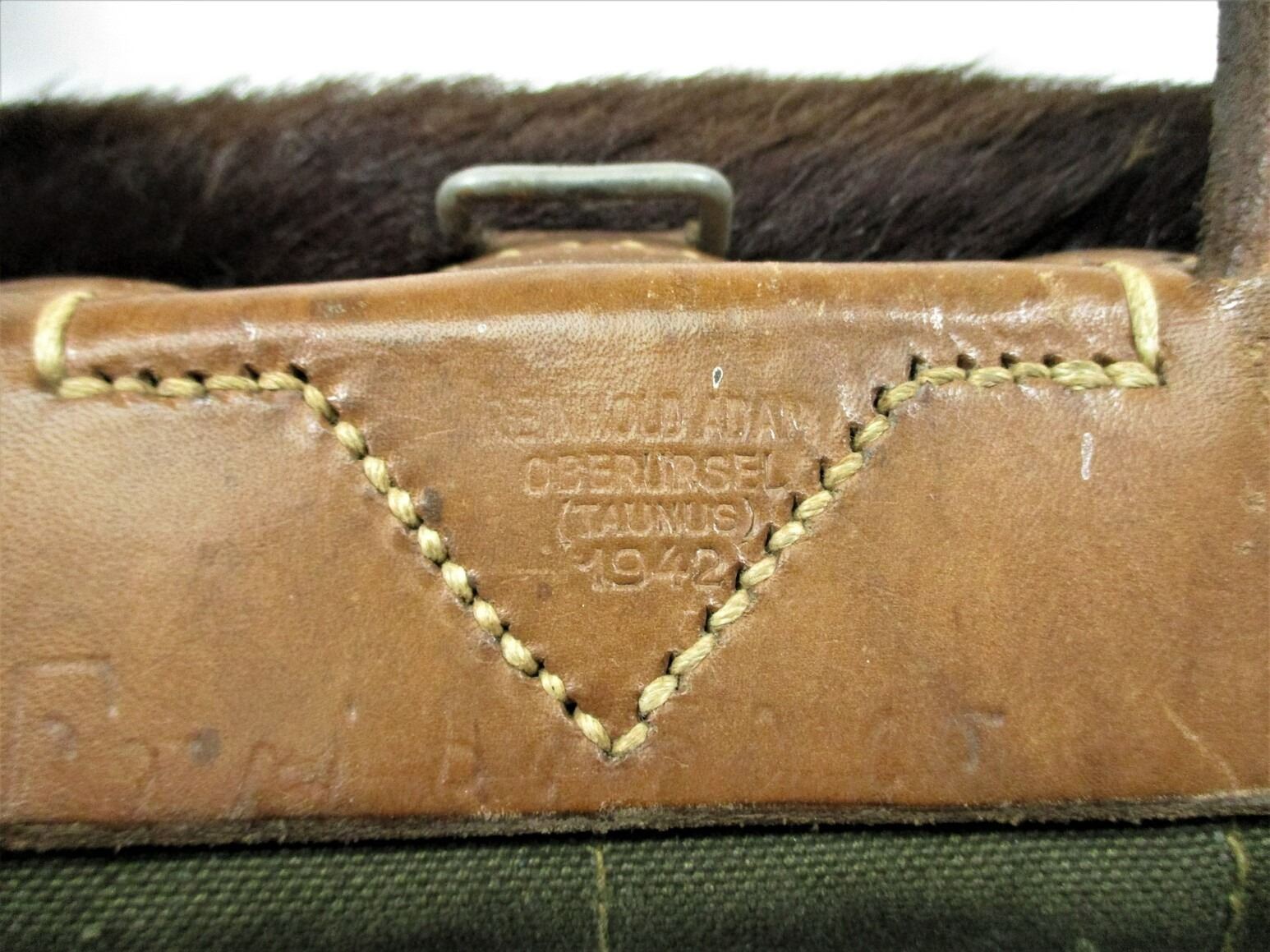 WWII GERMAN M1934 TORINSTER RUCKSACK, (1) GREEN CANVAS WITH LEATHER STRAPS, ALUMINIUM FITTINGS, COW-HIDE FLAP, MARKED: "REINHOLD ADAM, OBERUREL (TAUNUS)" OVER "1942", INSIDE CANVAS POUCH IS DAMAGED. SEE PHOTOS.