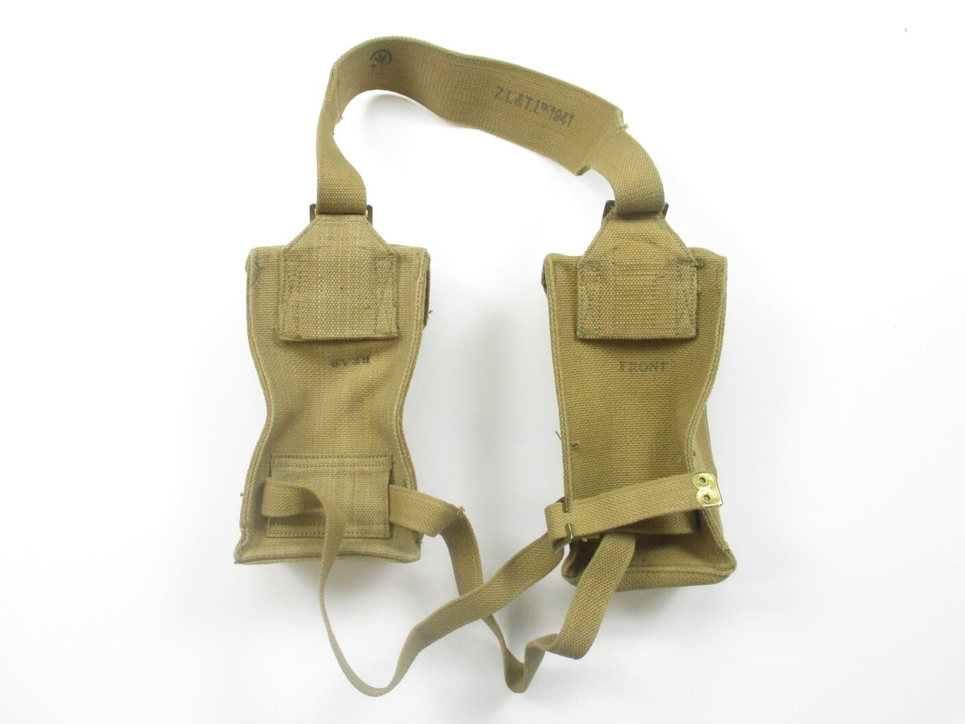 WWII CANADIAN P37 BREN LMG AMMO POUCH LOT, LOT INCLUDES; (2) AMMO POUCHES WITH BELT LOOP & METAL FITTINGS, ONE MARKED: "FRONT", "Z.L.&T.LTD. 1940" & C-BROAD ARROW, ONE MARKED: "BACK", "Z.L.&T.LTD. 1940" & C-BROAD ARROW, SHOULDER STRAP MARKED: ""Z.L.&T.LTD. 1941" & C-BROAD ARROW. SEE PHOTOS.