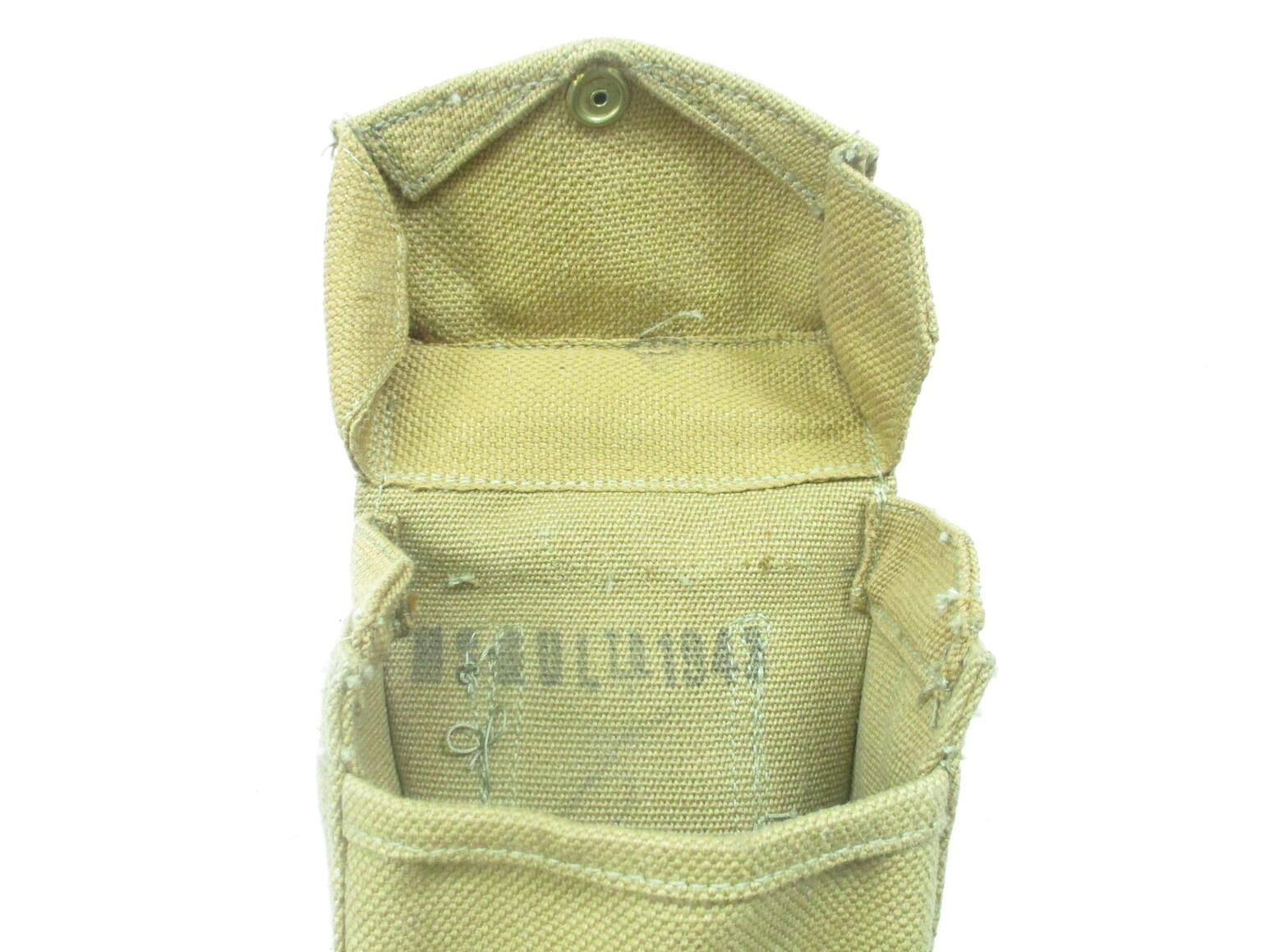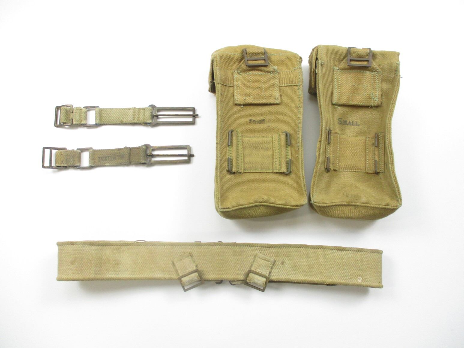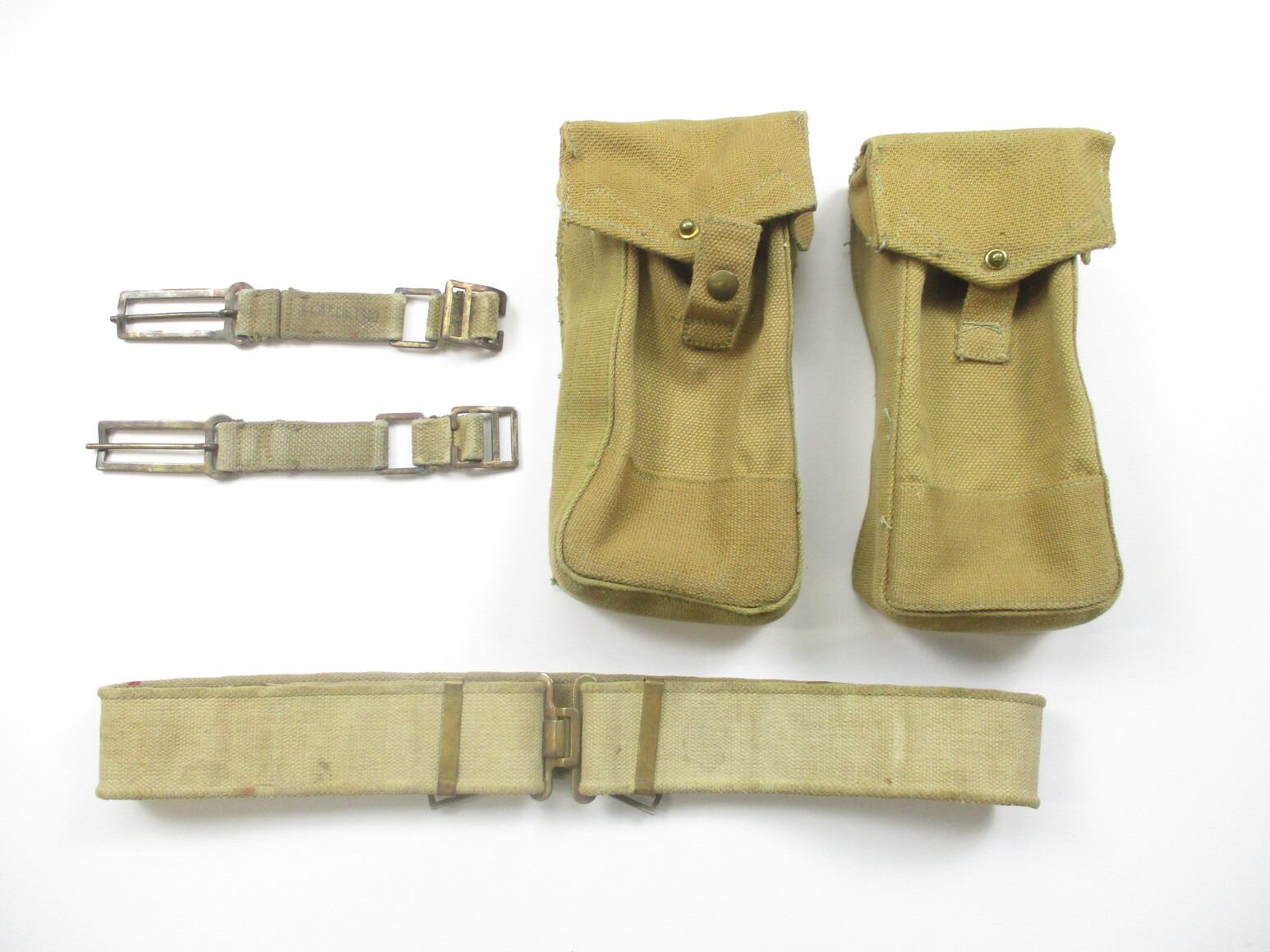 ASSORTED WWII CANADIAN MILITARY P37 WEBBING LOT, LOT INCLUDES; (2) AMMO POUCHES WITH METAL FITTINGS & BELT HOOKS, MARKED: "M.S.&U.LTD 1943", "SMALL" & C-BROAD ARROW, (2) BRACE ATTACHMENTS, MARKED: "Z.L.&T.LTD 194?" & (1) BELT, NO VISIBLE MARKINGS, OAL APPROX. 44", ADJUSTABLE. SEE PHOTOS.