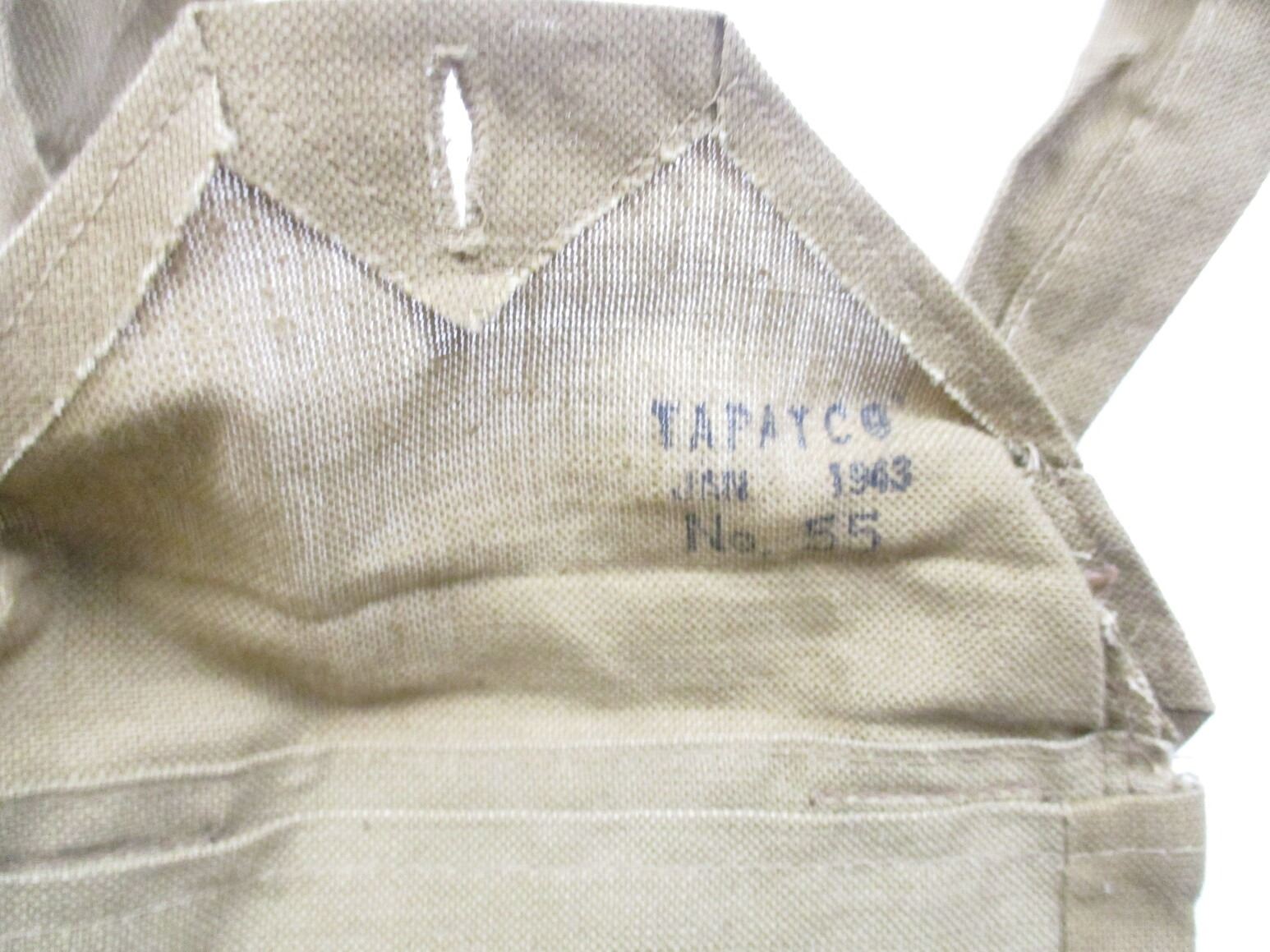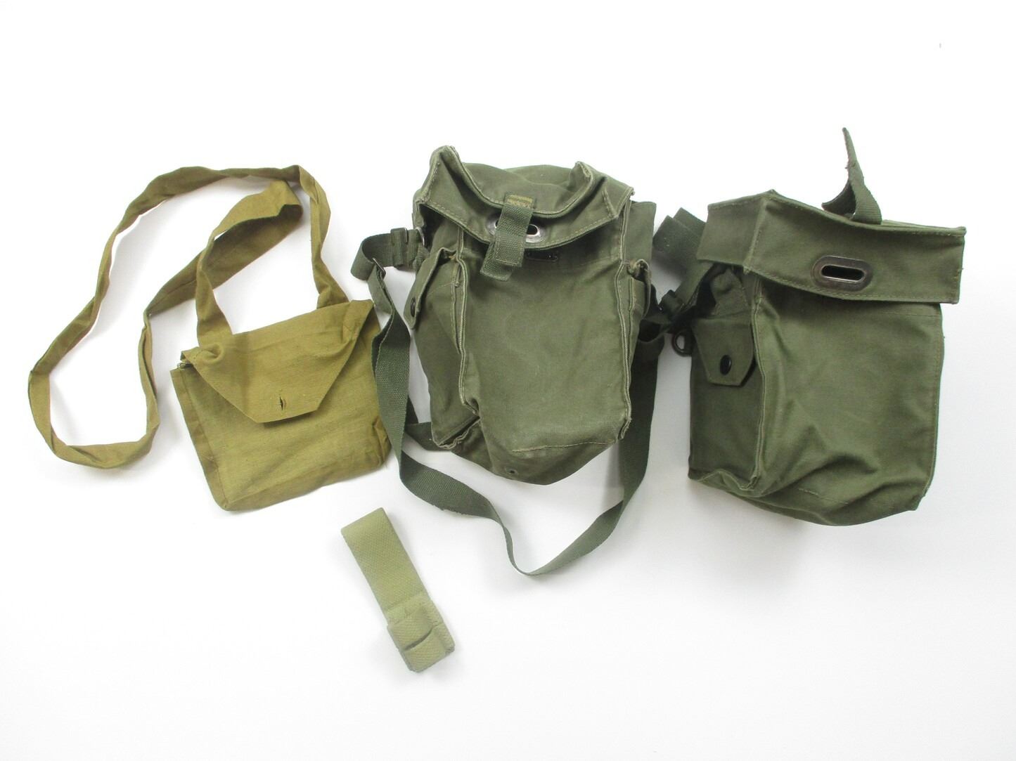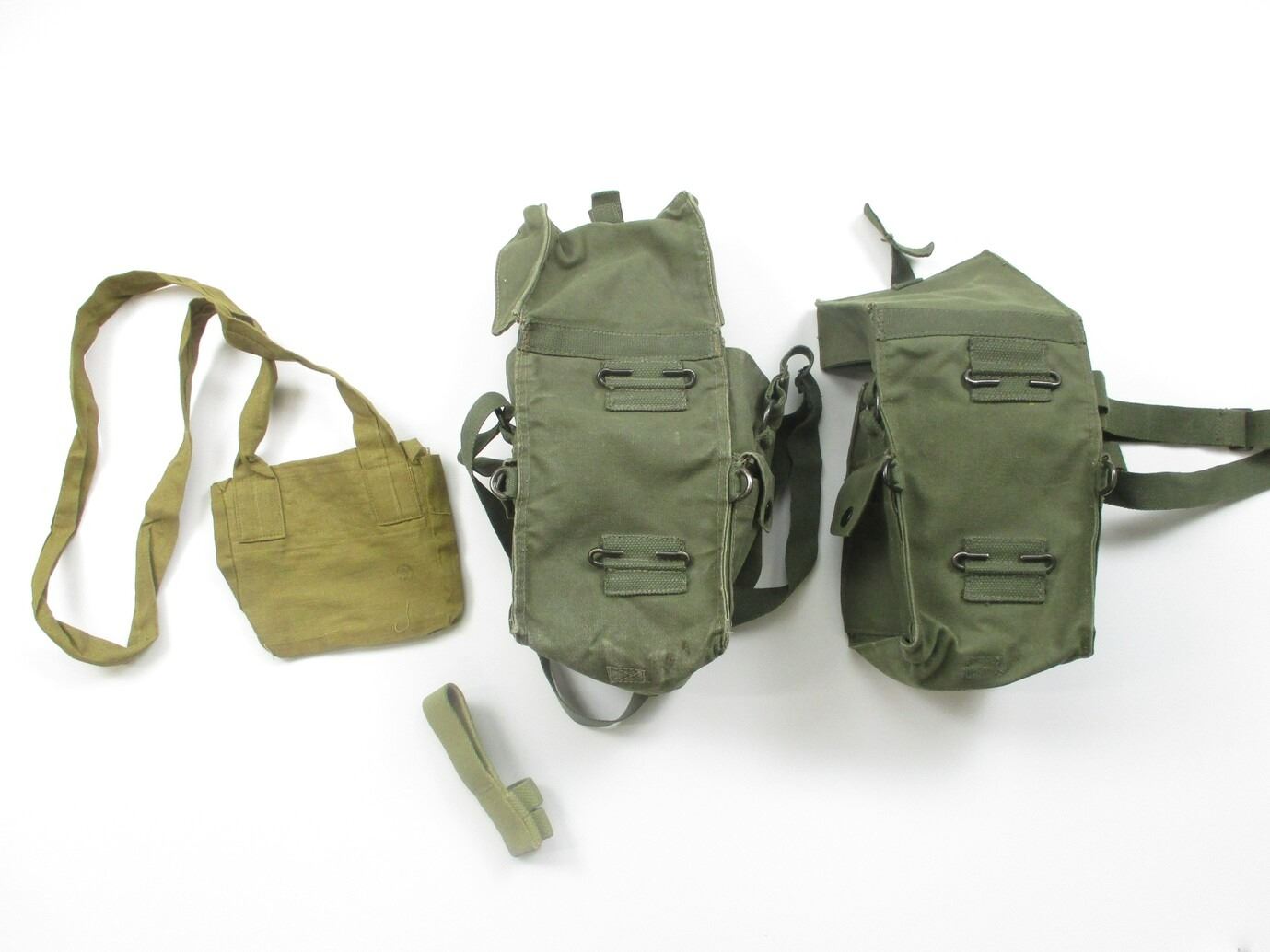 ASSORTED WWII / POSTWAR CANADIAN MILITARY WEBBING LOT, LOT INCLUDES; (1) CANVAS BOYES 55 CAL. BANDOLIER WITH SHOULDER STRAP, MARKED: "TAPATCO, JAN 1943, NO.55" & C-BROAD ARROW, (2) GREEN CANVAS GAS MASK BAGS WITH SHOULDER STRAP & BELT HOOKS, MARKED: "MSU-7241-55" & MAPLE LEAF PROOF & (1) GREEN FROG, NO VISIBLE MARKINGS. SEE PHOTOS.