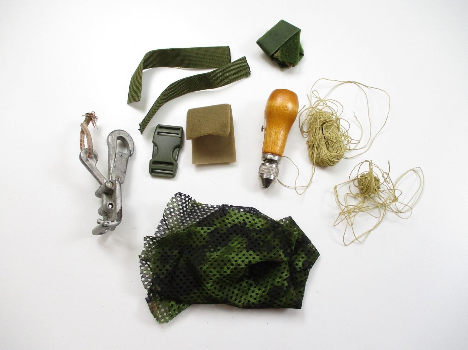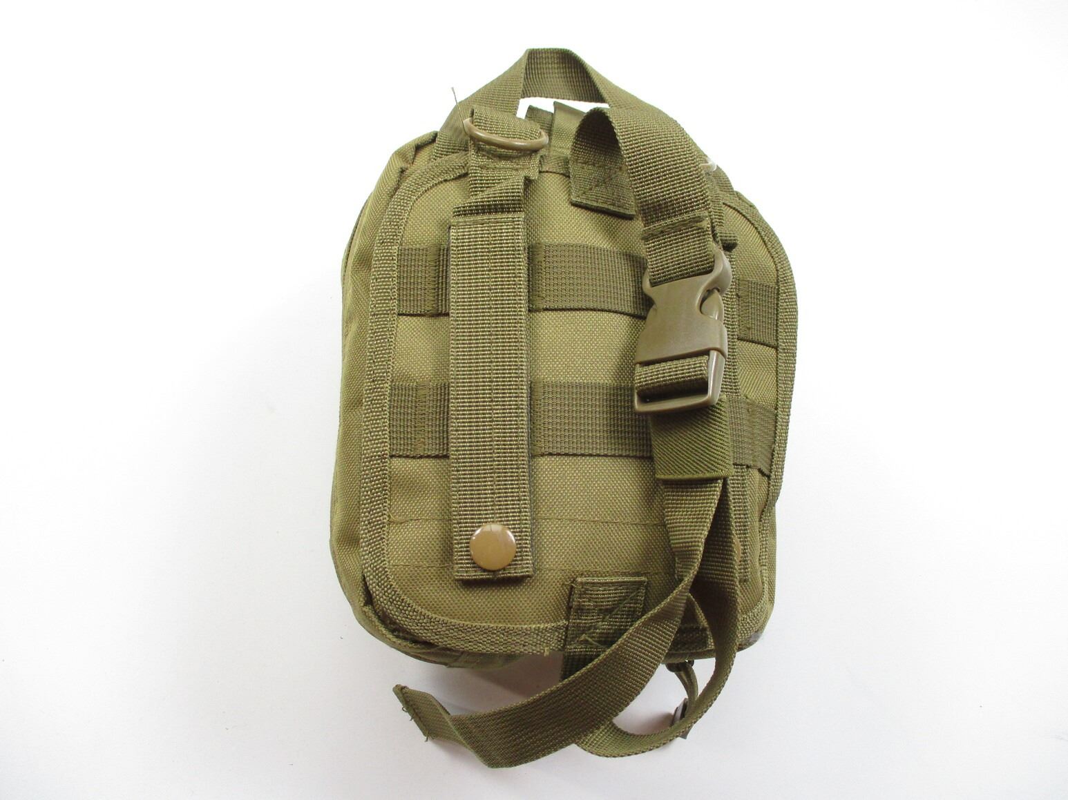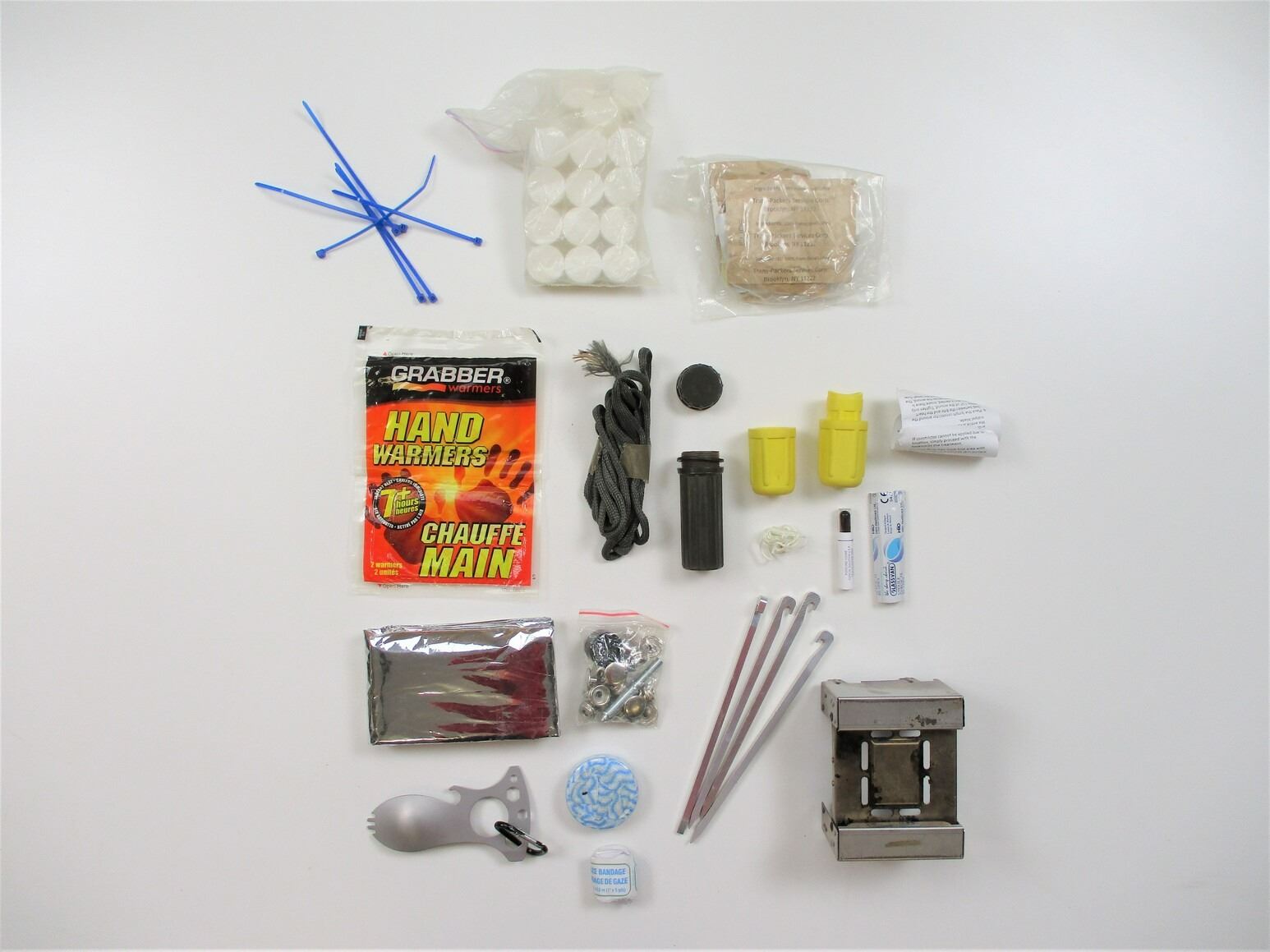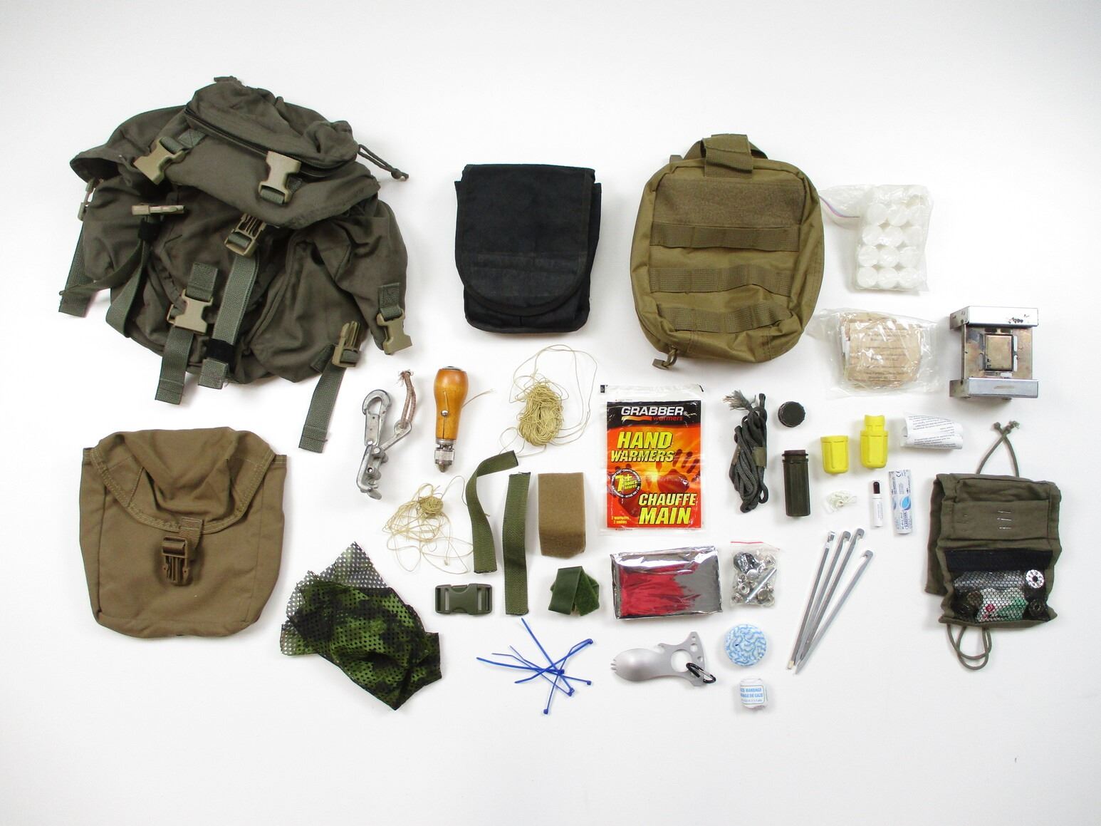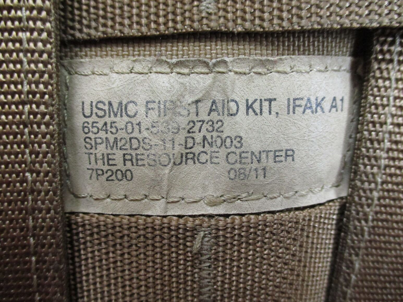ASSORTED MILITARY POUCH LOT, LOT INCLUDES; (1) TAN SURVIVAL POUCH WITH SURVIVAL KIT & SUPPLIES, (1) BLACK POUCH WITH REPAIR TYPE ITMS INSIDE, (1) TAN POUCH, MARKED: USMC, FIRST AID KIT, IFAK AI, 6545-01-539-2732", ETC. & (1) BROWN POUCH MARKED: "GEN PURPOSE BUTT PACK, 8415-01-530-8388", ETC. SEE PHOTOS.