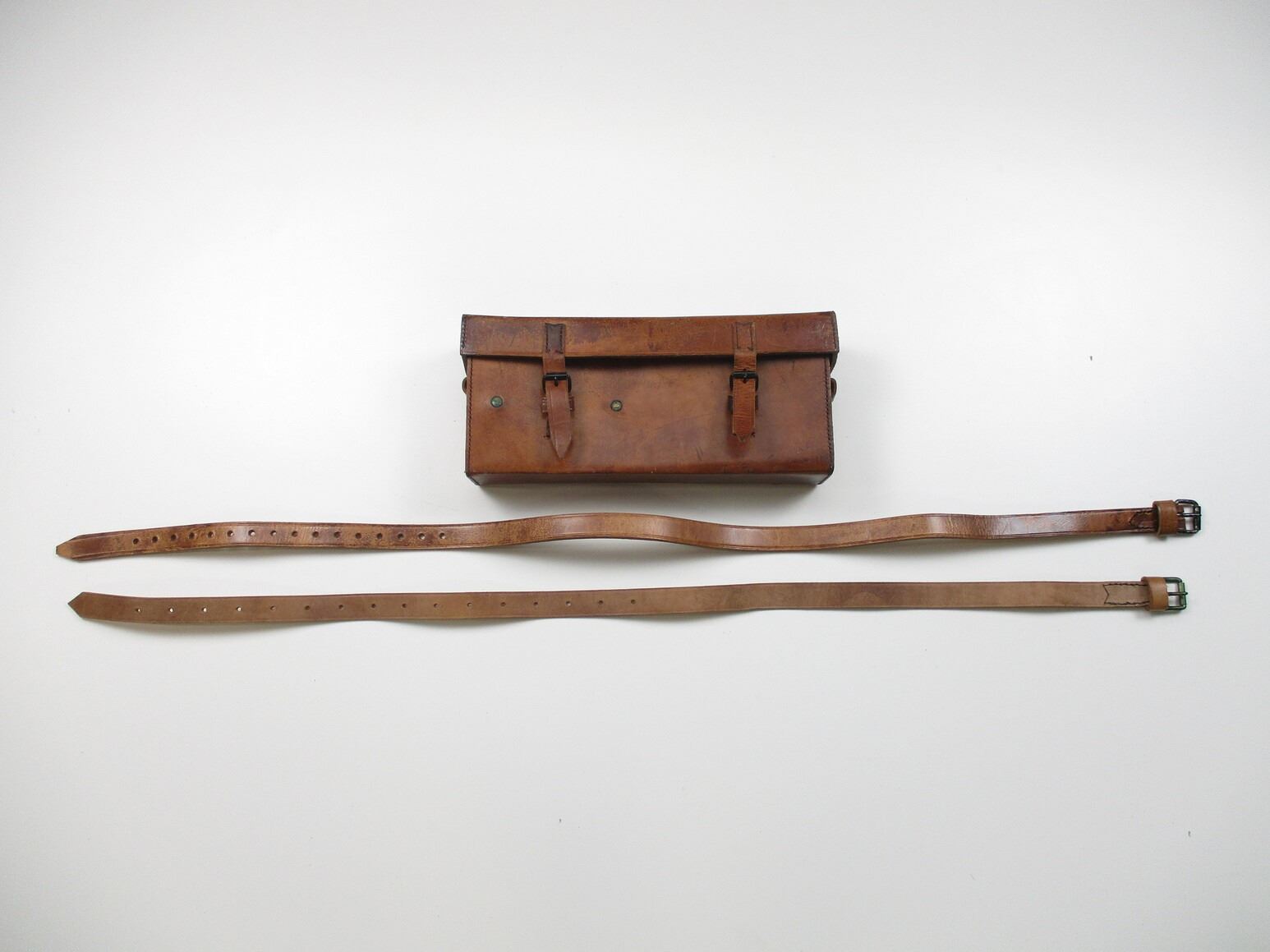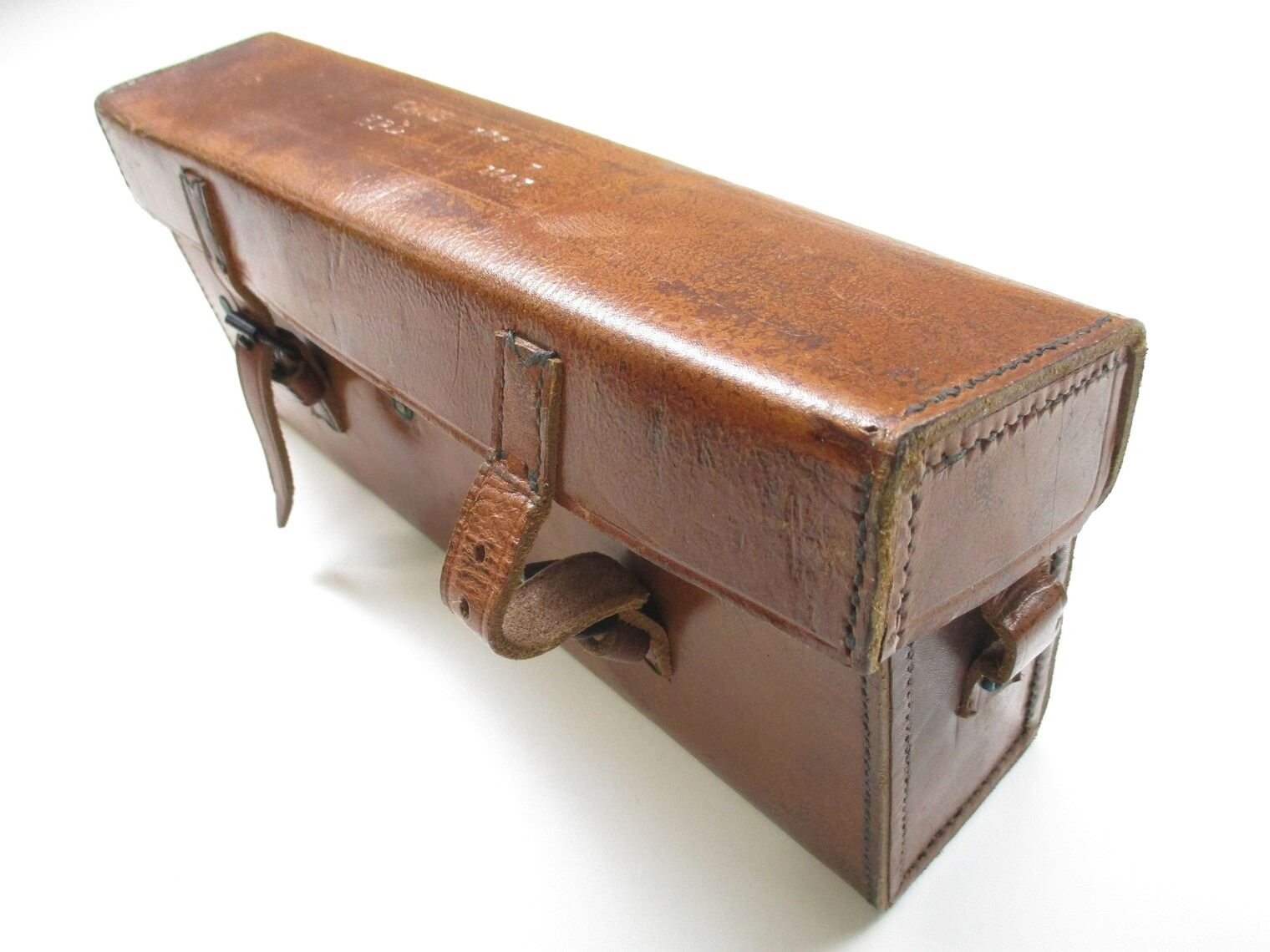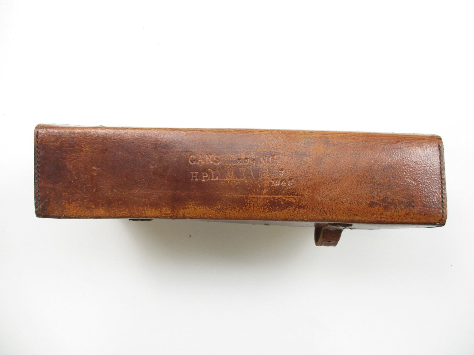 WWII BRITISH MILITARY .303 MG CAN POUCH, (1) BROWN LEATHER POUCH, MARKED: "CANS, HPL, .303 MG, 7 1945" WITH (2) BROWN LEATHER STRAPS, ONE OAL APPROX. 40" & OTHER ONE OAL APPROX. 43", NO VISIBLE MARKINGS. SEE PHOTOS.