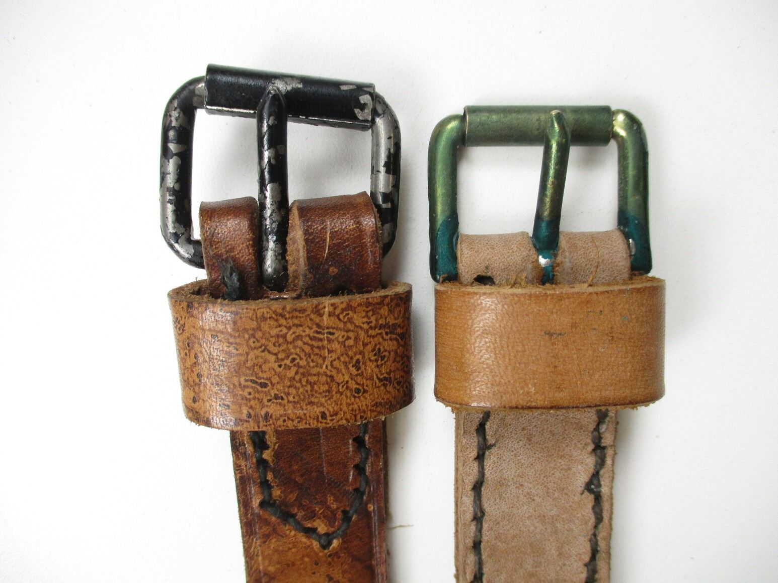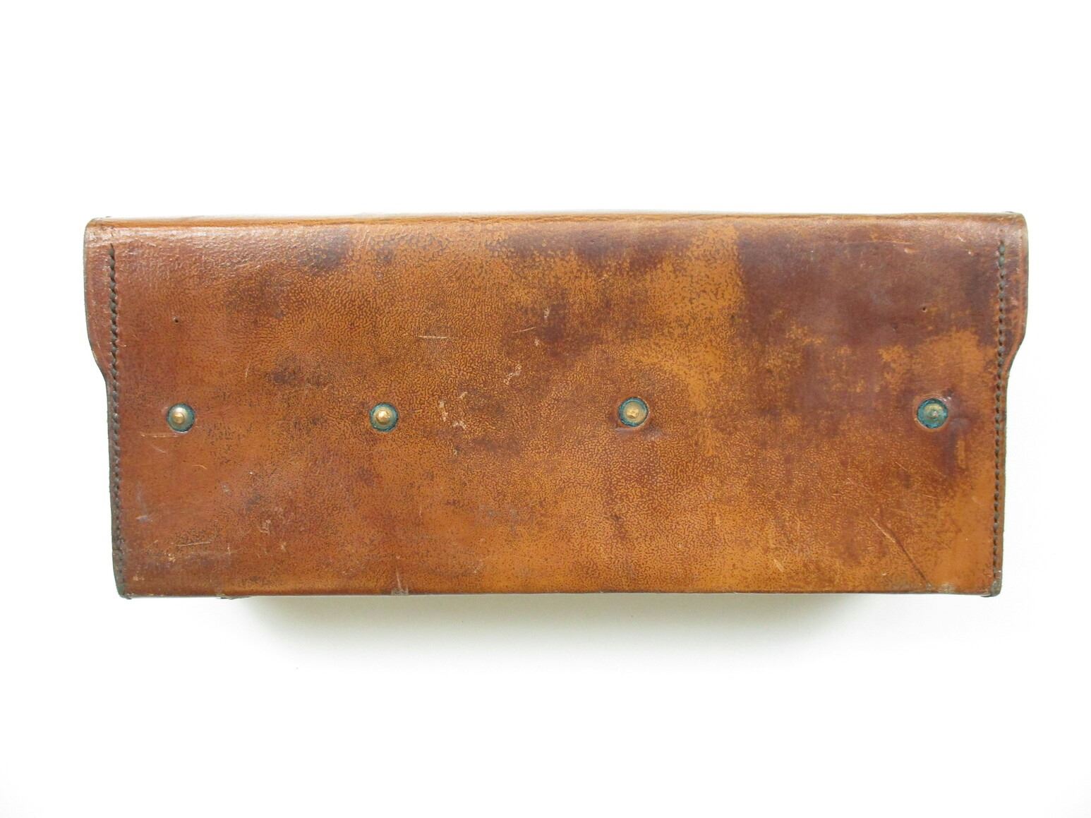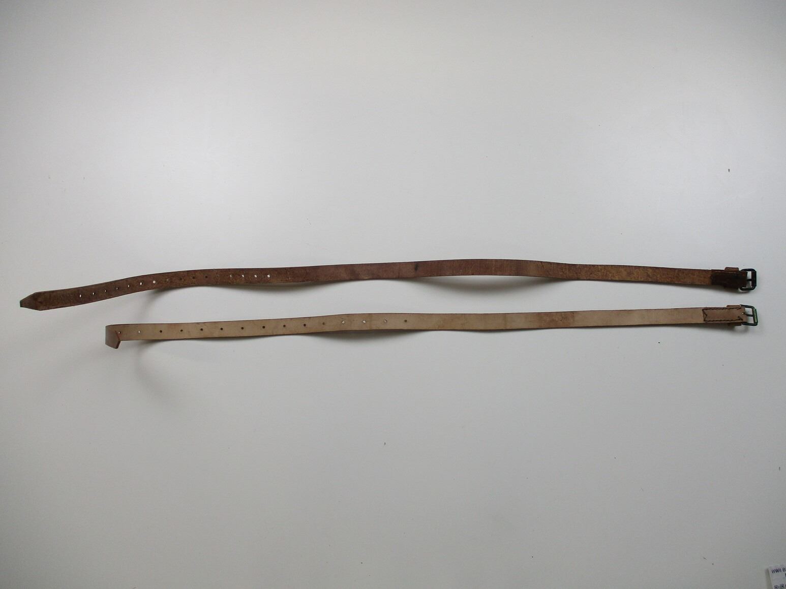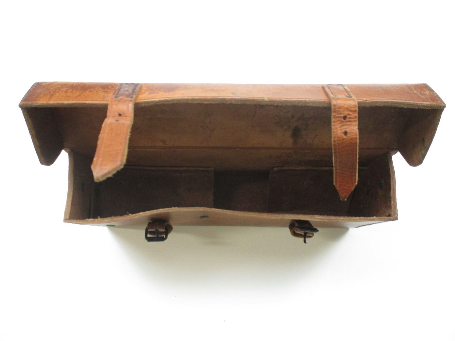 WWII BRITISH MILITARY .303 MG CAN POUCH, (1) BROWN LEATHER POUCH, MARKED: "CANS, HPL, .303 MG, 7 1945" WITH (2) BROWN LEATHER STRAPS, ONE OAL APPROX. 40" & OTHER ONE OAL APPROX. 43", NO VISIBLE MARKINGS. SEE PHOTOS.