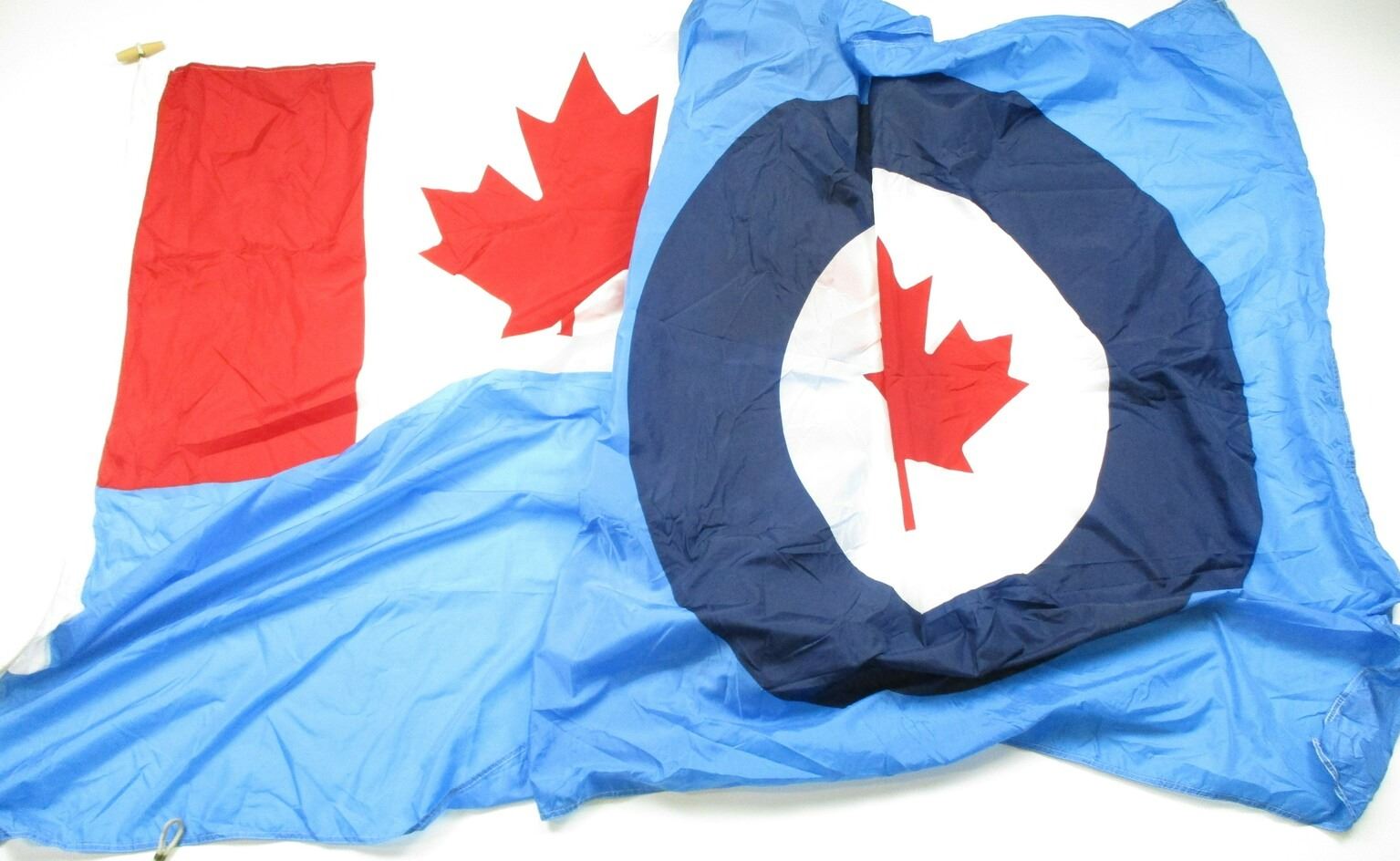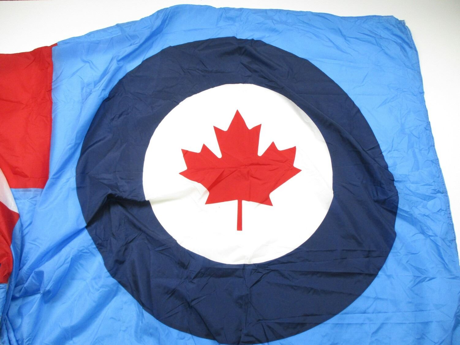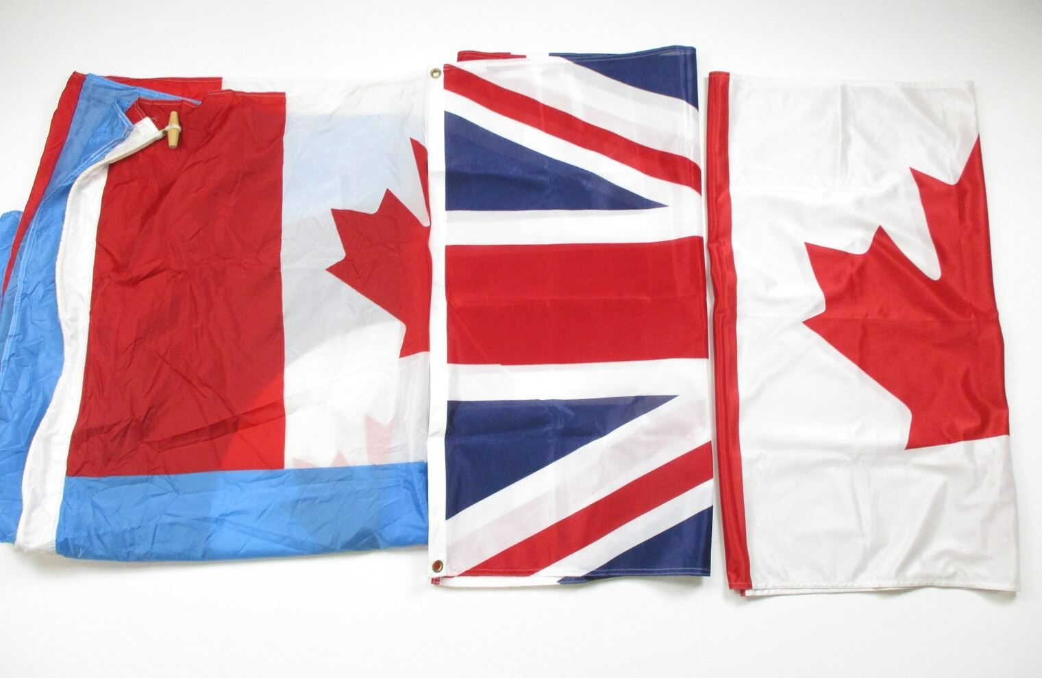 ASSORTED CANADIAN / BRITISH FLAG LOT, LOT INCLUDES; (1) RCAF FLAG, APPROX. 102" L X 48", (1) CANADIAN FLAG, APPROX. 70" L X 34" H & (1) BRITISH FLAG, APPROX. 72" L X 34" H. SEE PHOTOS.