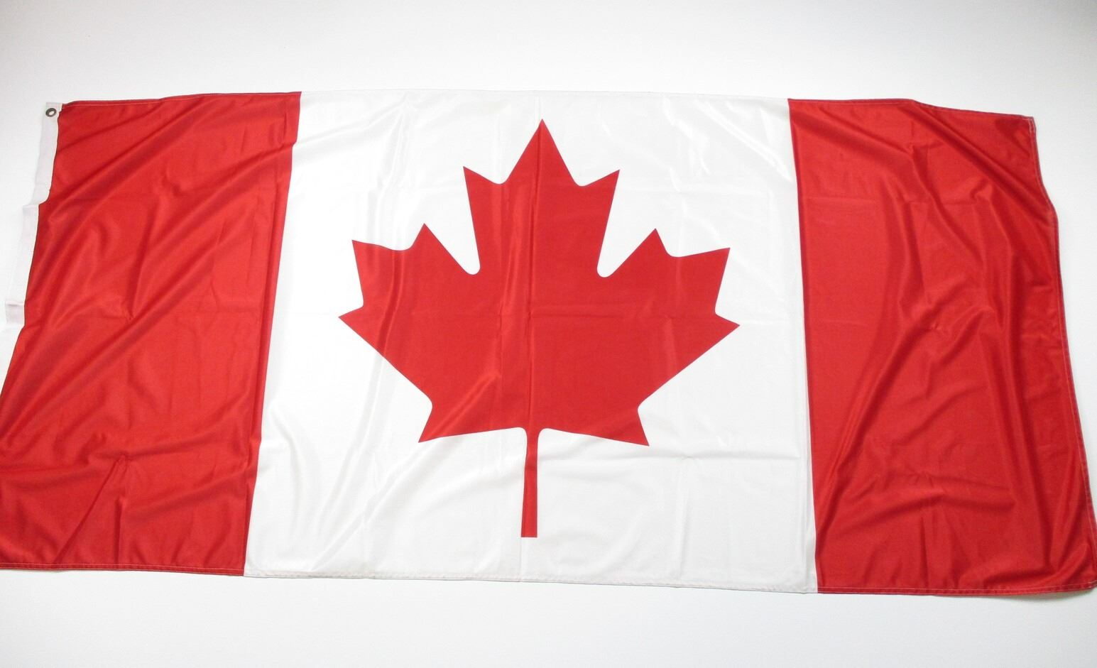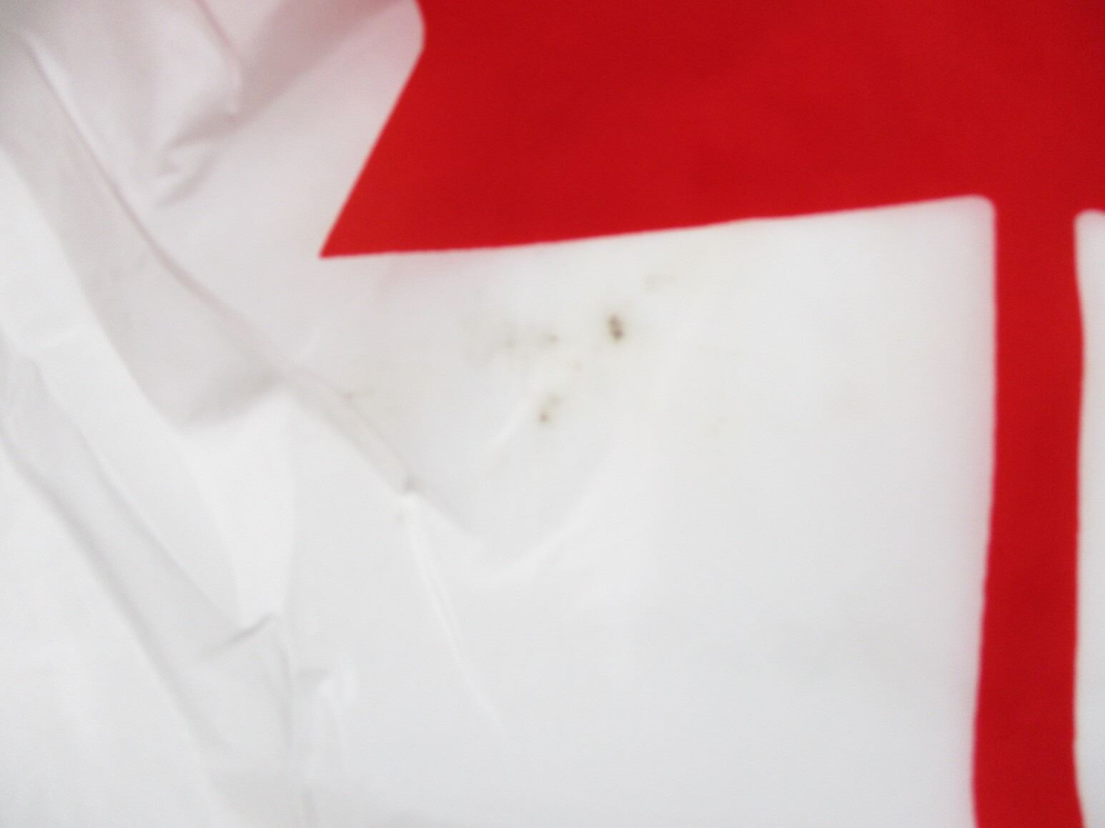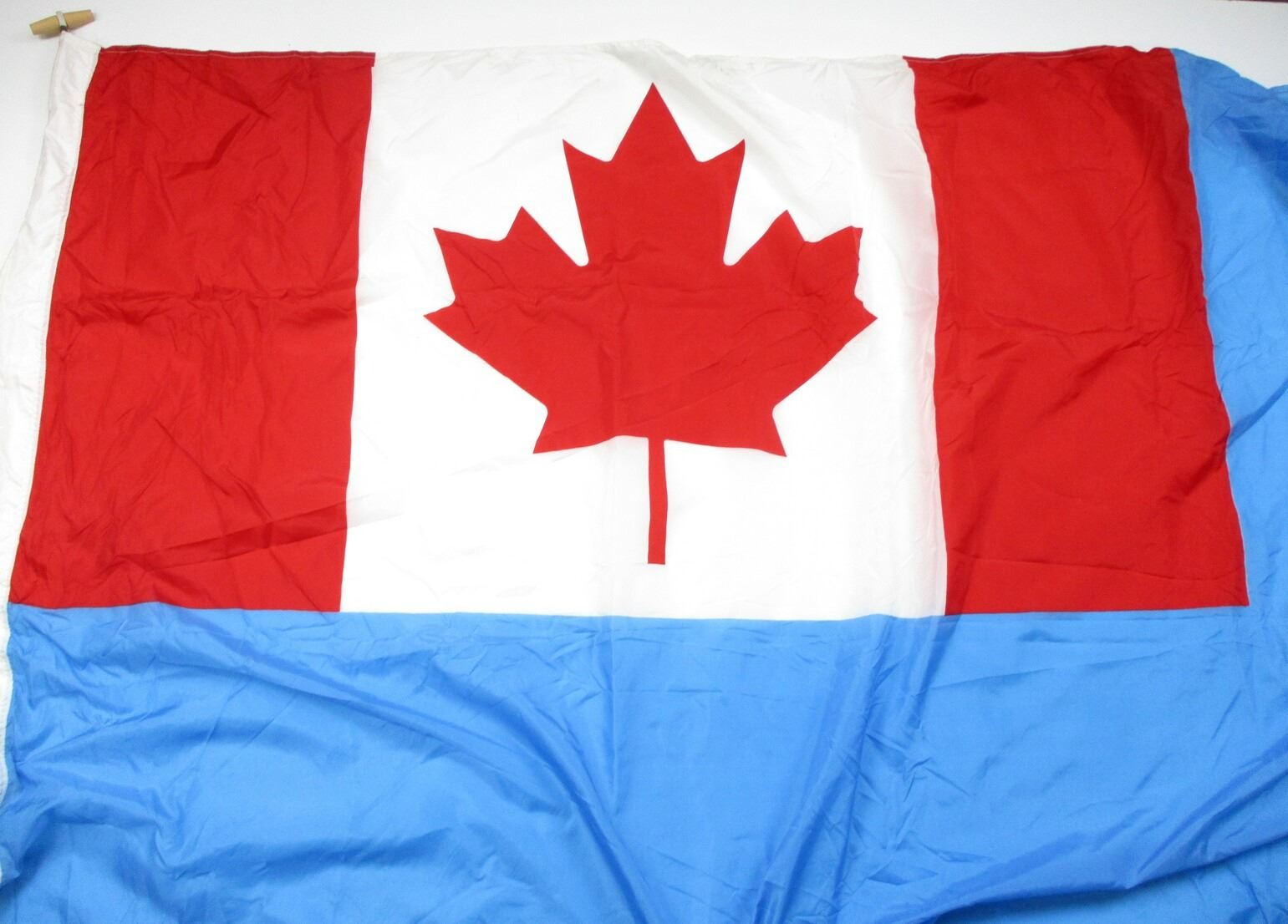 ASSORTED CANADIAN / BRITISH FLAG LOT, LOT INCLUDES; (1) RCAF FLAG, APPROX. 102" L X 48", (1) CANADIAN FLAG, APPROX. 70" L X 34" H & (1) BRITISH FLAG, APPROX. 72" L X 34" H. SEE PHOTOS.