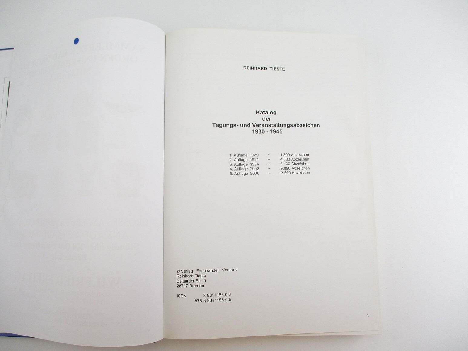 "TAGUNHGS- UND VERANSTALTUNGSABZEICHEN 1930-1945, BAND 1" BOOK, (1) CONFERENCE AND EVENT BADGES 1930-1945, VOLUME 1, A - K, 5TH EDITION, BY VERLAG REINHARD TIESTE, HARD COVER, ISBN: 978-9811185-0-6. SEE PHOTOS.