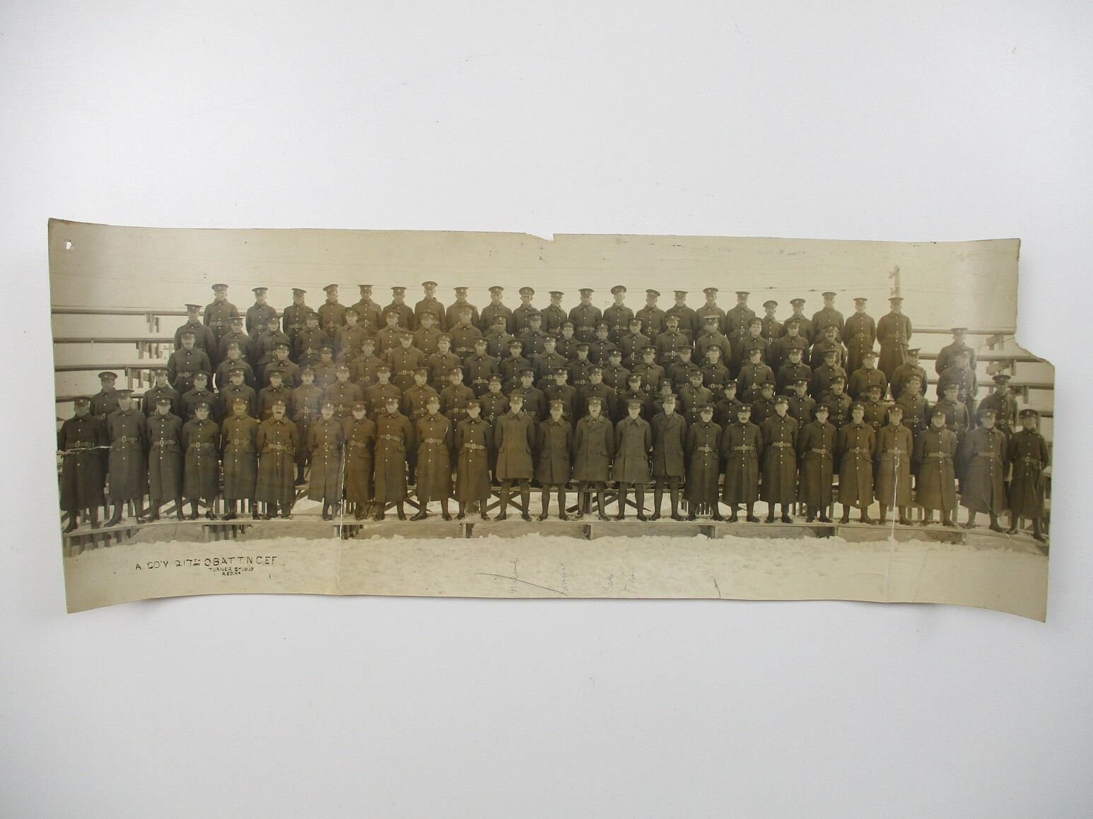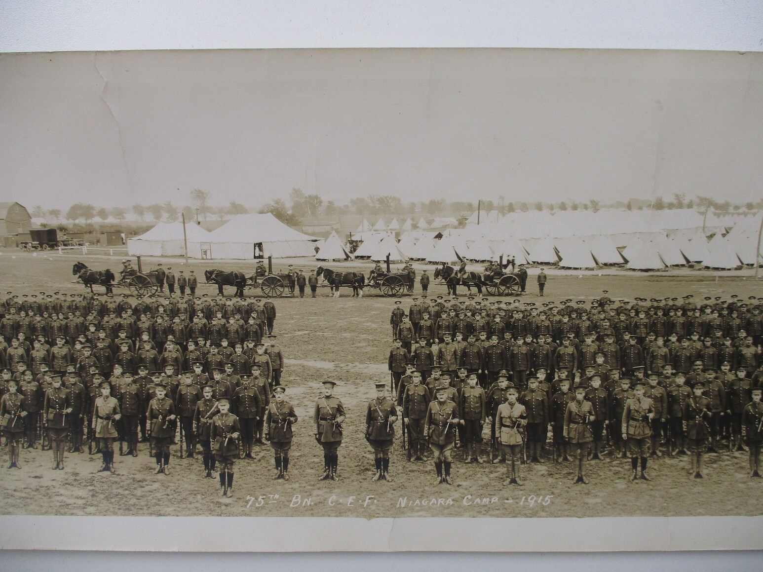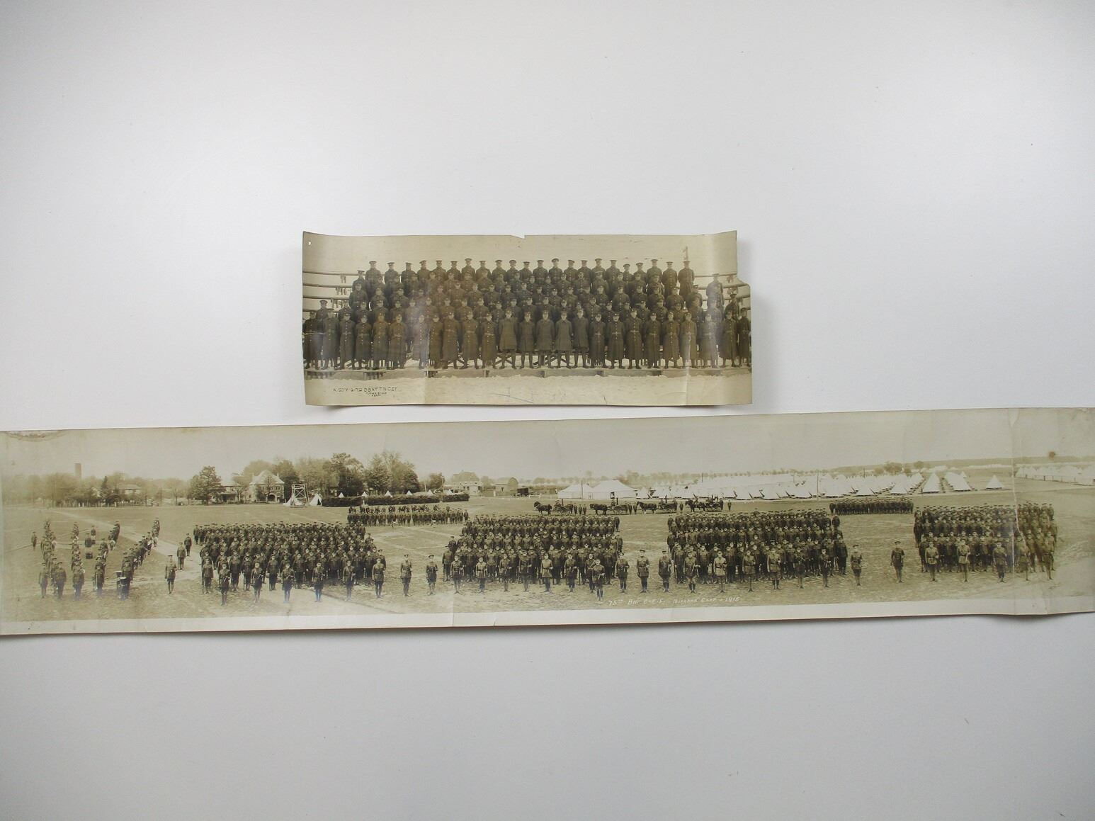 WWI CANADIAN MILITARY PHOTO LOT, BLACK & WHITE PHOTOS, LOT INCLUDES; (1) C.E.F. 75TH BATTALION, NIAGARA CAMP 1915, SHOWING BAND, FOUR COMPANIES, FOUR COOKING WAGONS, TWO MACHINE GUNS ON TRIPODS, APPROX. 46.5" X 8" & (1) "A" COMPANY, C.E.F. 217TH BATTALION , A FEW NAMED, APPROX. 18" X 6.5". SEE PHOTOS.