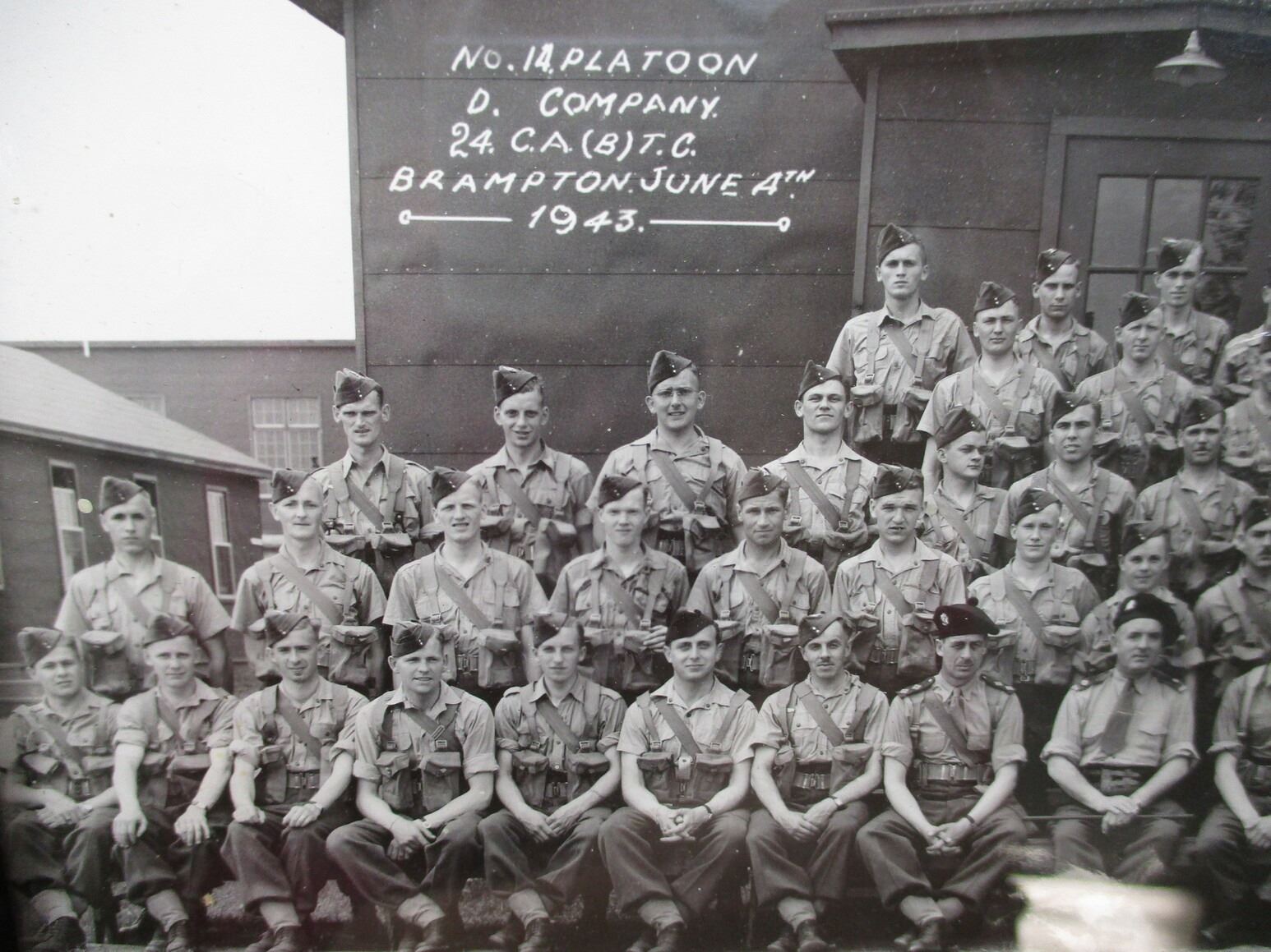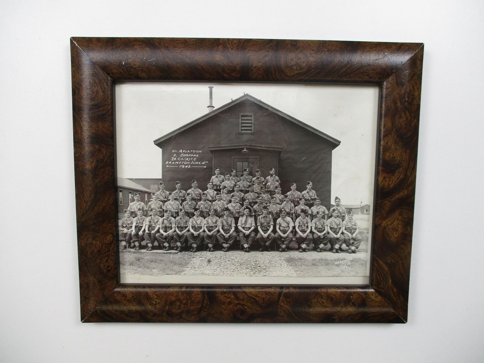 WWII CANADIAN MILITARY PHOTO AND FRAME LOT, (1) BLACK & WHITE PHOTO IN FRAME, NO. 14 PLATOON "D" COMPANY, 24 C.A.(B)T.C., BRAMPTON, JUNE 1943, APPROX. 12.5" X 10.5". SEE PHOTOS. *NO GUARANTEE ON GLASS FOR SHIPPING*
