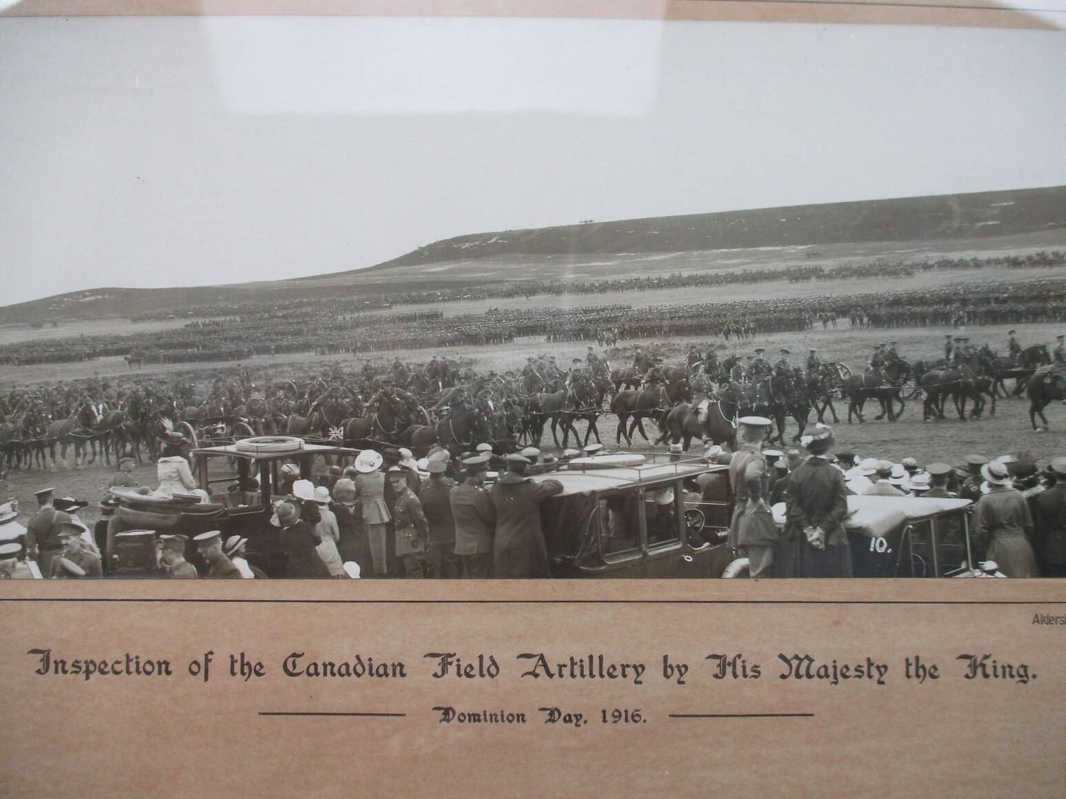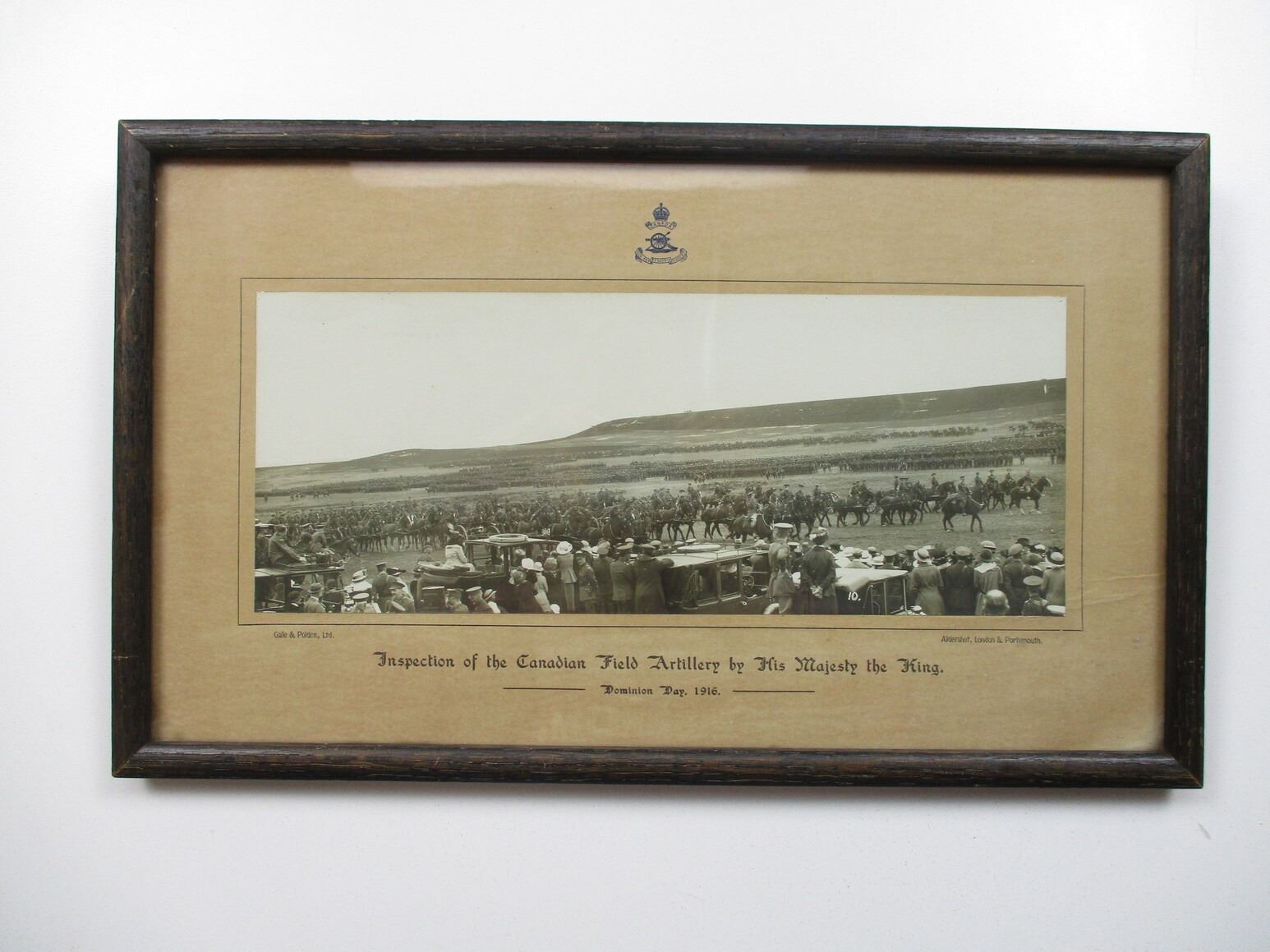WWI CANADIAN MILITARY PHOTO AND FRAME LOT, (1) BLACK & WHITE PHOTO IN FRAME, CANADIAN FIELD ARTILLERY INSPECTION BY HIS MAJESTY THE KING, DOMINION DAY, 1916, APPROX. 15.25" X 9.25". SEE PHOTOS.*NO GUARANTEE ON GLASS FOR SHIPPING*
