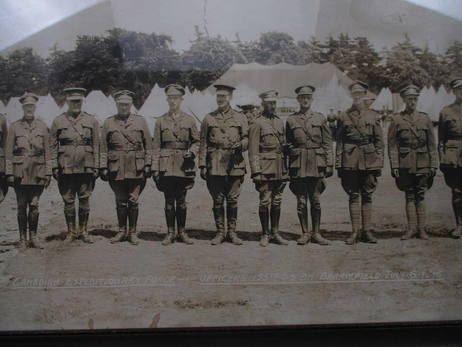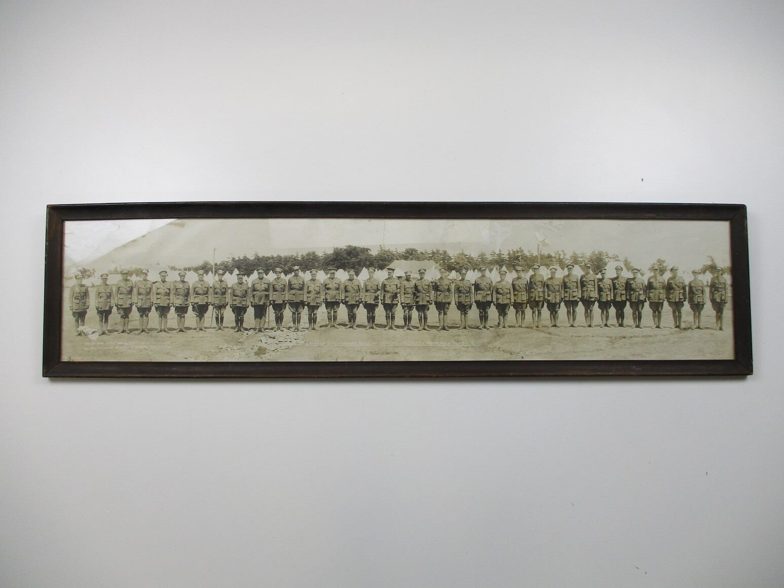 WWI CANADIAN MILITARY PHOTO AND FRAME LOT, (1) BLACK & WHITE PHOTO IN VINTAGE WOOD FRAME, C.E.F. OFFICERS, 155TH O.S. BN., BARRIE FIELD, JULY 1916, APPROX. 43.5" X 11". SEE PHOTOS. *NO GUARANTEE ON GLASS FOR SHIPPING*
