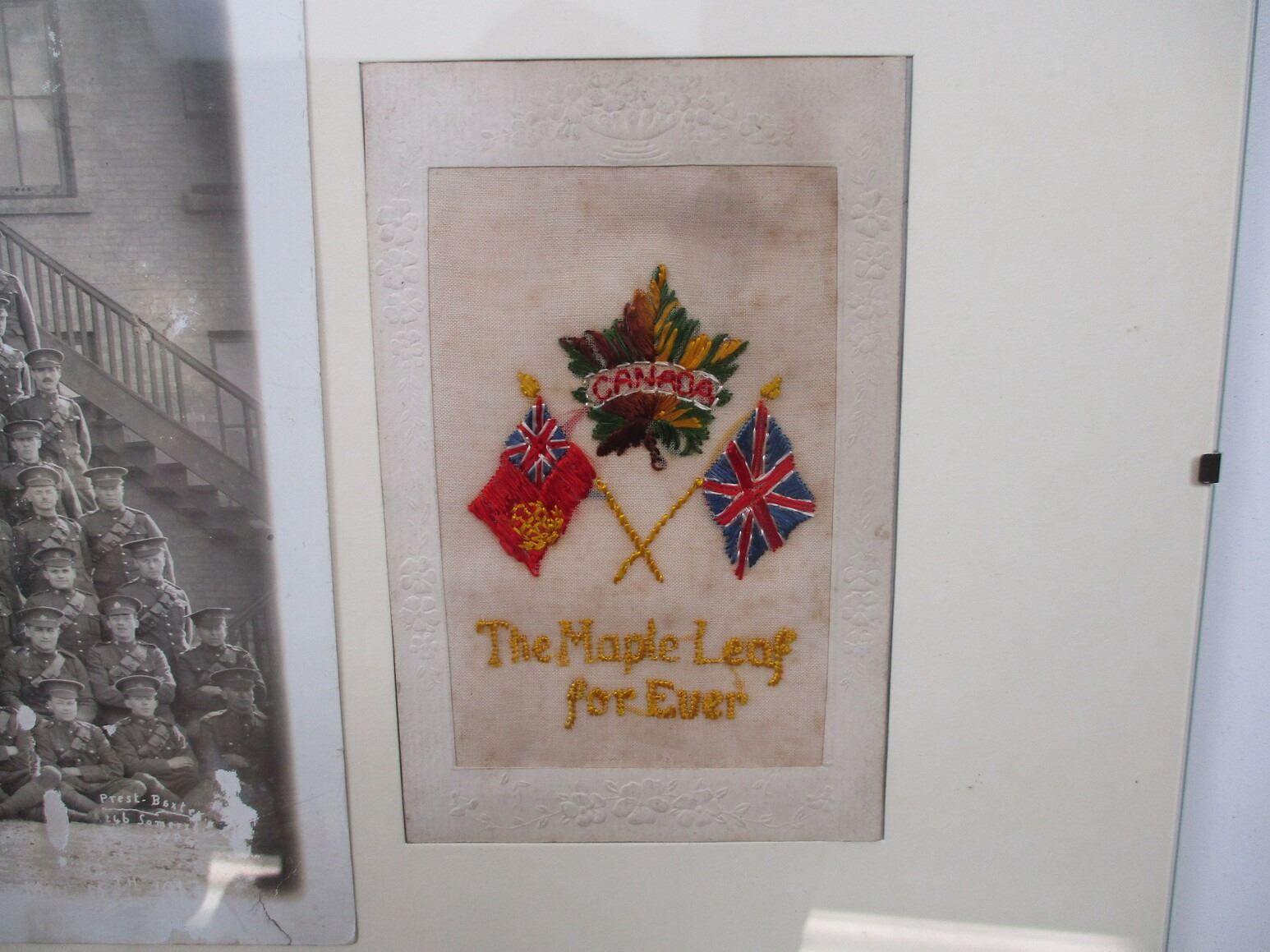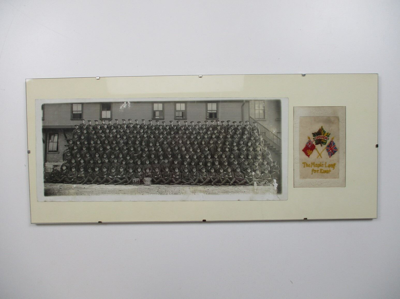 WWI CANADIAN MILITARY PHOTO, ETC. LOT, LOT INCLUDES; (1) GLASS COVERED BLACK & WHITE PHOTO, 0TH REINFORCEMENT DRAFT, NO.1 OVERSEAS C.A.S.C. TRAINING, WINNIPEG 1917, GLASS APPROX. 23.75" X 9.75", PHOTO APPROX. 16.75" X 7.75" & (1) "THE MAPLE LEAF FOREVER" PATCH, NEEDLEWORK FLAGS & MAPLE LEAF, APPROX. 3.5" X 5.5". SEE PHOTOS. *NO GUARANTEE ON GLASS FOR SHIPPING*
