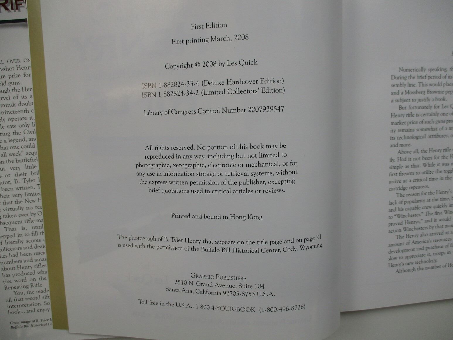 "THE HENRY RIFLE" BOOK, (1) "THE STORY OF BENJAMIN TYLER HENRY AND HIS FAMED REPEATING RIFLE", BY LES QUICK, HARD COVER, ISBN: 978-1-882824-33-5. SEE PHOTOS.