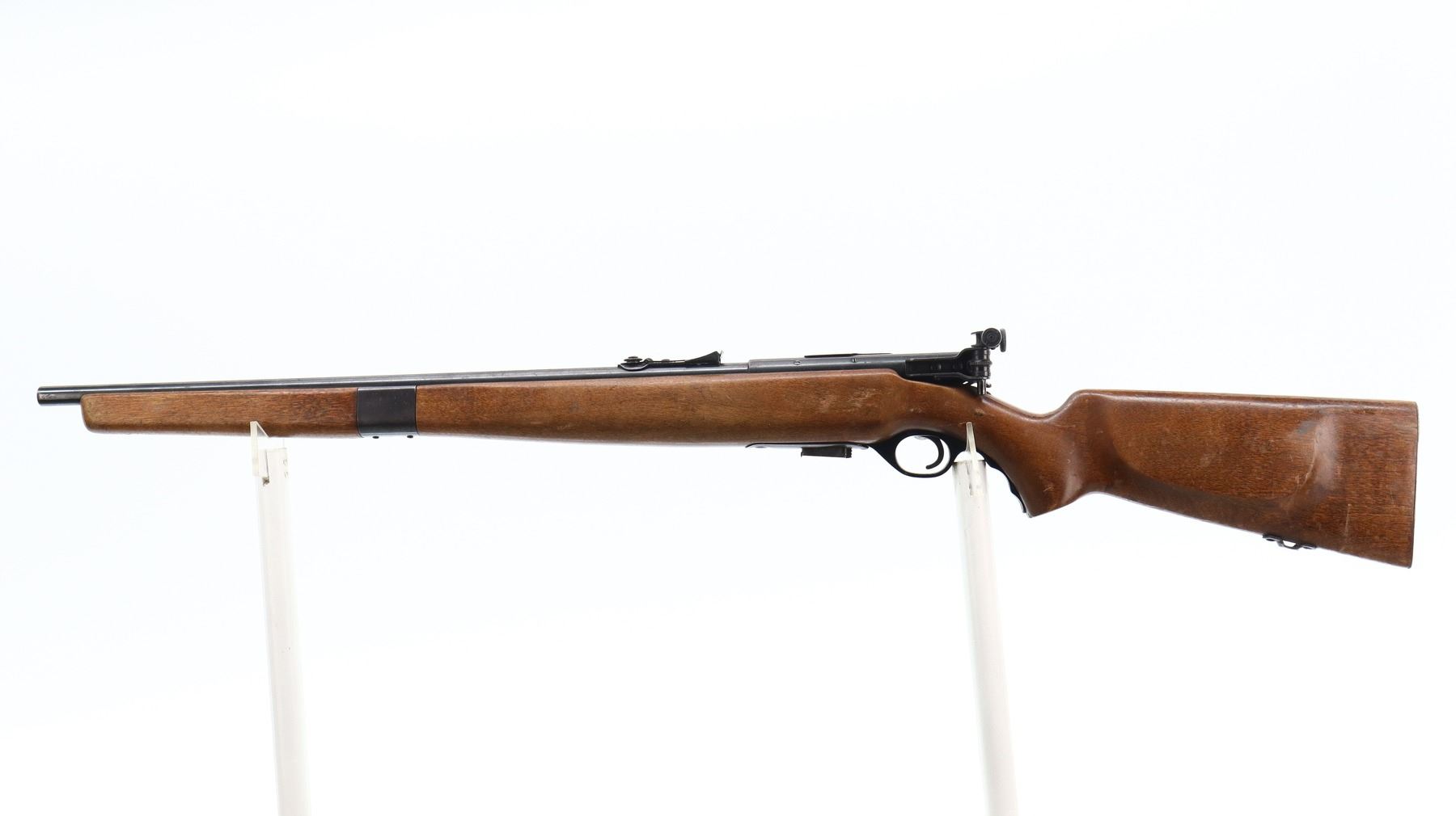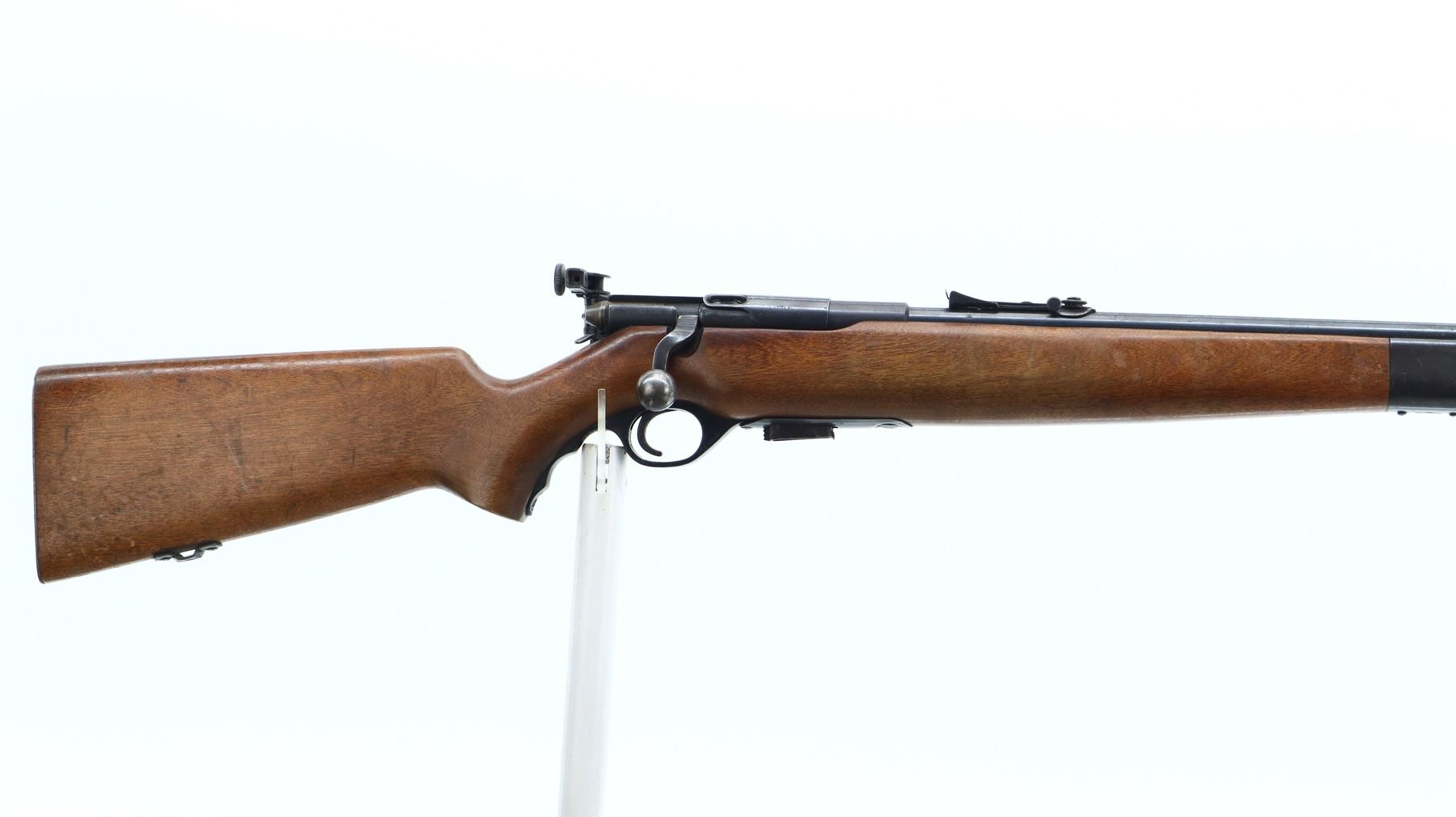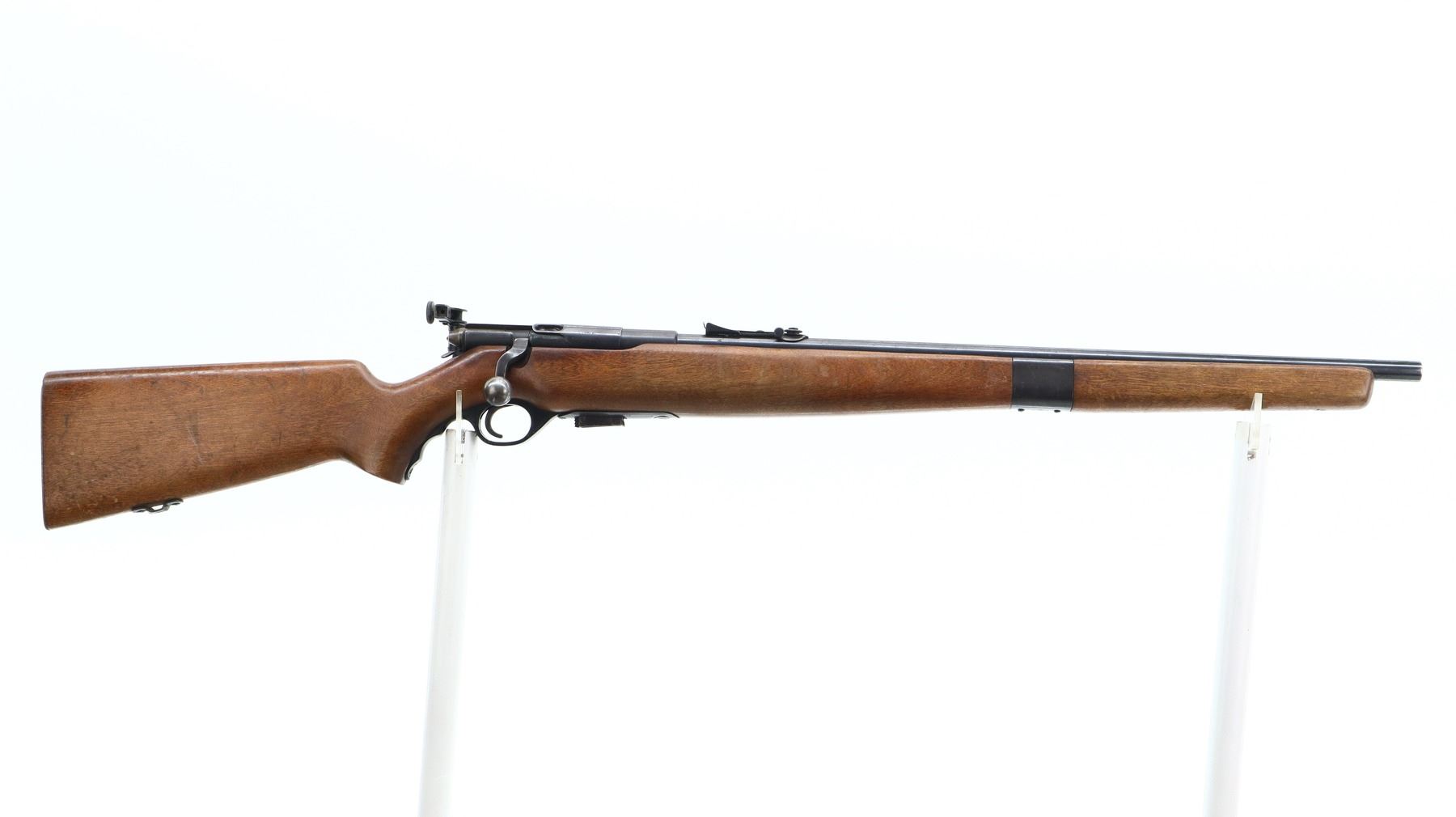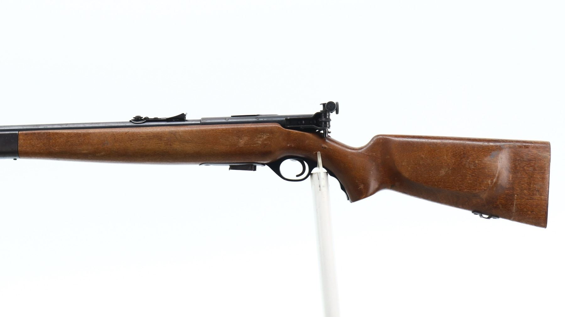 4/10, MOSSBERG, MODEL: 42M (B), CALIBER:22 LR, COMES WITH MAGAZINE, TRIGGER LOCK, BORE IS GOOD. FRONT SIGHT REMOVED, INCLUDED NOT COMPLETE, U NOTCHED REAR SIGHT MISSING ELEVATION SCREW, BLUED FINISH, RECEIVER DRILLED AND TAPPED FOR SCOPE MOUNT, RECEIVER HAS A MOSSBERG S-100 PEEP SIGHT INSTALLED. TWO PIECE SMOOTH FULL LENGTH WOOD STOCK, PISTOL GRIP, CHEEK REST, GROOVED STEEL BUTT PLATE, SWIVEL STUDS. METAL FINISH SHOWS SCRATCHES, HANDLING MARKS AND WEAR. STOCKS SHOW MARKS, SCRATCHES AND WEAR. , ACTION: BOLT ACTION RIFLE, BARREL LENGTH: 23.25", SERIAL # NA, CONDITION: 4/10, CLASS: CANADIAN NON RESTRICTED