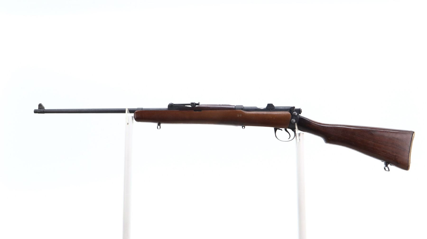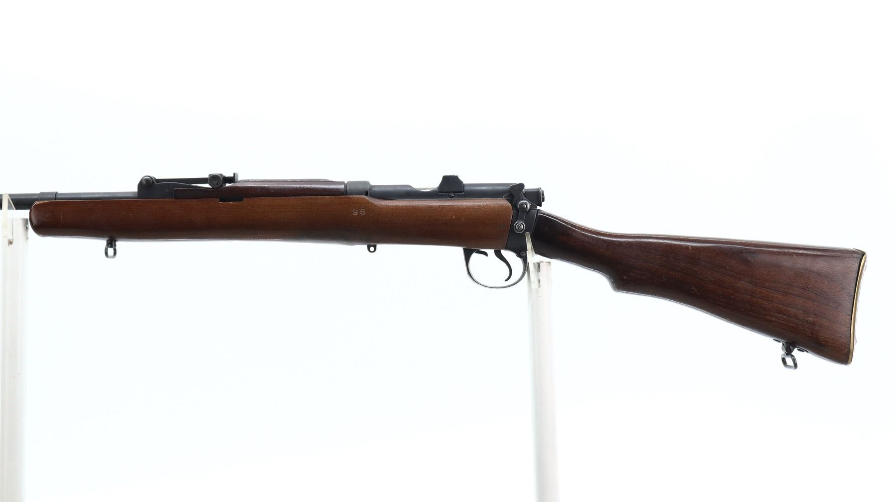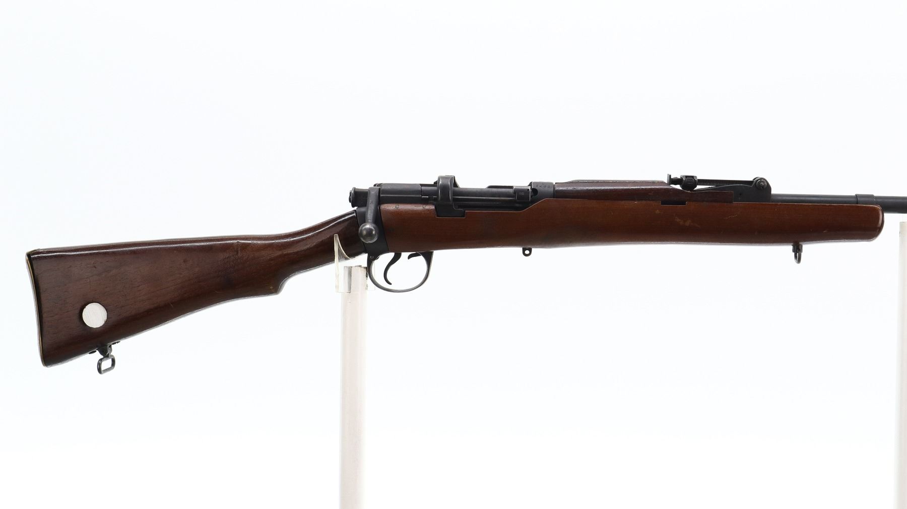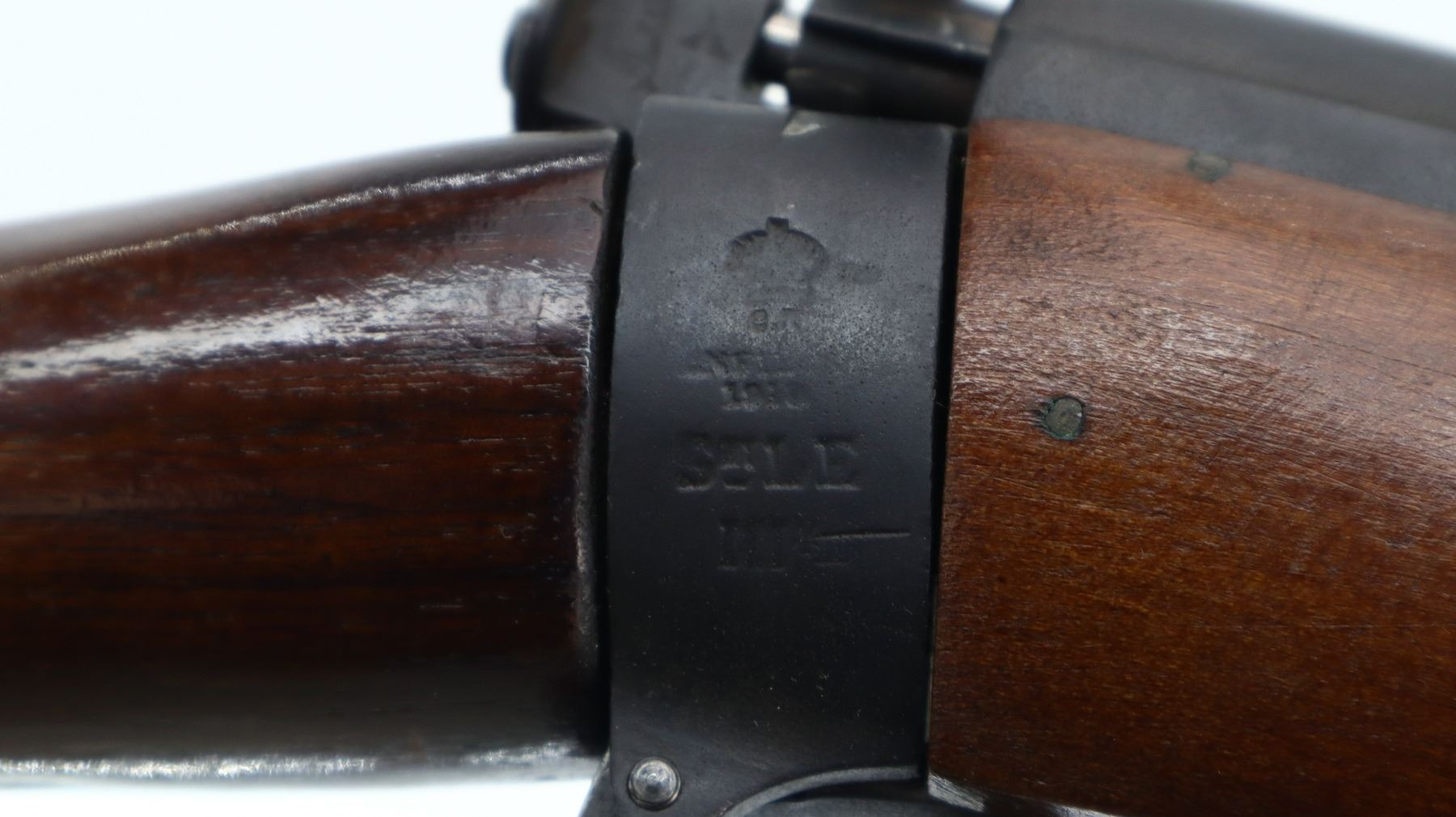 5/10, LEE ENFIELD, MODEL: NO1 MKIII SPORTER, CALIBER:303 BR, DOES NOT COME WITH MAGAZINE, BORE IS FAIR, WORN. MANUFACTURED BY ENFIELD, 1918, BOLT NUMBERED TO MATCH. BLADE FRONT SIGHT WITH RAMP, ADJUSTABLE U NOTCHED REAR SIGHT. THREE PIECE SPORTERIZED WOOD STOCKS, STOCK IS LOOSE, BRASS BUTT PLATE WITH TRAP, SLING SWIVELS. METAL FINISH SHOWS SCRATCHES, HANDLING MARKS AND WEAR. STOCKS SHOW MARKS, SCRATCHES AND FINISH WEAR., ACTION: BOLT ACTION RIFLE, BARREL LENGTH: 25", SERIAL # D1235, CONDITION: 5/10, CLASS: CANADIAN NON RESTRICTED