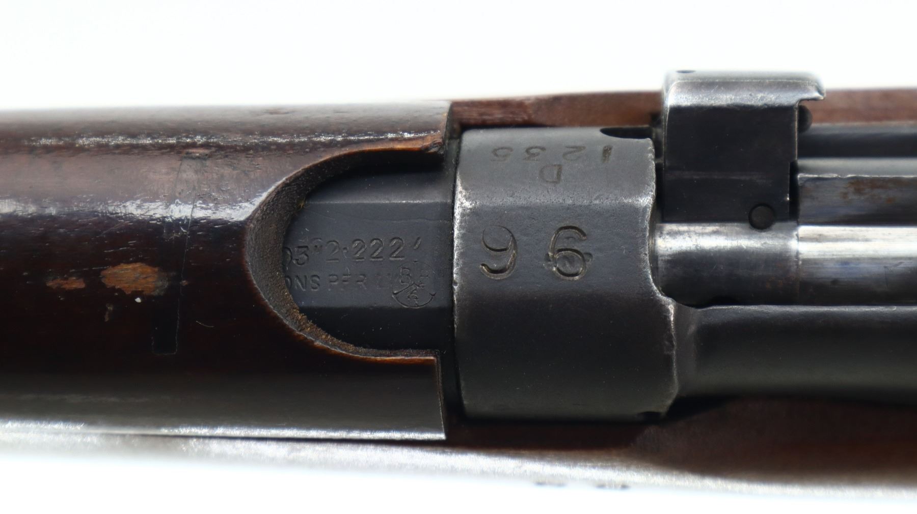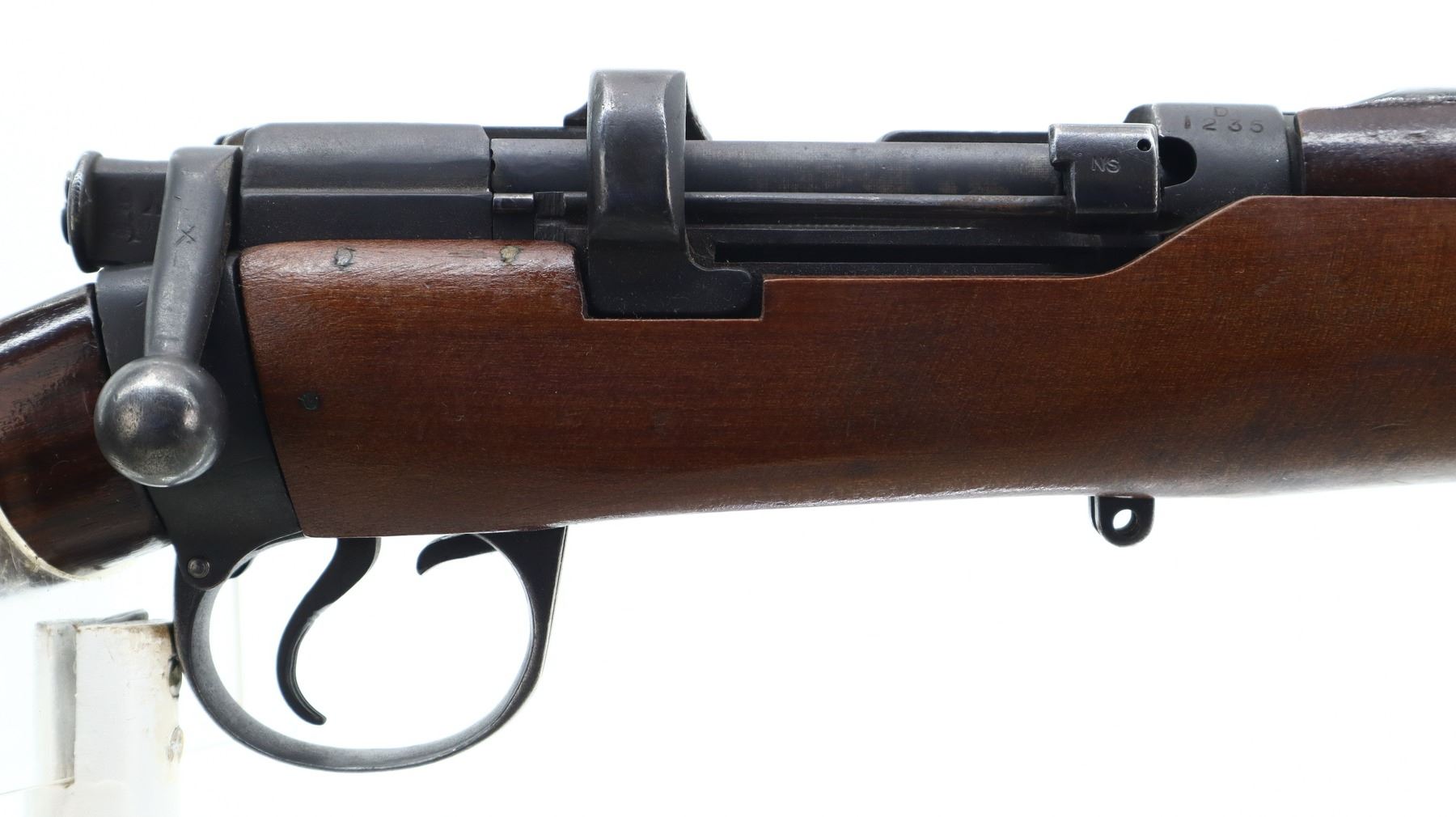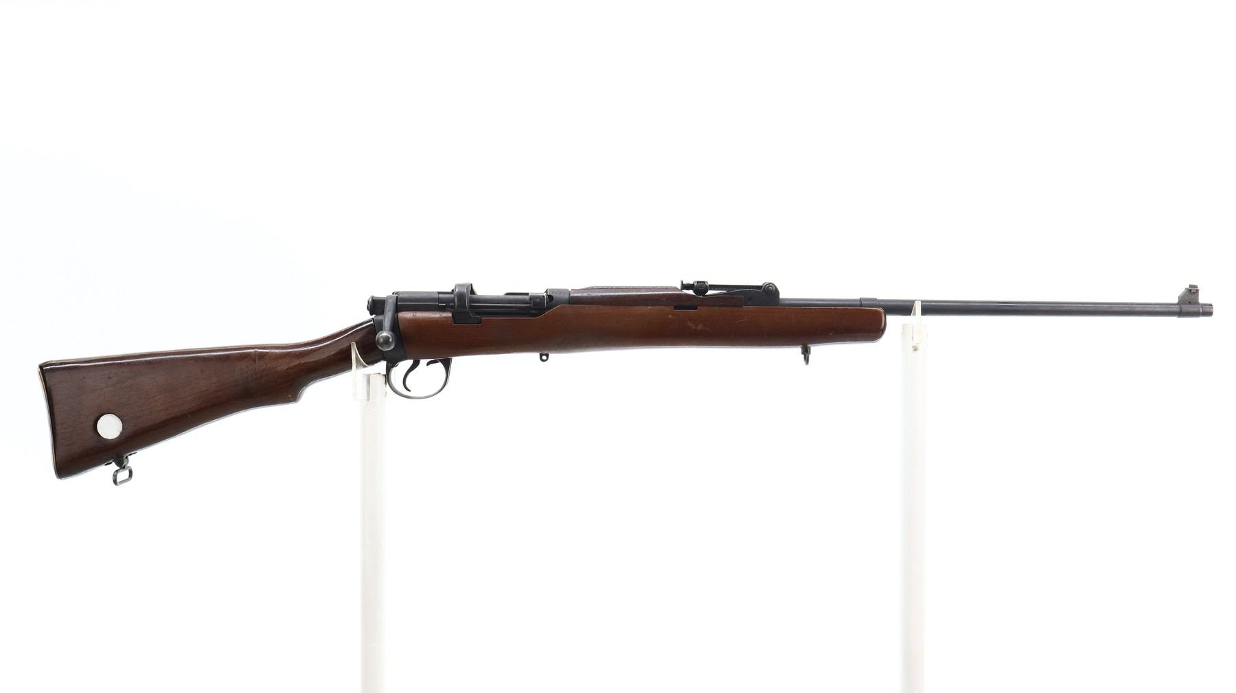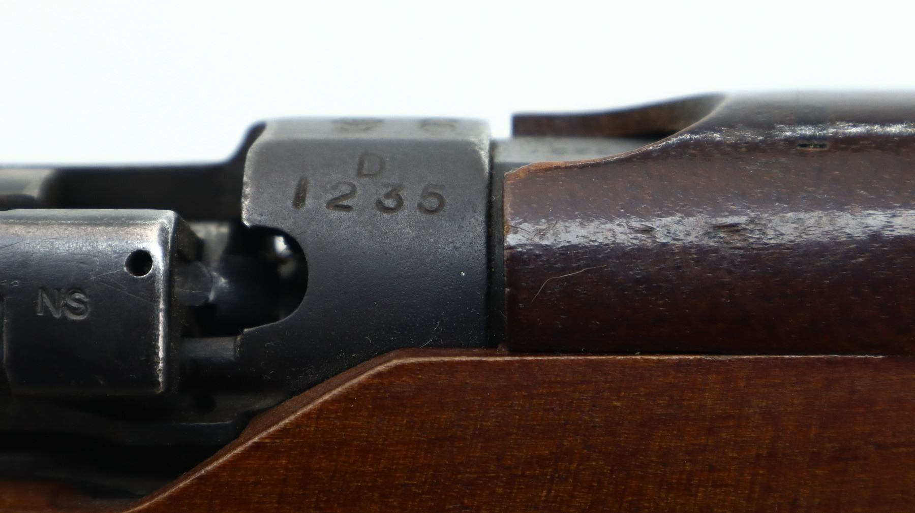 5/10, LEE ENFIELD, MODEL: NO1 MKIII SPORTER, CALIBER:303 BR, DOES NOT COME WITH MAGAZINE, BORE IS FAIR, WORN. MANUFACTURED BY ENFIELD, 1918, BOLT NUMBERED TO MATCH. BLADE FRONT SIGHT WITH RAMP, ADJUSTABLE U NOTCHED REAR SIGHT. THREE PIECE SPORTERIZED WOOD STOCKS, STOCK IS LOOSE, BRASS BUTT PLATE WITH TRAP, SLING SWIVELS. METAL FINISH SHOWS SCRATCHES, HANDLING MARKS AND WEAR. STOCKS SHOW MARKS, SCRATCHES AND FINISH WEAR., ACTION: BOLT ACTION RIFLE, BARREL LENGTH: 25", SERIAL # D1235, CONDITION: 5/10, CLASS: CANADIAN NON RESTRICTED