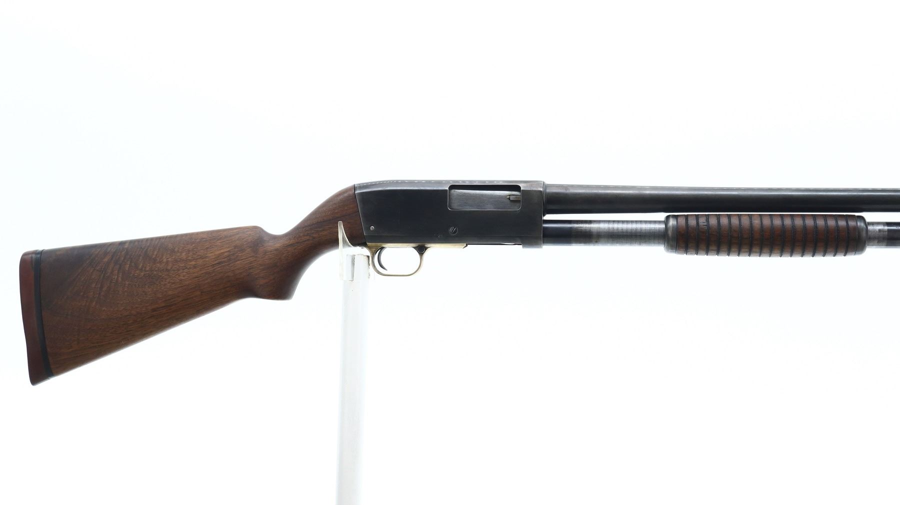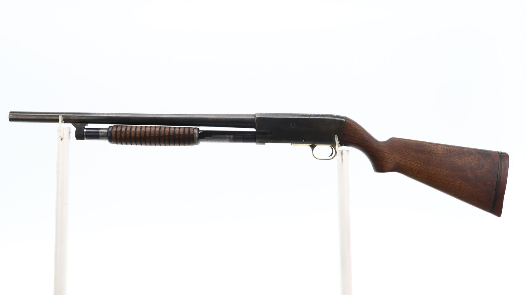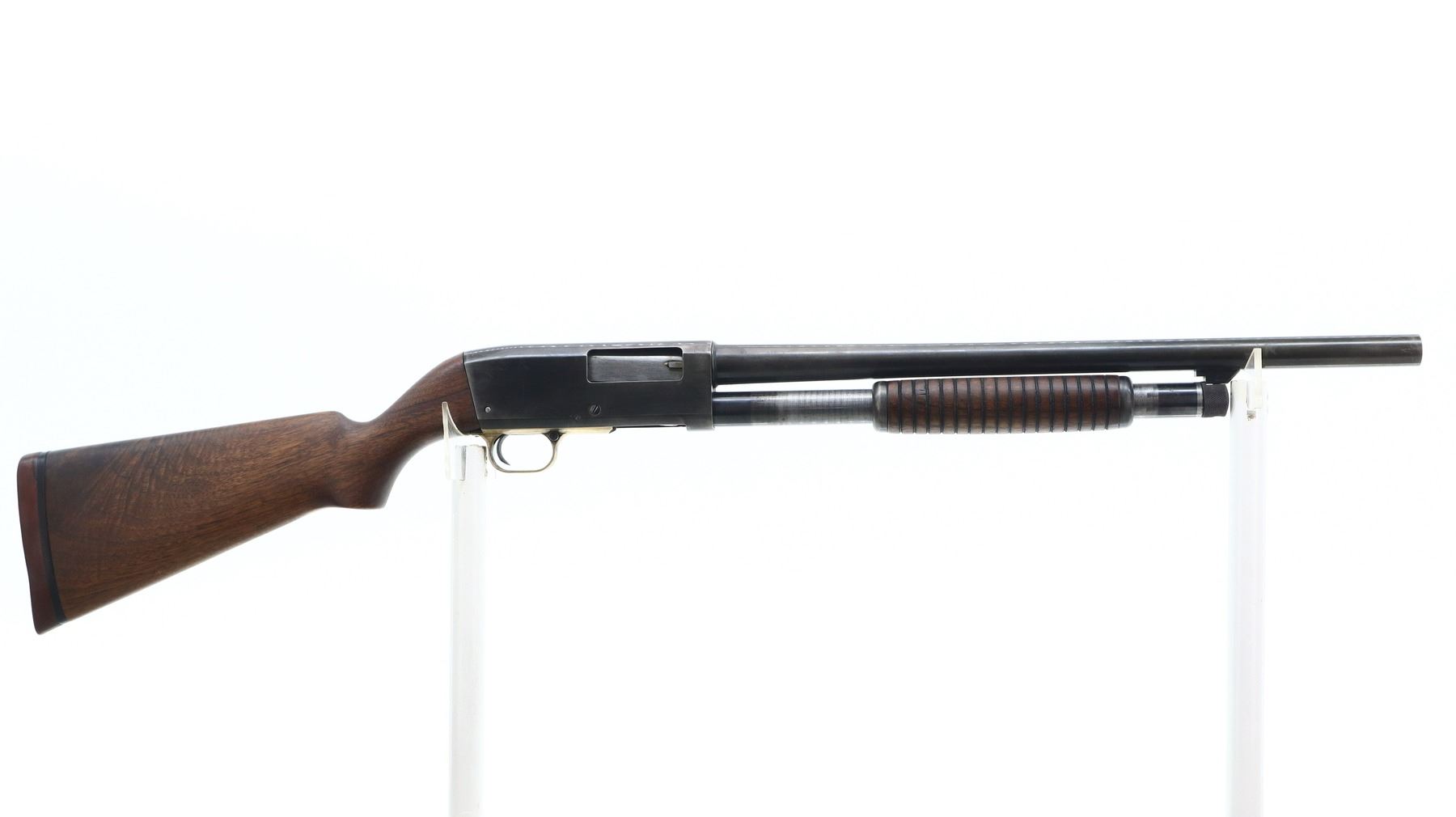 3/10, NOBLE, MODEL: 40, CALIBER:12 G X 2 3/4", BORE IS VERY GOOD. FIXED IC CHOKE. SHORTENED ROUND BARREL, NO BEAD. BRASS TRIGGER GUARD. TWO PIECE WOOD STOCKS, GROOVED FOREARM, PISTOL GRIP, CRACKED AND REPAIRED BEHIND RECEIVER, RED RUBBER RECOIL PAD. METAL FINISH SHOWS LIGHT RUST SPOTS, SCRATCHES, HANDLING MARKS AND WEAR. STOCKS SHOW MARKS, SCRATCHES AND WEAR., ACTION: PUMP ACTION SHOTGUN, BARREL LENGTH: 19.75", SERIAL # NA, CONDITION: 3/10, CLASS: CANADIAN NON RESTRICTED