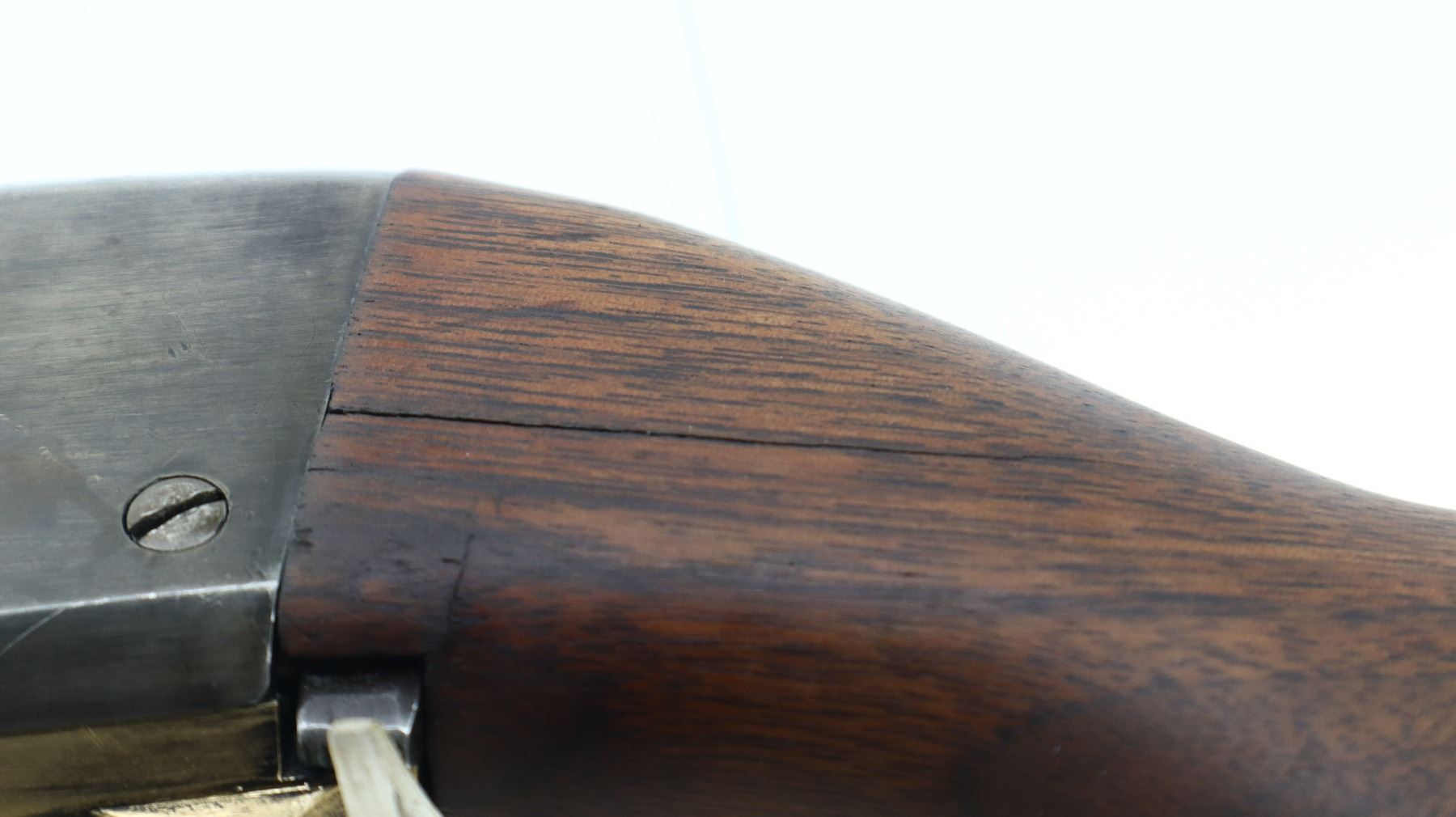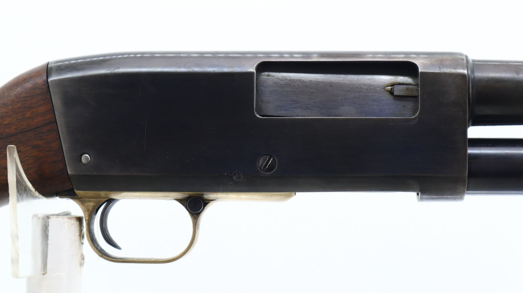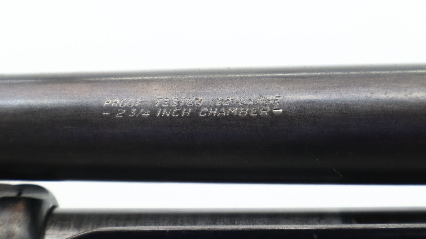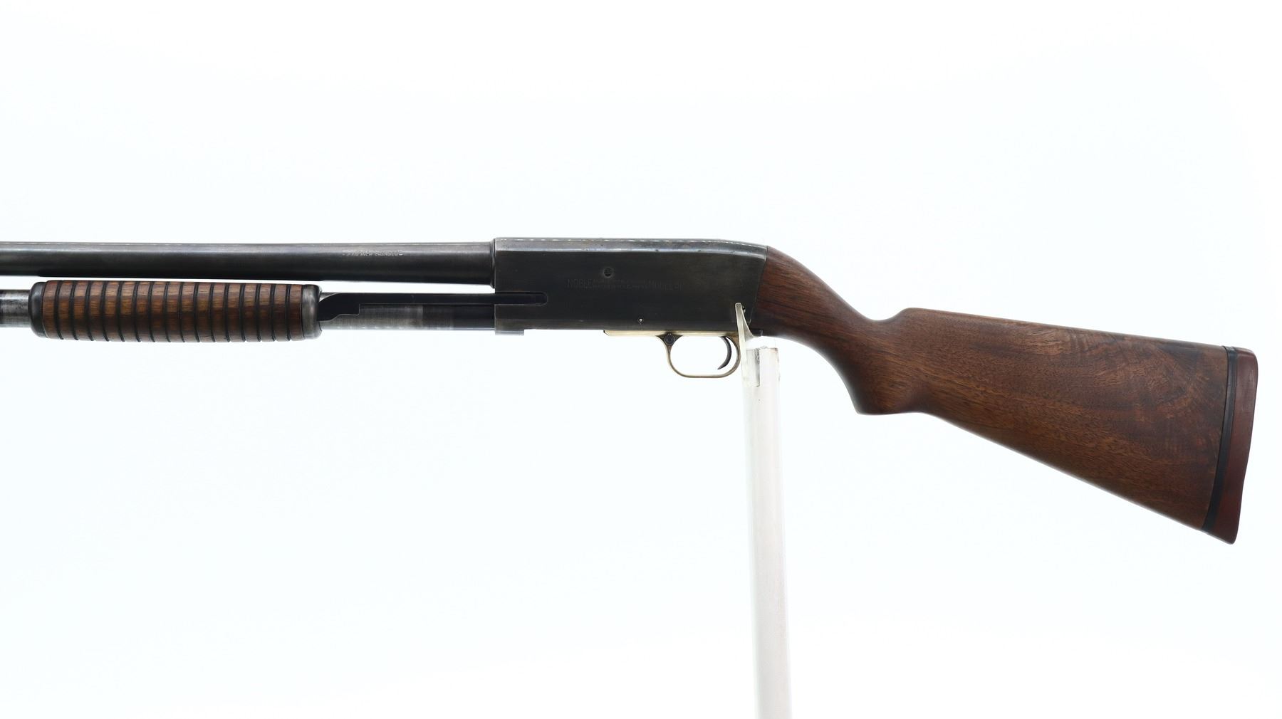 3/10, NOBLE, MODEL: 40, CALIBER:12 G X 2 3/4", BORE IS VERY GOOD. FIXED IC CHOKE. SHORTENED ROUND BARREL, NO BEAD. BRASS TRIGGER GUARD. TWO PIECE WOOD STOCKS, GROOVED FOREARM, PISTOL GRIP, CRACKED AND REPAIRED BEHIND RECEIVER, RED RUBBER RECOIL PAD. METAL FINISH SHOWS LIGHT RUST SPOTS, SCRATCHES, HANDLING MARKS AND WEAR. STOCKS SHOW MARKS, SCRATCHES AND WEAR., ACTION: PUMP ACTION SHOTGUN, BARREL LENGTH: 19.75", SERIAL # NA, CONDITION: 3/10, CLASS: CANADIAN NON RESTRICTED