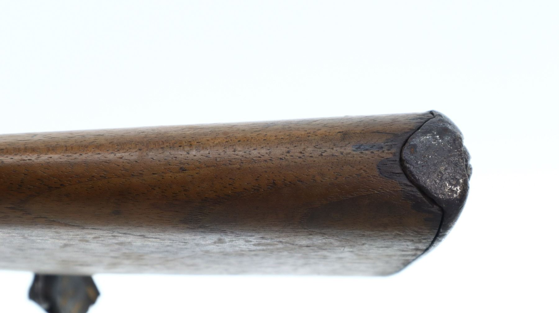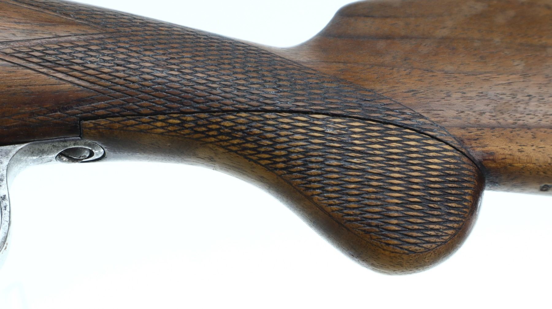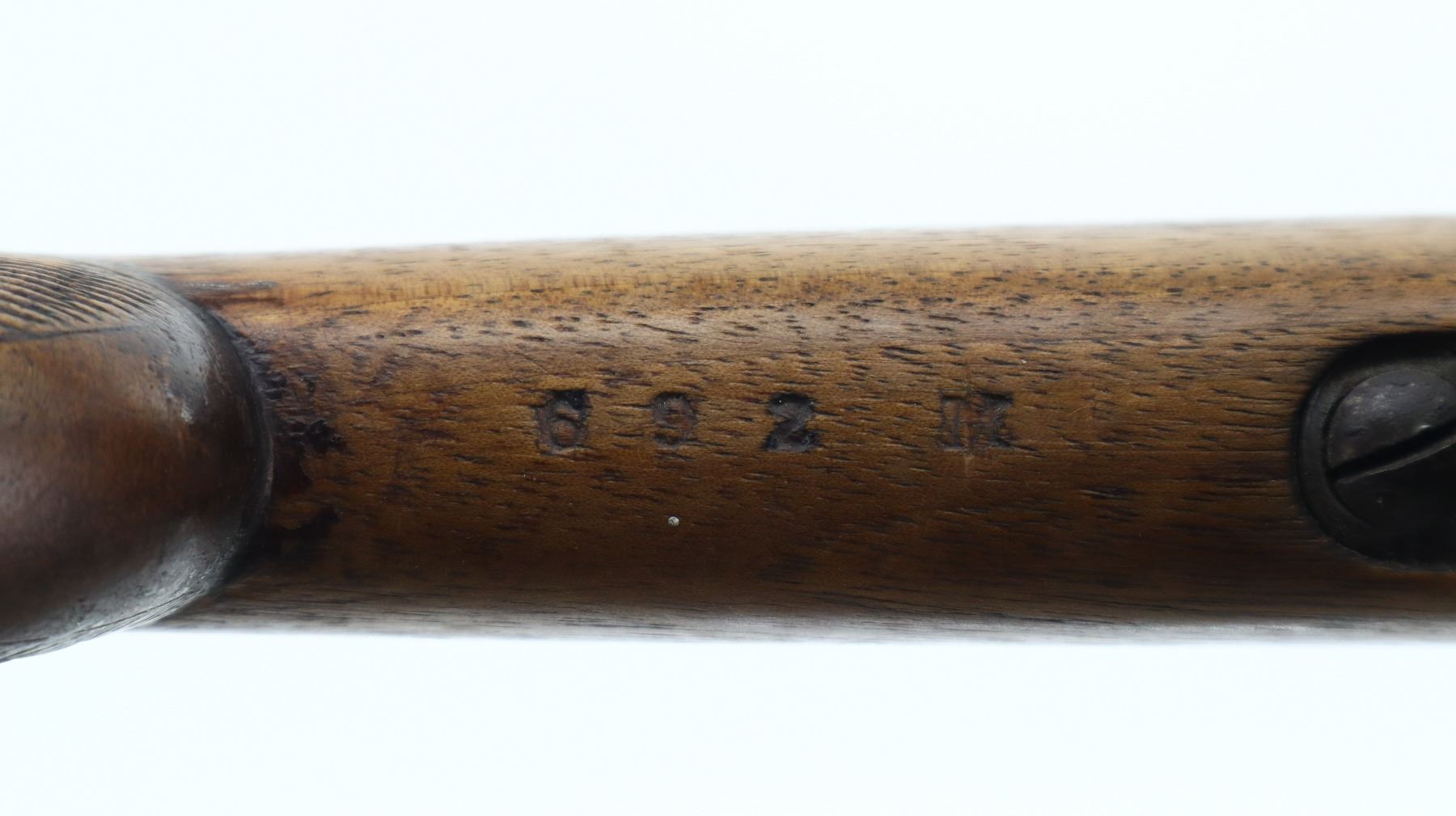 4/10, ITALIAN CARCANO, MODEL: EATON'S SPORTER, CALIBER:6.5X54, BORE IS FAIR, WORN. BLADE FRONT SIGHT, ADJUSTABLE U NOTCHED REAR SIGHT, TURNED DOWN BOLT HANDLE. ONE PIECE WOOD STOCK, CHECKERED PISTOL GRIP WITH EXTENSION, SMOOTH STEEL BUTT PLATE, DOUBLE SET TRIGGERS, SLING SWIVELS. METAL FINISH TURNING BROWN WITH PITTING, LIGHT RUST SPECKLES, HANDLING MARKS AND WEAR. STOCKS SHOW MARKS, SCRATCHES AND WEAR., ACTION: BOLT ACTION RIFLE, BARREL LENGTH: 20", SERIAL # 692, CONDITION: 4/10, CLASS: CANADIAN NON RESTRICTED