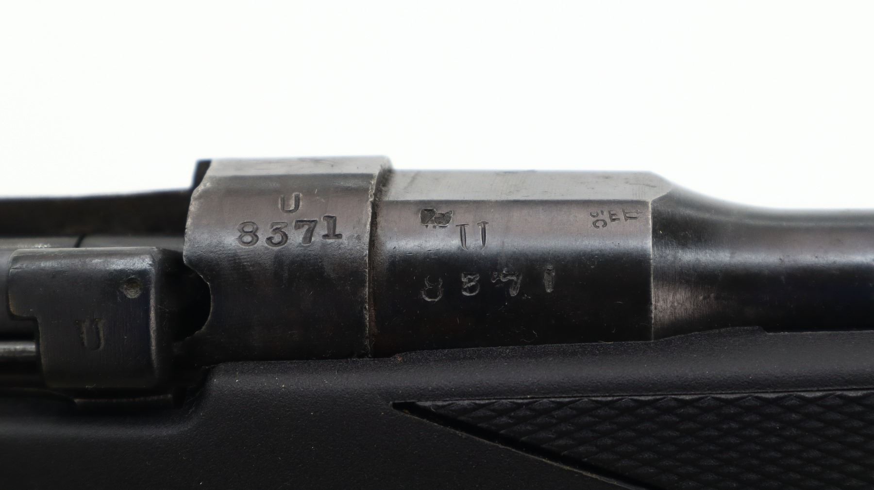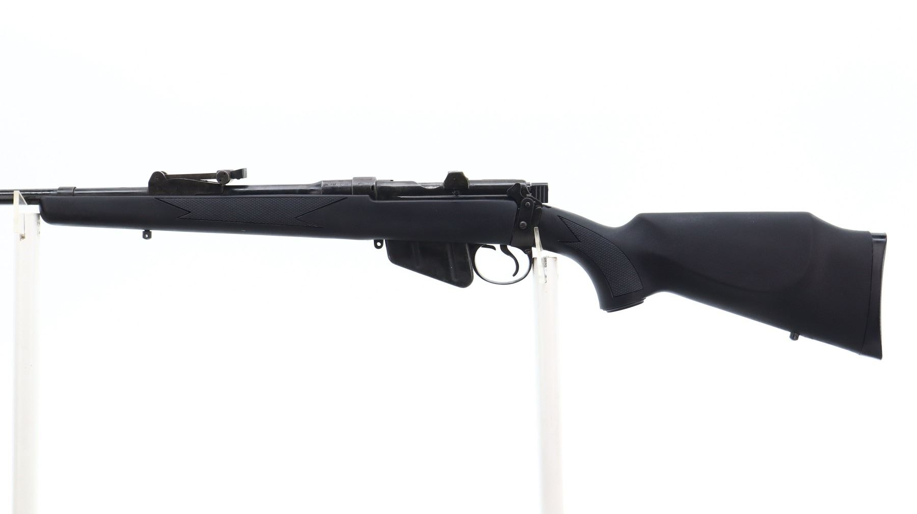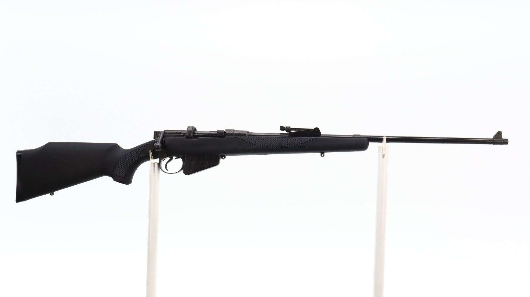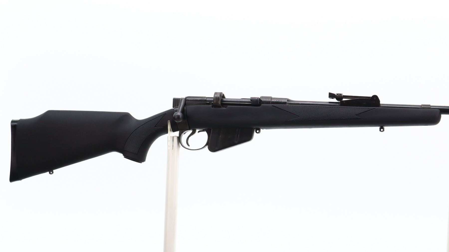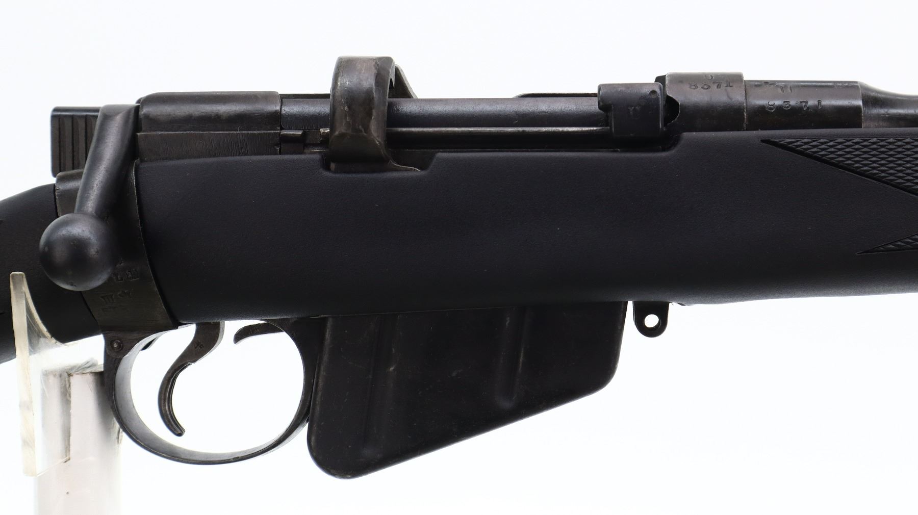 5/10, LEE ENFIELD, MODEL: NO1 MKIII* SPORTER, CALIBER:303 BR, COMES WITH MAGAZINE, BORE IS FAIR, WORN, LIGHT PITTING. BRITISH MANUFACTURE, 1944, BOLT UN-NUMBERED. BLADE FRONT SIGHT WITH RAMP, ADJUSTABLE U NOTCHED REAR SIGHT, METAL HAS BEEN POLISHED AND REBLUED, SAFETY MISSING WASHER. TWO PIECE BLACK SYNTHETIC MONTE CARLO STOCKS, CHECKERED FOREARM AND PISTOL GRIP, CHEEK REST, CHECKERED BLACK POLYMER BUTT PLATE, GRIP CAP, SWIVEL STUDS. METAL FINISH SHOWS SOME LIGHT PITTED SPOTS, SCRATCHES, HANDLING MARKS AND WEAR. STOCKS SHOW SOME MARKS, SCRATCHES ADN WEAR., ACTION: BOLT ACTION RIFLE, BARREL LENGTH: 25.25", SERIAL # U8371, CONDITION: 5/10, CLASS: CANADIAN NON RESTRICTED