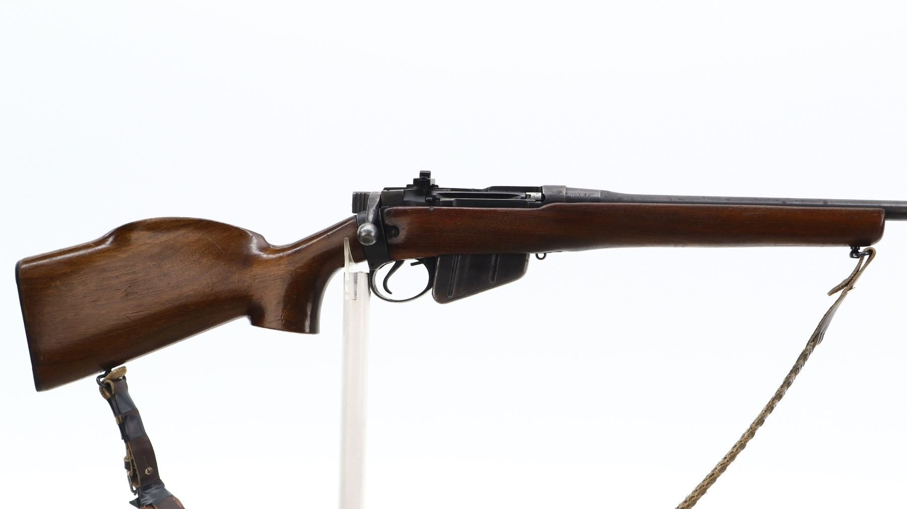 5/10, LEE ENFIELD, MODEL: NO4 MKI SPORTER, CALIBER:303 BR, COMES WITH MAGAZINE, BORE IS GOOD. BRITISH MANUFACTURE, BOLT MISMATCHED. BLADE FRONT SIGHT WITH RAMP, STRIPPER CLIP GUIDE REMOVED, RECEIVER DRILLED AND TAPPED WITH ADJUSTABLE WILLIAMS PEEP SIGHT INSTALLED. TWO PIECE SPORTERIZED WOOD STOCKS, PISTOL GRIP, CHEEK REST, GROOVED BLACK POLYMER BUTT PLATE, SLING SWIVELS WITH BROWN LEATHER SLING. METAL FINISH SHOWS LIGHT RUST SPECKLES, SCRATCHES, HANDLING MARKS AND WEAR. STOCKS SHOW MARKS, SCRATCHES AND WEAR. , ACTION: BOLT ACTION RIFLE, BARREL LENGTH: 22.5", SERIAL # DC29137A, CONDITION: 5/10, CLASS: CANADIAN NON RESTRICTED