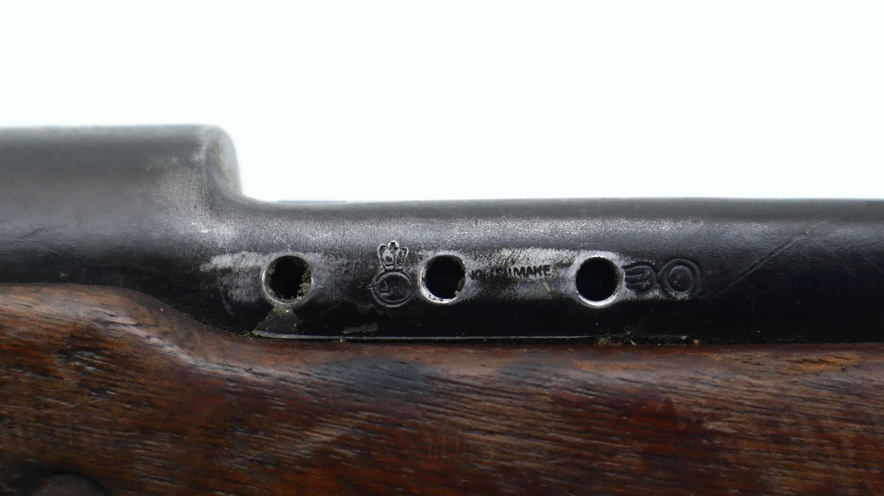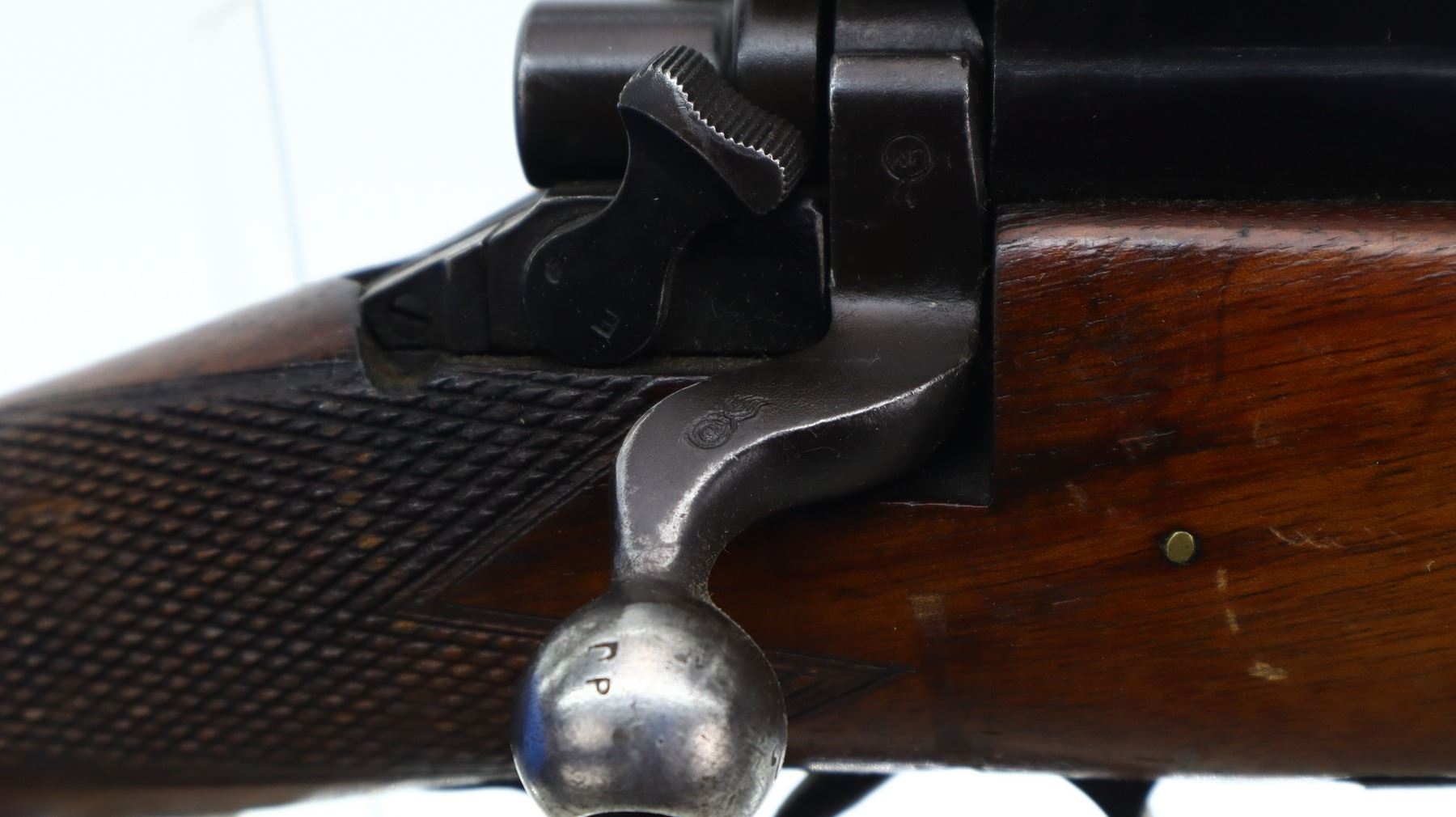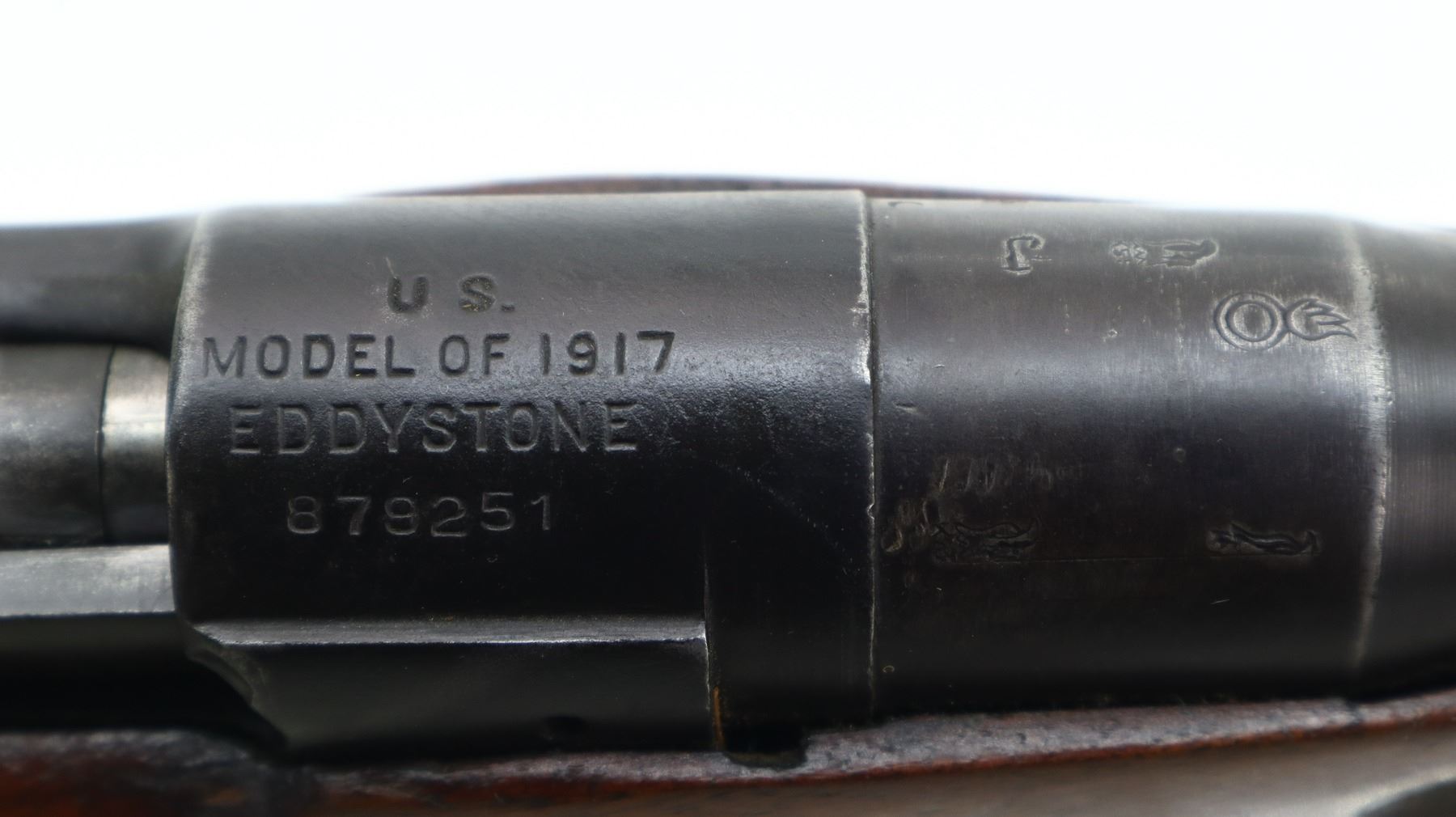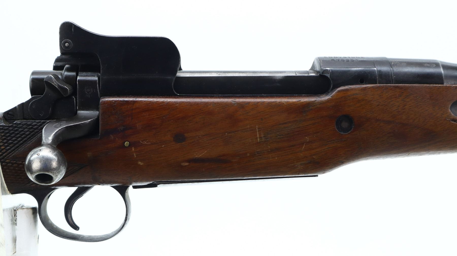 4/10, US ENFIELD, MODEL: 1917 SPORTER, CALIBER:30-06 SPRG, BORE IS FAIR, WORN, PITTED. MANUFACTURED BY EDDY STONE, BOLT MISMATCHED. BLADE FRONT SIGHT WITH EARS AND RAMP, ADJUSTABLE REAR PEEP SIGHT WITH EARS, LEFT SIDE HAS BEEN MODIFIED, LEFT RECEIVER WALL DRILLED AND TAPPED FOR UNKNOW SCOPE MOUNT. ONE PIECE SPORTERIZED WOOD STOCK, CHECKERED FOREARM AND PISTOL GRIP, SMOOTH STEEL BUTT PLATE WITH TRAP, SLING SWIVELS. METAL FINISH SHOWS SCRATCHES, HANDLING MARKS AND WEAR. STOCK SHOWS MARKS, SCRATCHES AND WEAR., ACTION: BOLT ACTION RIFLE, BARREL LENGTH: 26", SERIAL # 879251, CONDITION: 4/10, CLASS: CANADIAN NON RESTRICTED