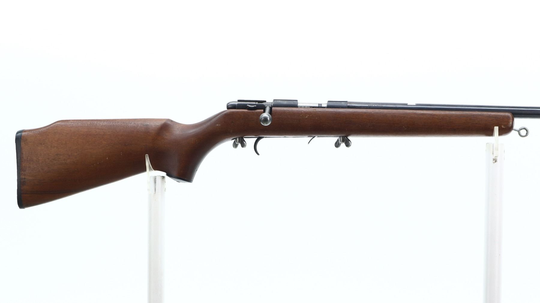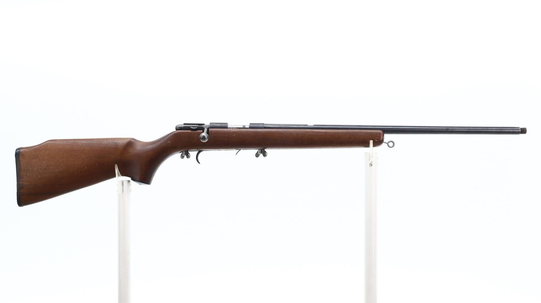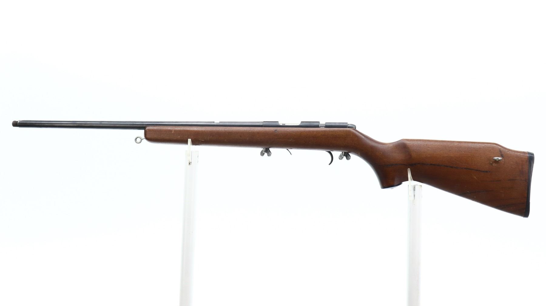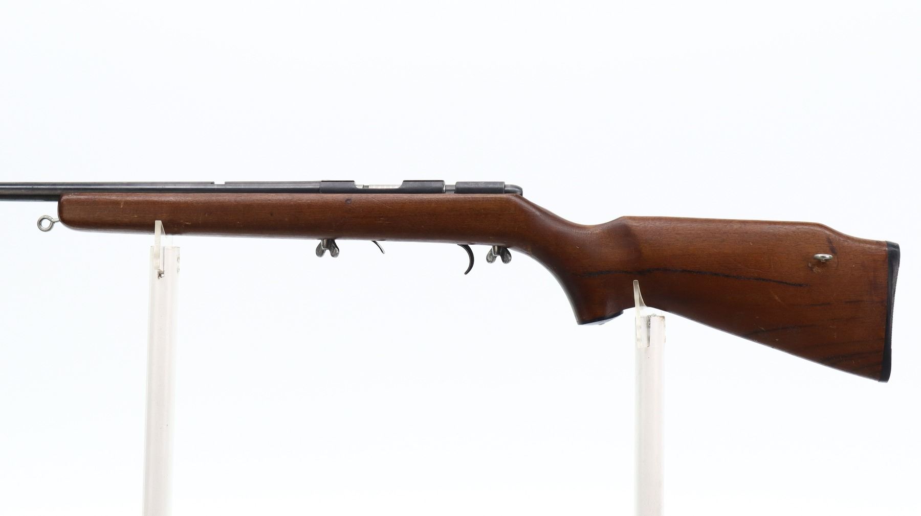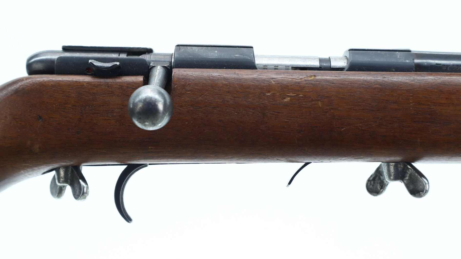 3/10, BRAZILIAN, MODEL: 122, CALIBER:22 LR, DOES NOT COME WITH MAGAZINE, BORE IS VERY GOOD. MISSING FRONT AND REAR SIGHTS, MUZZLE THREADED, RECEIVER GROOVED FOR SCOPE MOUNT. ONE PIECE SMOOTH WOOD STOCK, MISSING TRIGGER GUARD, ACTION SCREWS MODIFIED WITH WING NUTS, PISTOL GRIP, GROOVED BLACK POLYMER BUTT PLATE, GRIP CAP, CUSTOM SWIVEL RINGS. METAL FINISH SHOWS SOME LIGHT RUST SPECKLES, SCRATCHES, HANDLING MARKS AND WEAR. STOCK SHOWS SOME MARKS, SCRATCHES AND WEAR. , ACTION: BOLT ACTION RIFLE, BARREL LENGTH: 20.5", SERIAL # NA, CONDITION: 3/10, CLASS: CANADIAN NON RESTRICTED