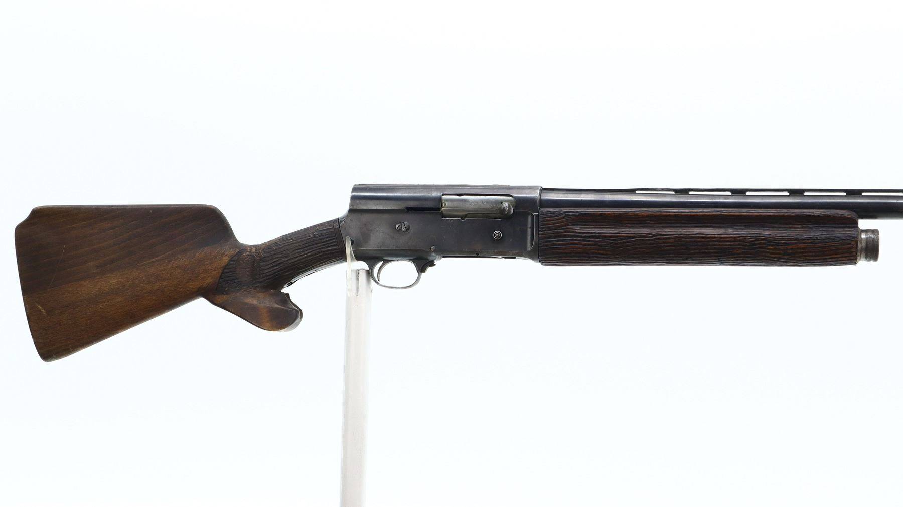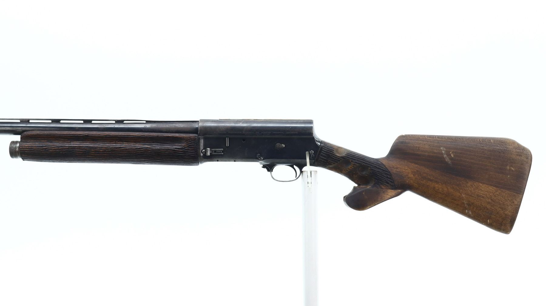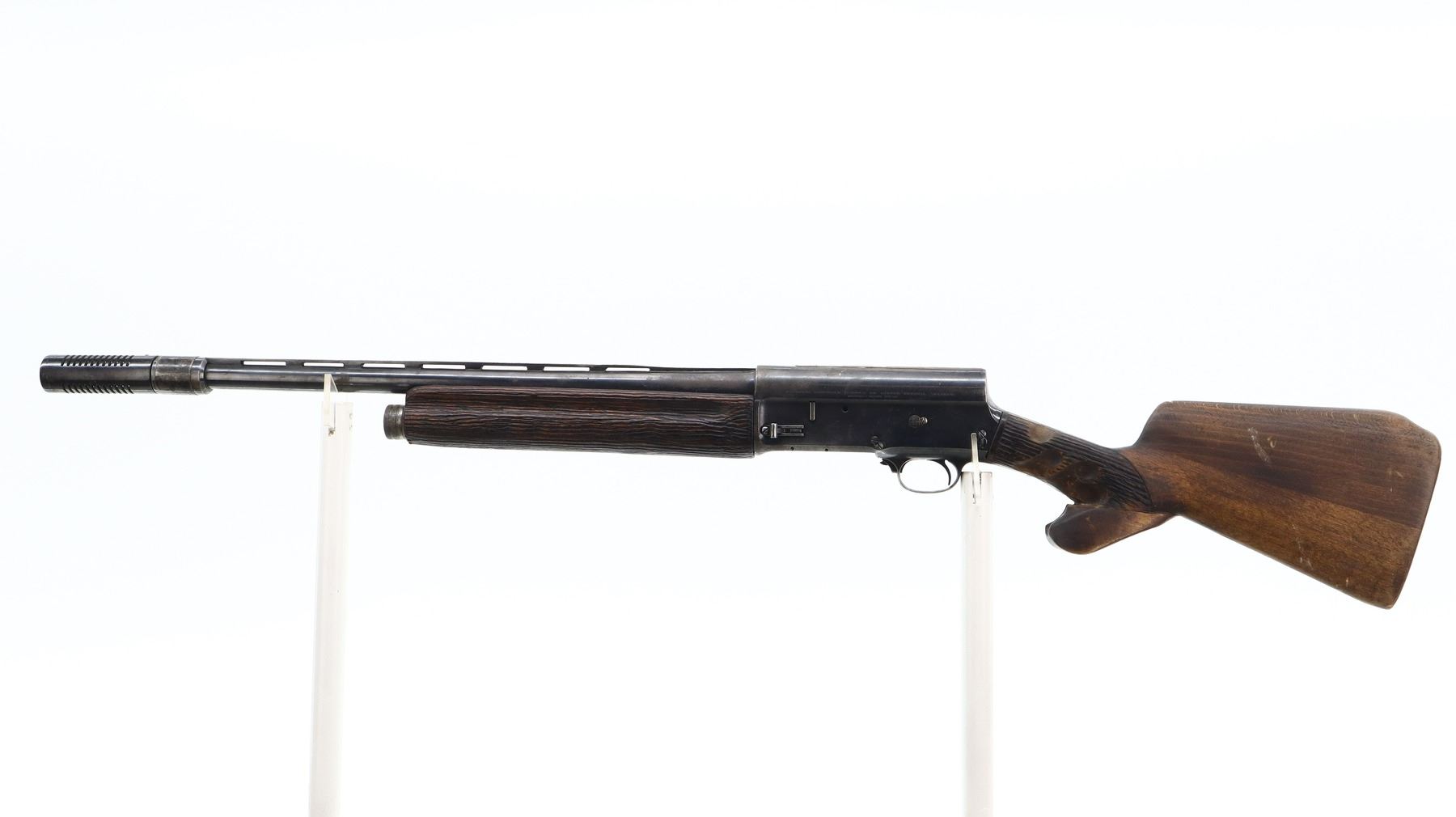 2/10, FN, MODEL: AUTO 5, CALIBER:12 G X 2 3/4", BORE IS FAIR. CUTTS COMPENSATOR AT MUZZLE, NO SIGHTS. VENT RIBBED BARREL WITH MODIFICATIONS AND REPAIRS, RECEIVER DRILLED AND TAPPED WITH SOLDERED/WELLED REMAINING ON TOP. REPLACED TWO PIECE WOOD STOCK, EXTENDED PISTOL GRIP, RAISED CHEEK PIECE, SMOOTH BUTT, STOCKS SHOW MODIFICATIONS AND TEXTURING. METAL FINISH SHOWS PITTING, LIGHT RUST, HANDLING MARKS AND WEAR. STOCKS SHOW MARKS, SCRATCHES AND WEAR. , ACTION: SEMI AUTOMATIC SHOTGUN, BARREL LENGTH: 23.75", SERIAL # 64144, CONDITION: 2/10, CLASS: CANADIAN NON RESTRICTED